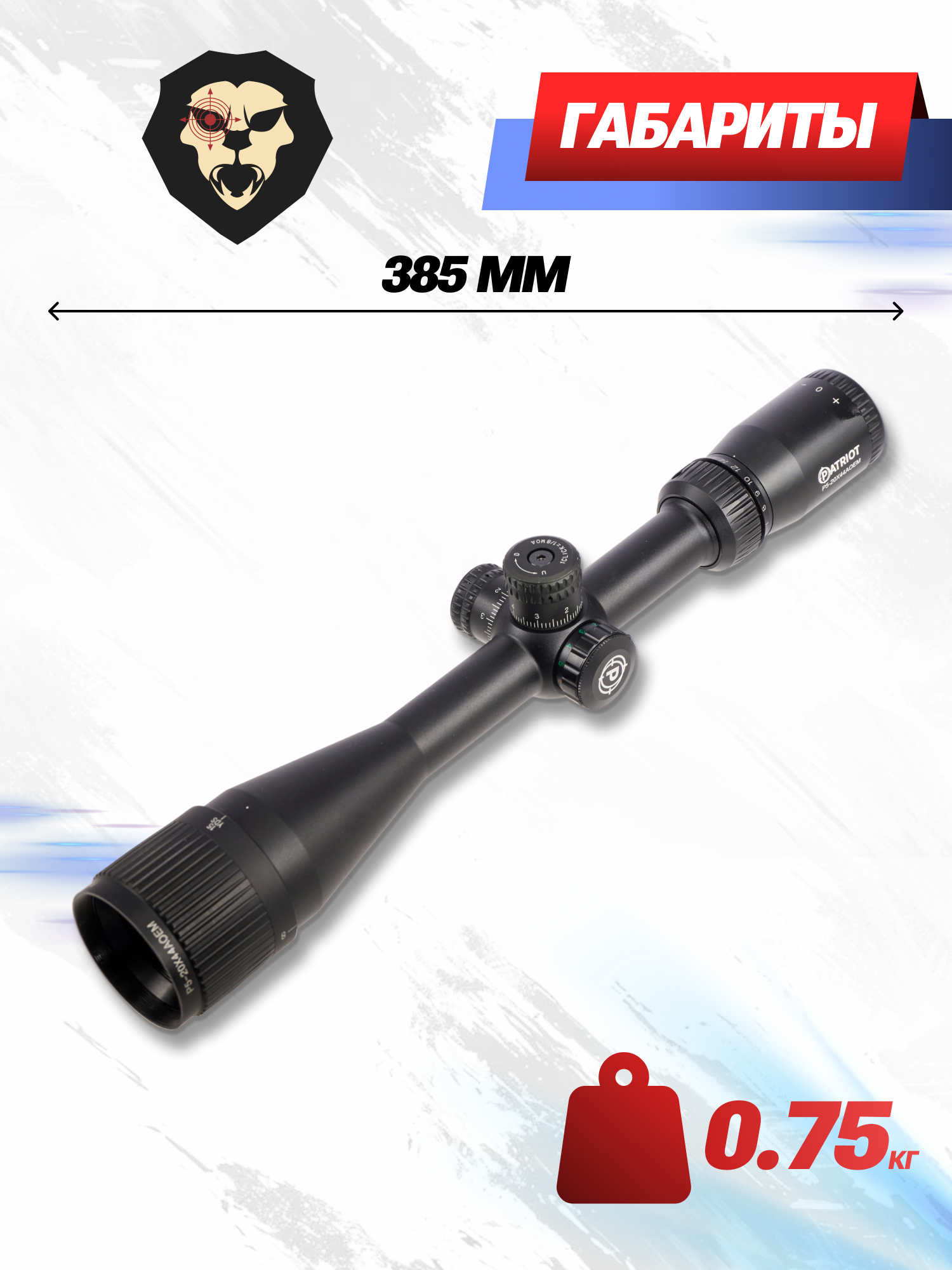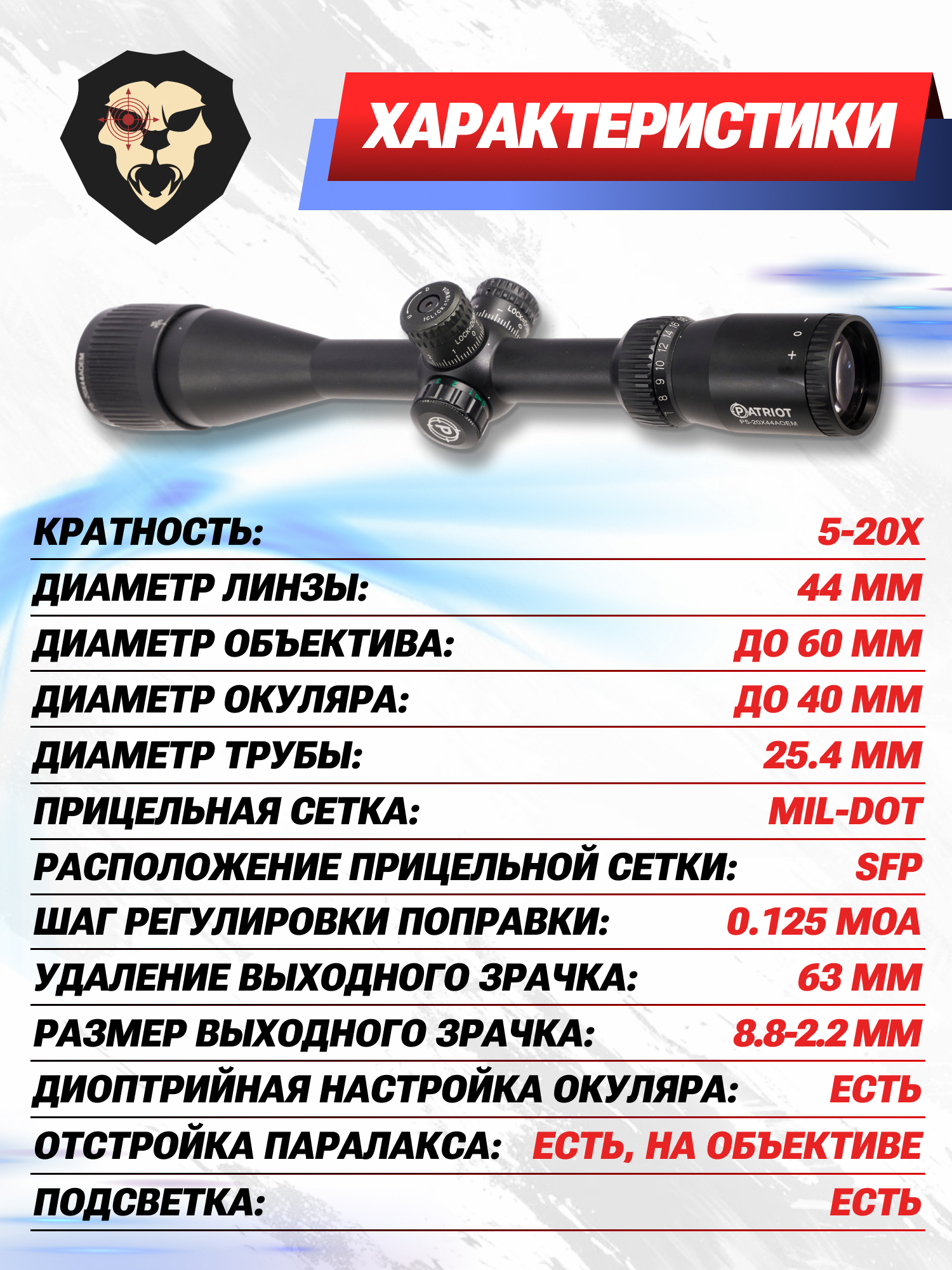 Представленный оптический прицел Patriot P5-20x44 AOEMG относится к этой линейке, его отличительной особенностью является возможность отстройки параллакса. Функция реализована с помощью использования в конструкции регулируемого объектива (Adjustable Objective). Отстройка возможна на расстояния от 10-ти ярдов до бесконечности.