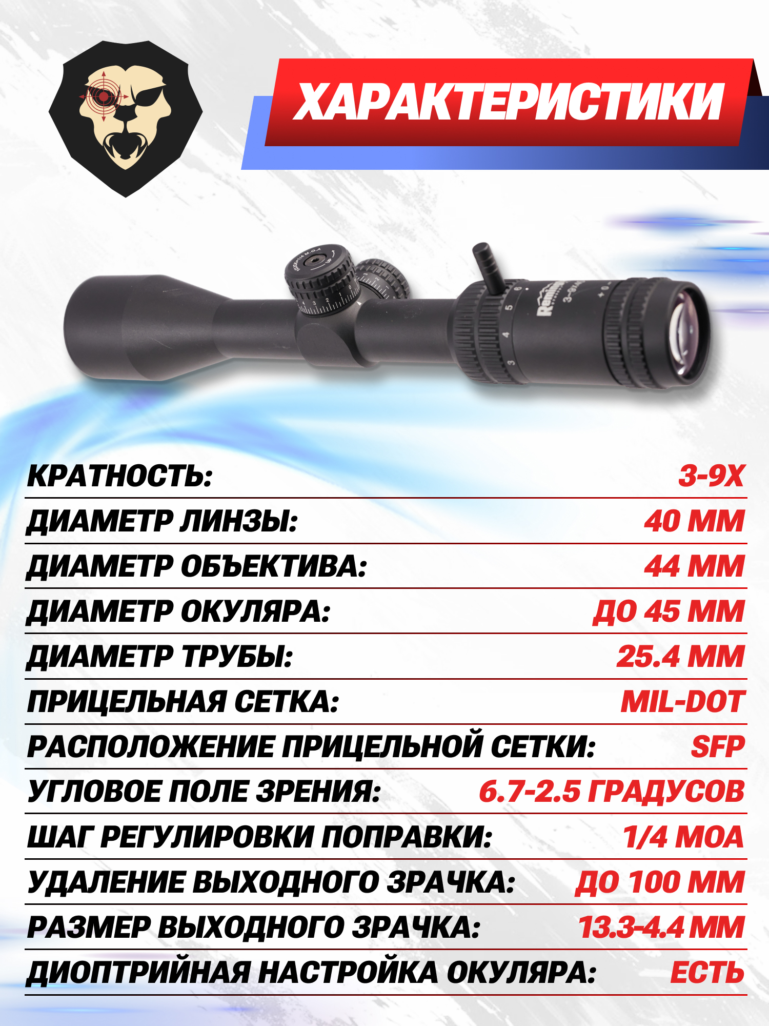 Информация о товаре "Оптический прицел Remington 3-9x40 Fury (25 mm, Mil-Dot, оригинал)" носит ознакомительный характер, и не является публичной офертой, определяемой положениями Статьи 437 Гражданского кодекса Российской Федерации, характеристики, внешний вид, цвет и комплектация могут быть изменены производителем без уведомления.
