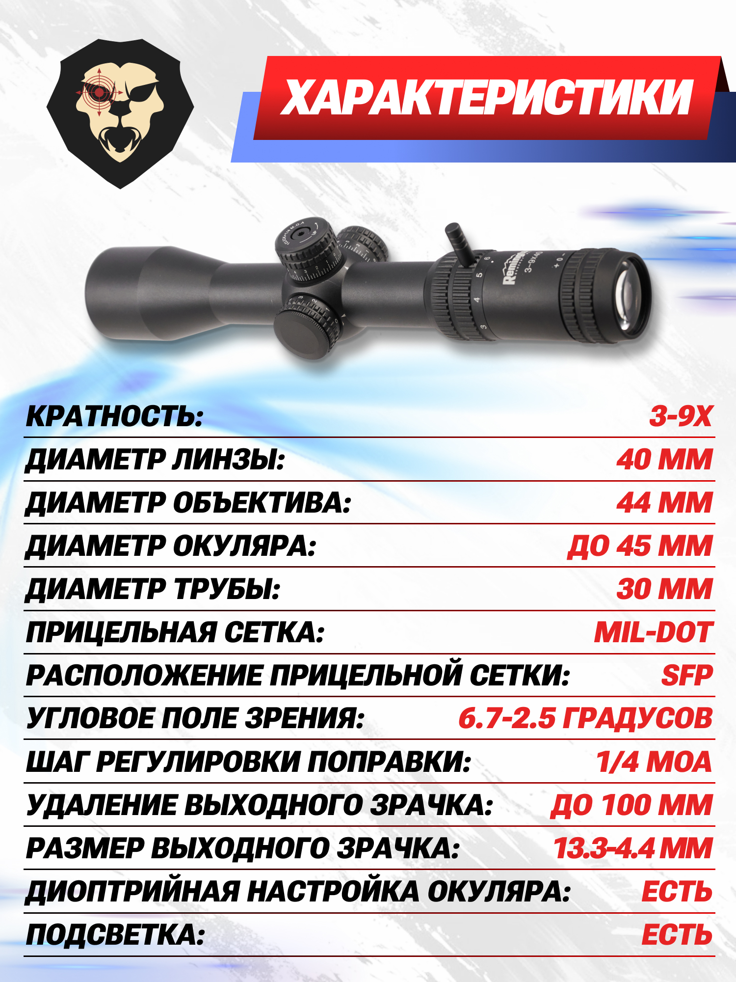 Информация о товаре "Оптический прицел Remington 3-9x40 Fury (30 mm, Mil-Dot, с подсветкой, оригинал)" носит ознакомительный характер, и не является публичной офертой, определяемой положениями Статьи 437 Гражданского кодекса Российской Федерации, характеристики, внешний вид, цвет и комплектация могут быть изменены производителем без уведомления.