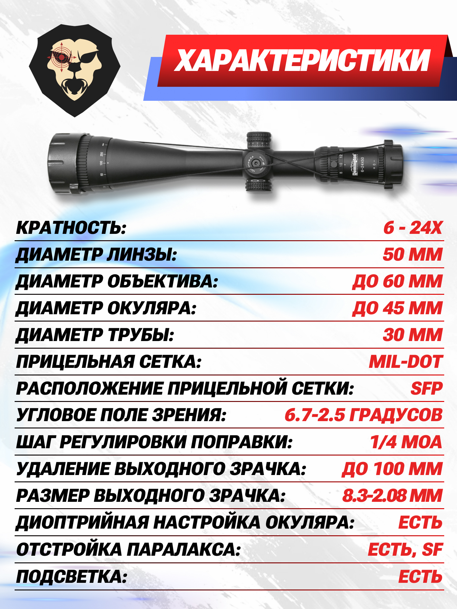 Информация о товаре "Оптический прицел Remington 6-24x50 Fury (30 мм, Mil-Dot)" носит ознакомительный характер, и не является публичной офертой, определяемой положениями Статьи 437 Гражданского кодекса Российской Федерации, характеристики, внешний вид, цвет и комплектация могут быть изменены производителем без уведомления.