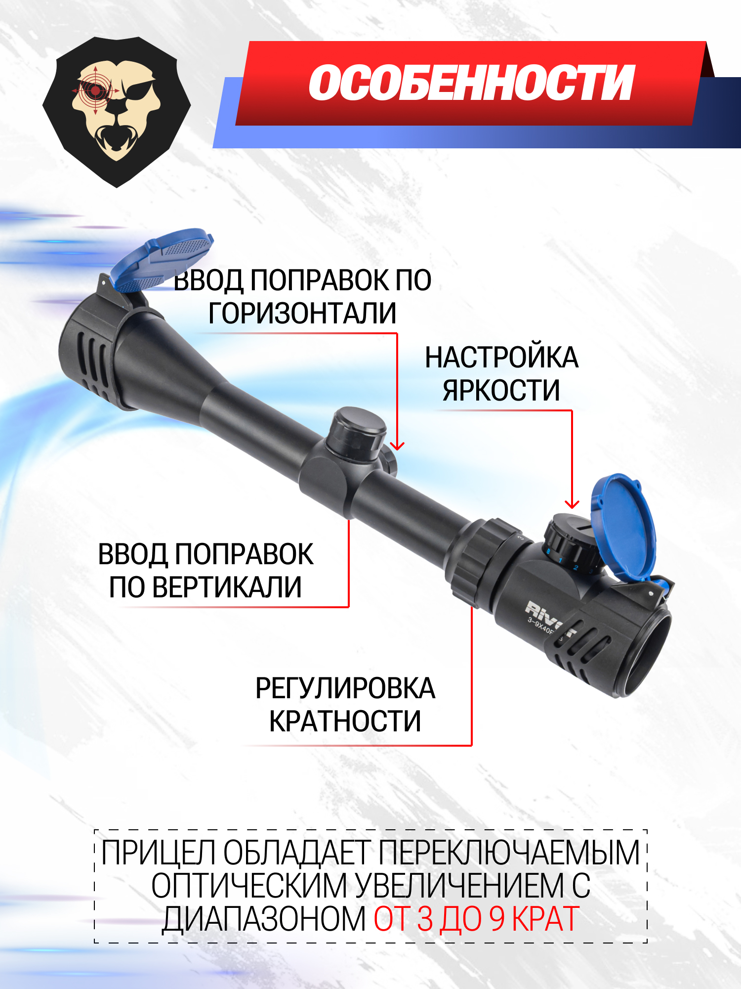 Регулировка кратности осуществляется поворотом кольца перед окулярной частью. Для удобства механизм выделяется наличием цифровых обозначений, а насечки предотвращают скольжение пальцев при намокании или работе в перчатках. Прицел Ривер получил объектив диаметром 40 мм, который способствует широкому полю зрения, при этом система построена с применением линз из стекла с многослойным просветлением.