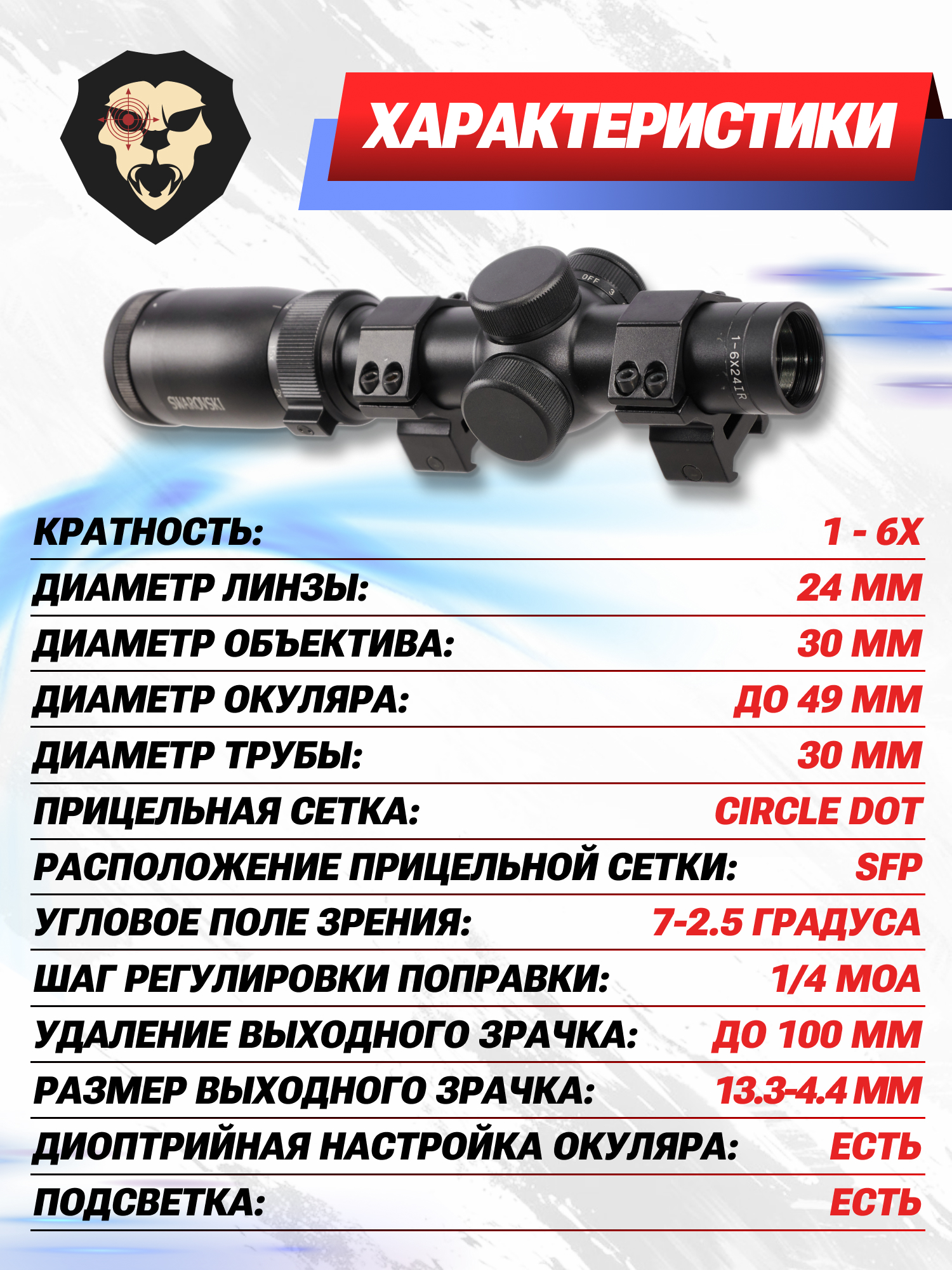 | Диаметр трубы прицела | 30 мм |
