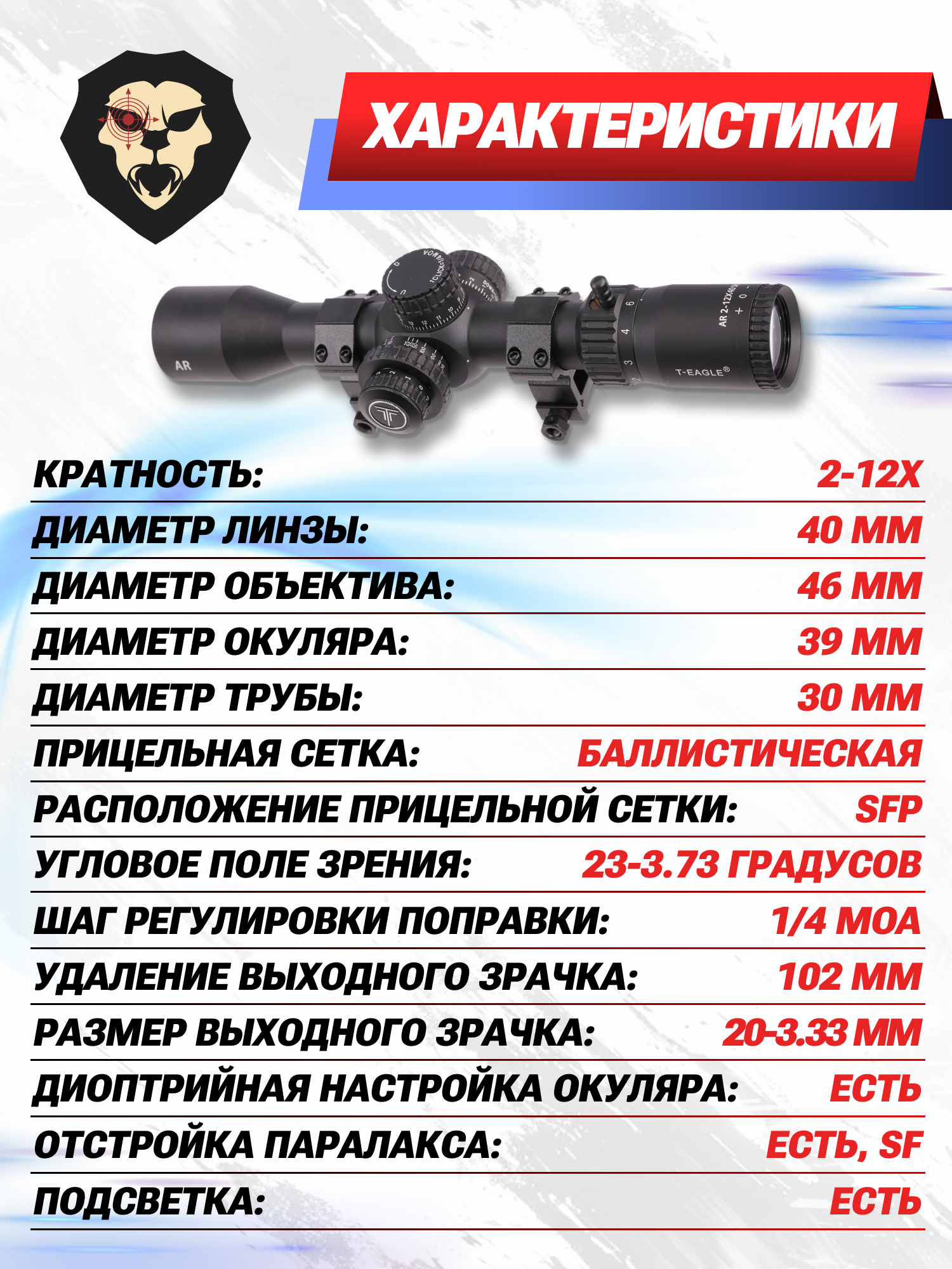 Информация о товаре "Оптический прицел T-Eagle AR 2-12x40 SFIR SFP (30 мм, подсветка)" носит ознакомительный характер, и не является публичной офертой, определяемой положениями Статьи 437 Гражданского кодекса Российской Федерации, характеристики, внешний вид, цвет и комплектация могут быть изменены производителем без уведомления.