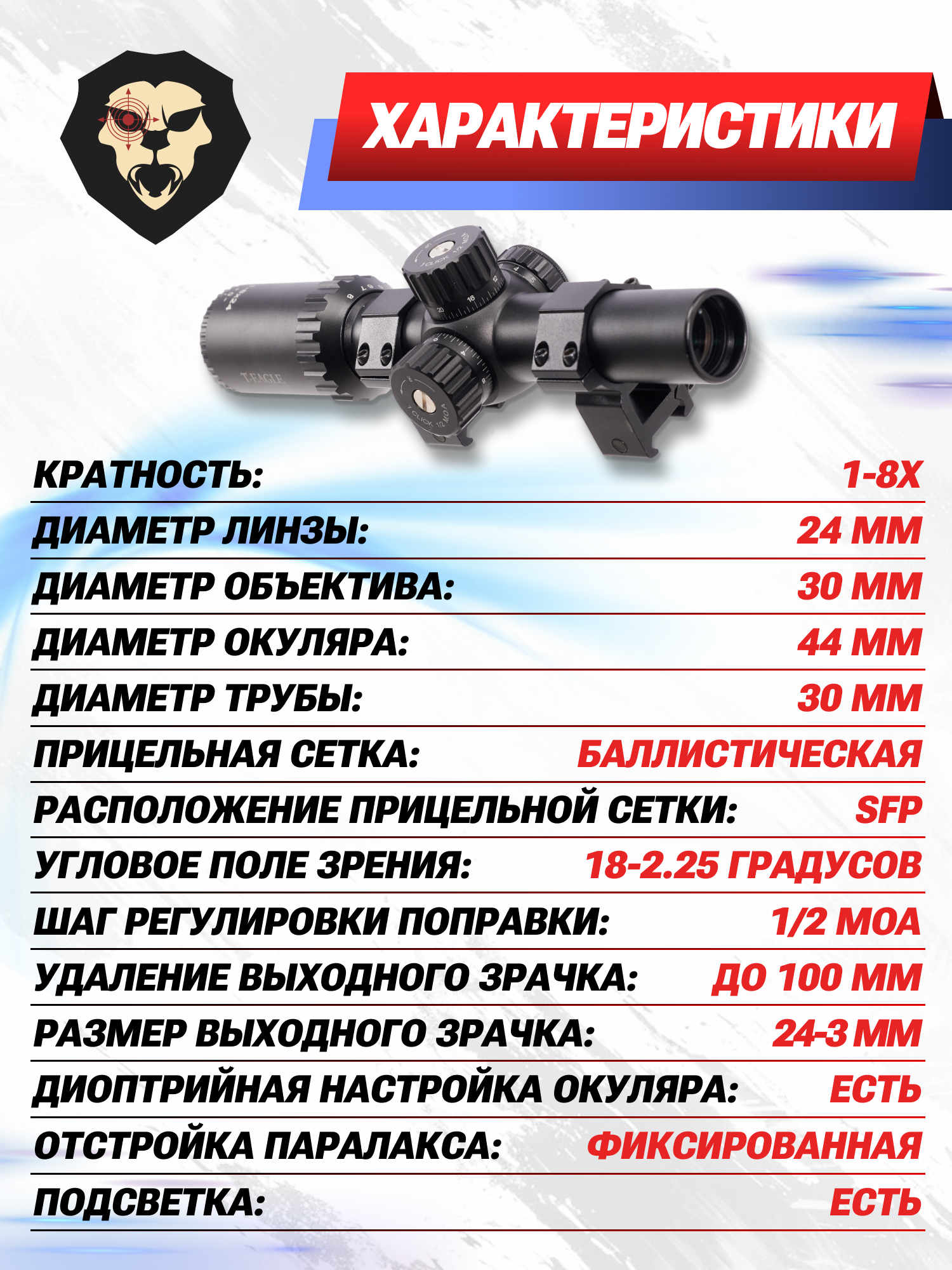 Информация о товаре "Оптический прицел T-Eagle MR 1-8x24 IR-RU SFP (30 мм, подсветка)" носит ознакомительный характер, и не является публичной офертой, определяемой положениями Статьи 437 Гражданского кодекса Российской Федерации, характеристики, внешний вид, цвет и комплектация могут быть изменены производителем без уведомления.