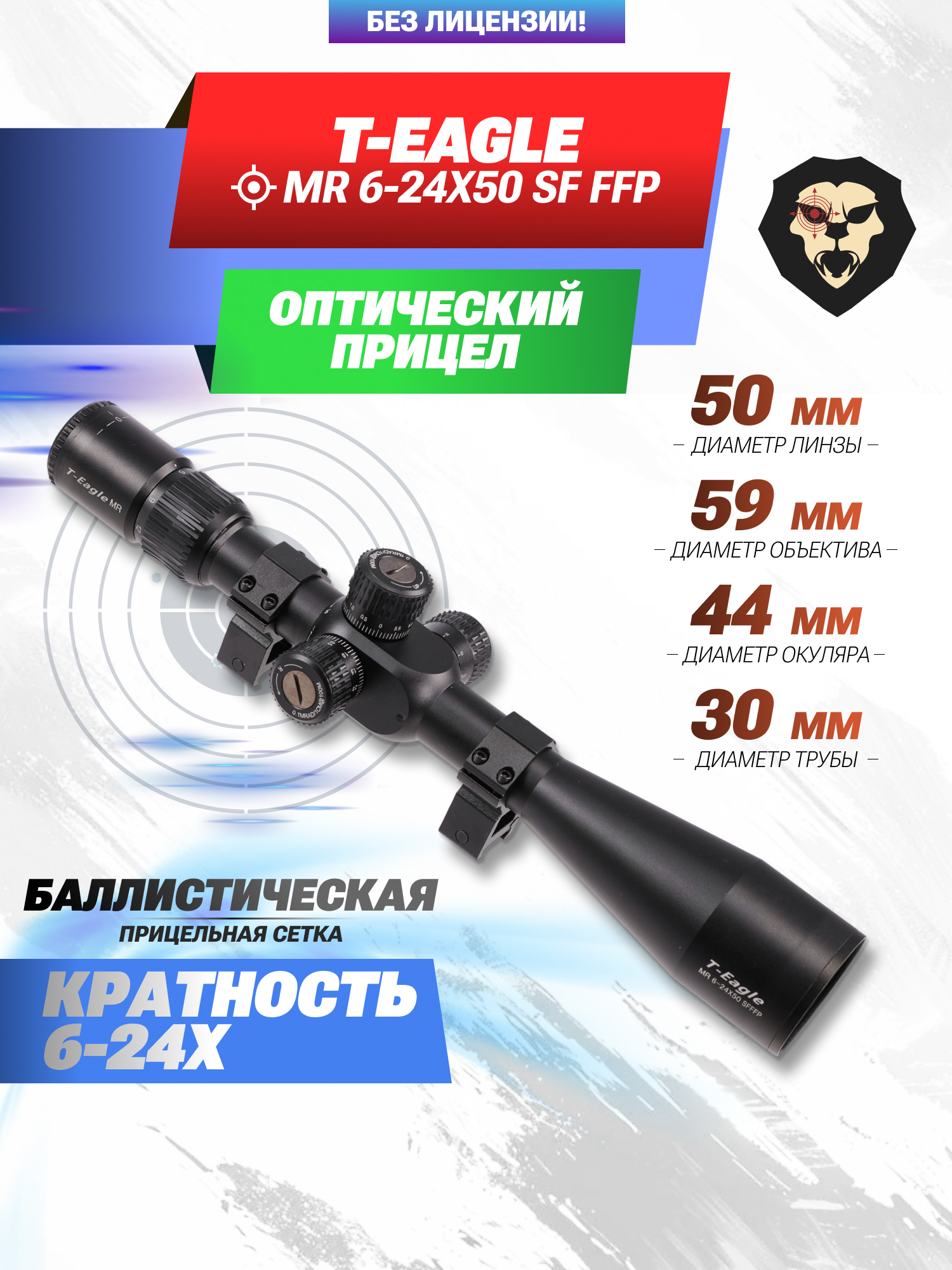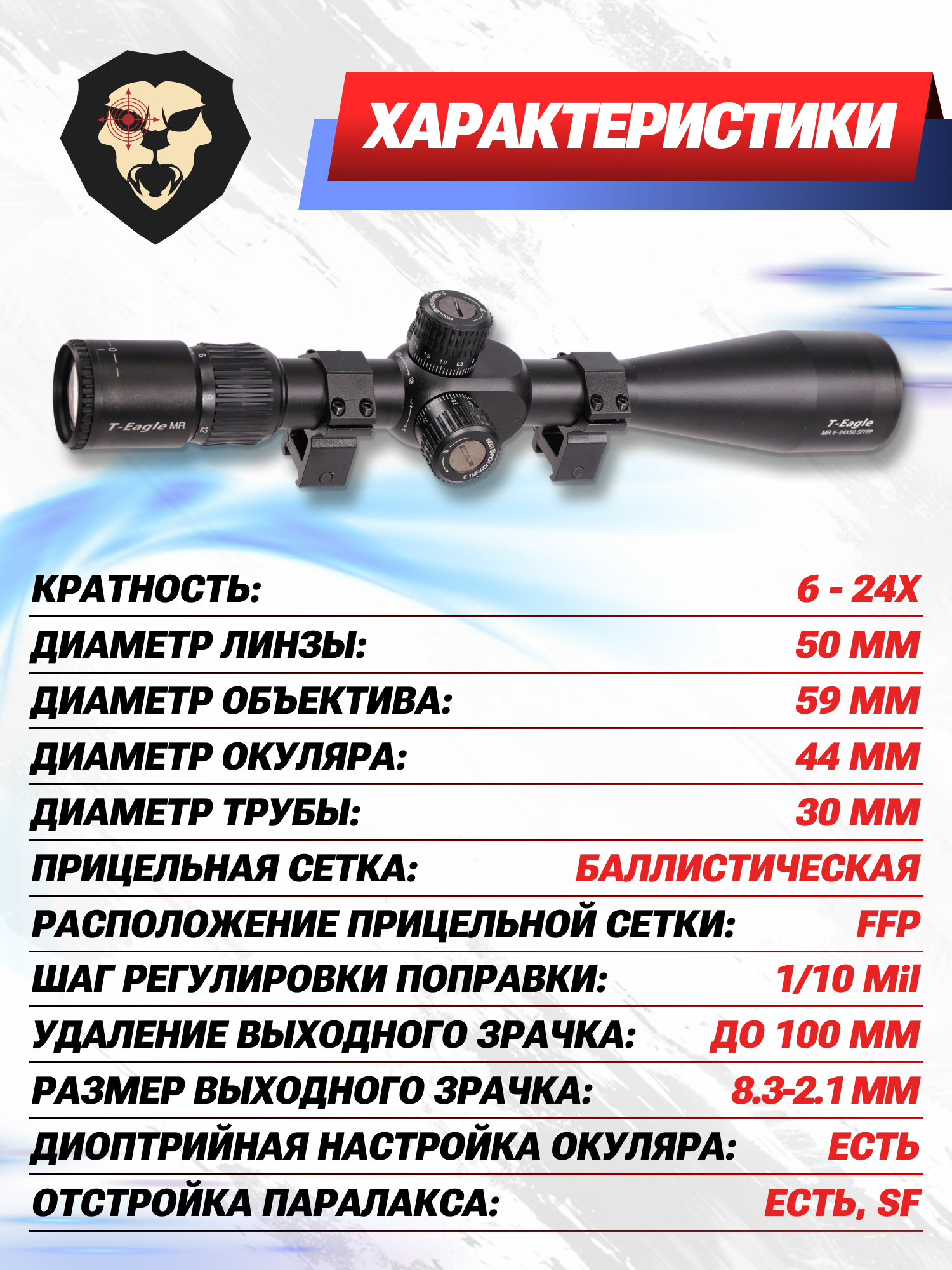 Информация о товаре "Оптический прицел T-Eagle MR 6-24x50 SF FFP (30 мм)" носит ознакомительный характер, и не является публичной офертой, определяемой положениями Статьи 437 Гражданского кодекса Российской Федерации, характеристики, внешний вид, цвет и комплектация могут быть изменены производителем без уведомления.