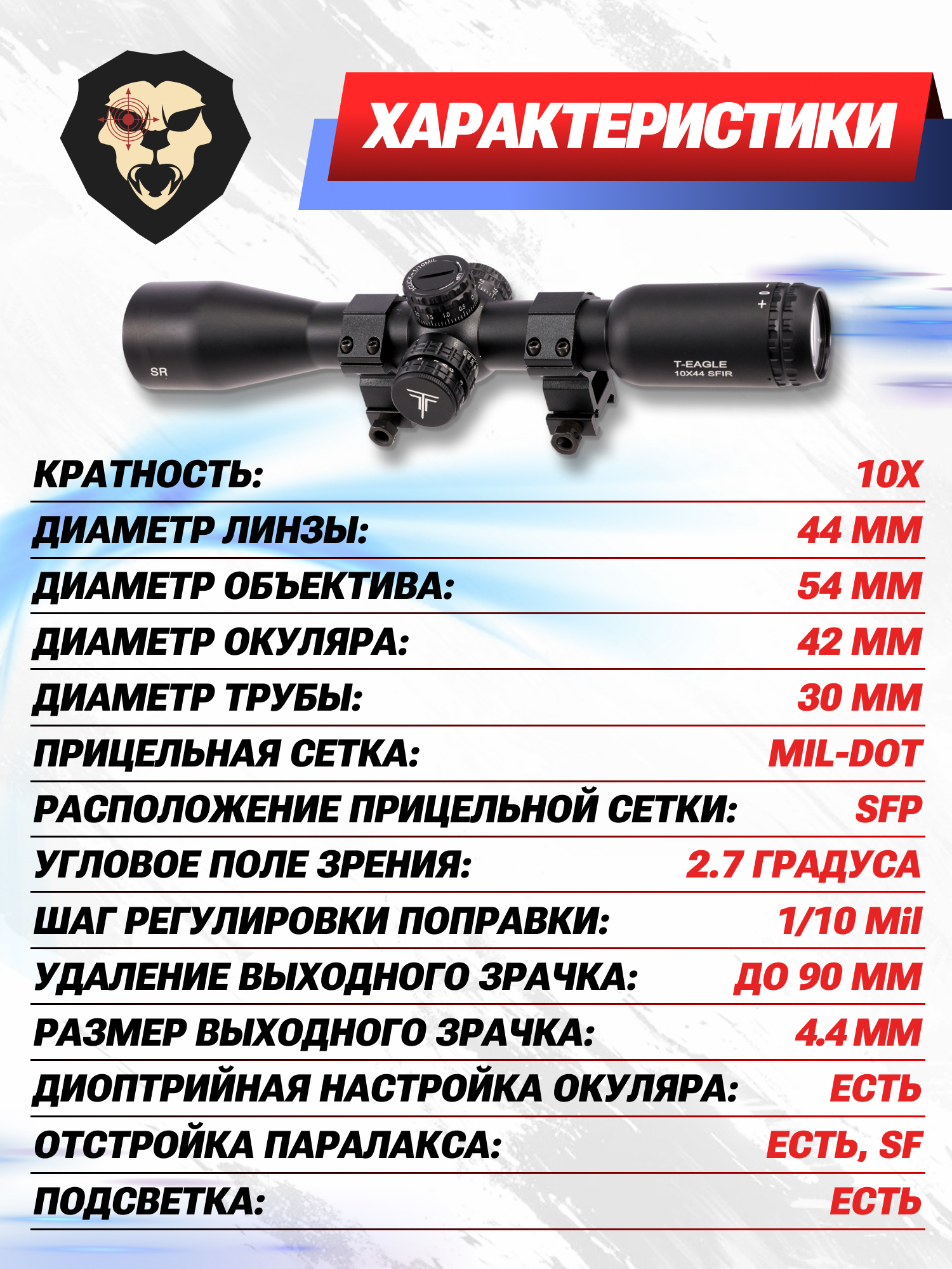 Информация о товаре "Оптический прицел T-Eagle SR 10x44 SF IR (30 мм, подсветка)" носит ознакомительный характер, и не является публичной офертой, определяемой положениями Статьи 437 Гражданского кодекса Российской Федерации, характеристики, внешний вид, цвет и комплектация могут быть изменены производителем без уведомления.