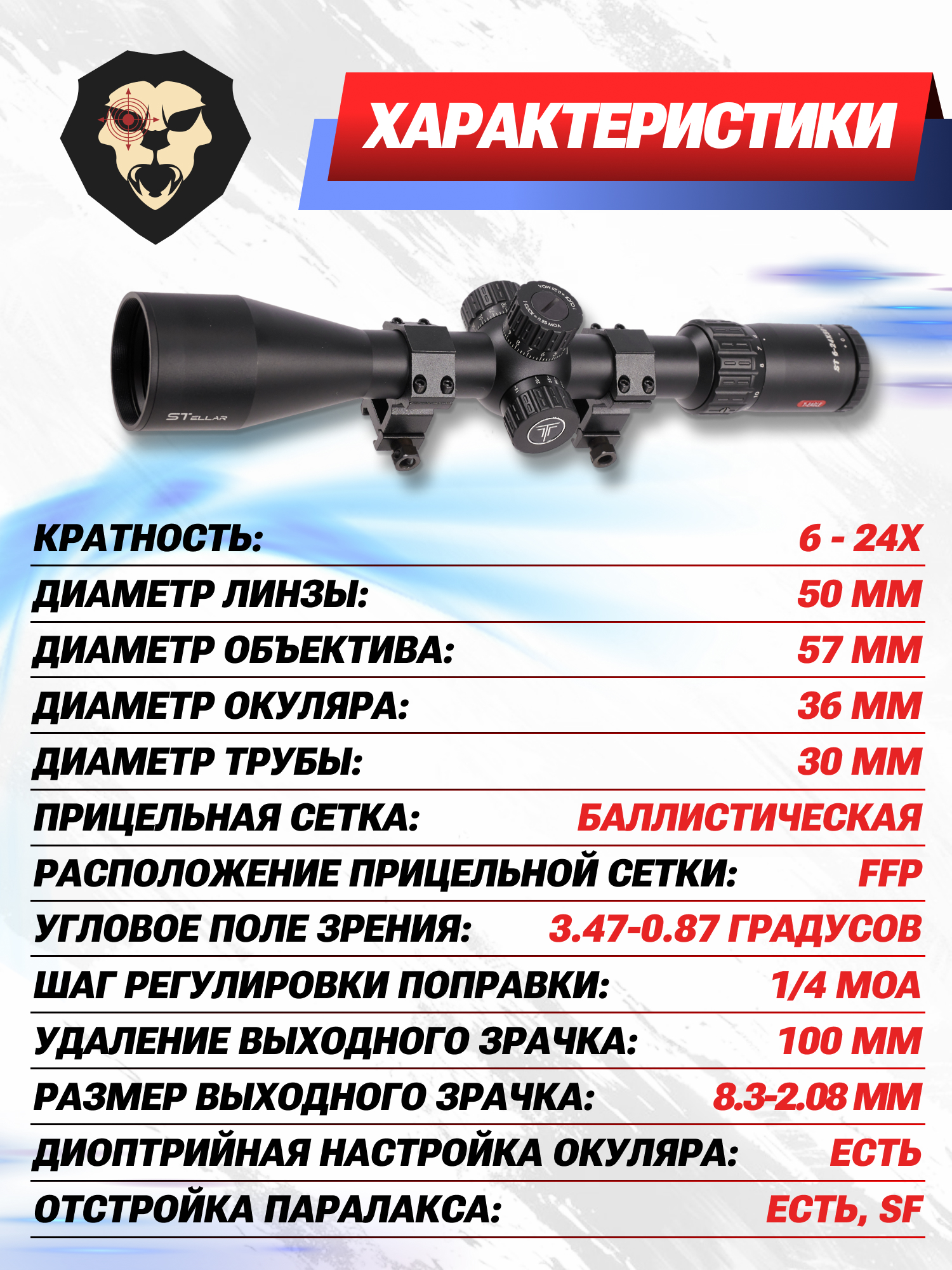 Информация о товаре "Оптический прицел T-Eagle ST 6-24x50 SF FFP (30 мм)" носит ознакомительный характер, и не является публичной офертой, определяемой положениями Статьи 437 Гражданского кодекса Российской Федерации, характеристики, внешний вид, цвет и комплектация могут быть изменены производителем без уведомления.