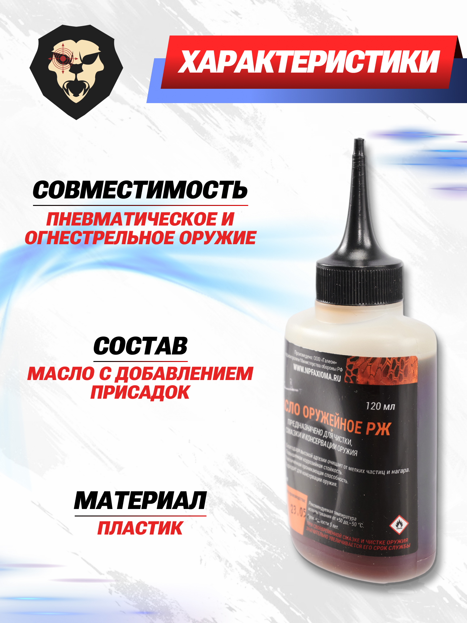 Масло нейтральное Русак РЖ образует защитную пленку на металлических поверхностях от воздействия ржавчины и излишнего трения. Состав рассматриваемого средства сформирован таким образом, что оно не несет вредного и разрушительного воздействия при попадании на дерево, резину или кожу человека. Также изготовитель отмечает, что применение специализированных присадок в качестве добавки к маслу позволило сделать масло оружейное Русак устойчивым к температурам критического уровня до -60 градусов.
