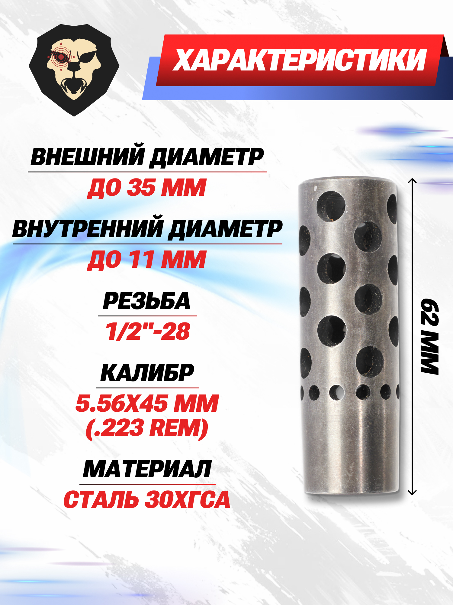 На корпусе с габаритами в 62 миллиметра расположены симметричные отверстия, направленные под маленьким углом в сторону карабина. Этот форм-фактор дает при выстреле выпускать газы в обратную сторону от направления стрельбы, тем самым нивелируя эффект отдачи на 30 процентов.