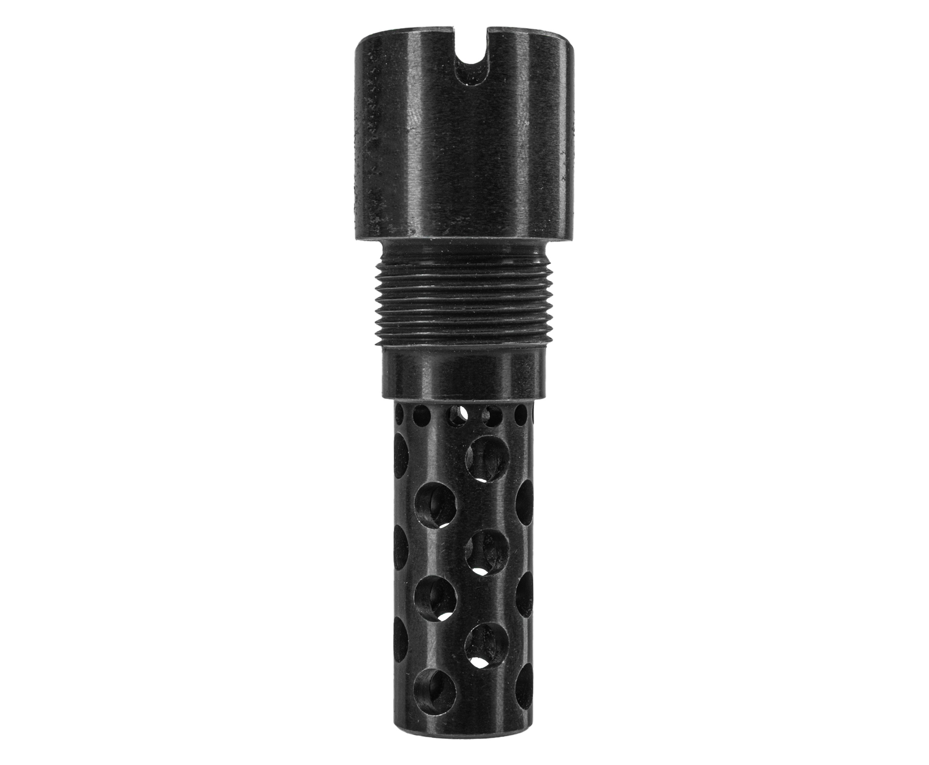 ДТК Dual brake класса, к конструкции которого относится представленный образец, помимо снижения вертикальной отдачи, корректирует оружие по горизонтали в момент выстрела. Это происходит за счет внутренних бороздок и отверстий по всей площади дульного устройства, которые ориентированы под наклоном в сторону стрелка, что также уменьшает силу плечевого удара.