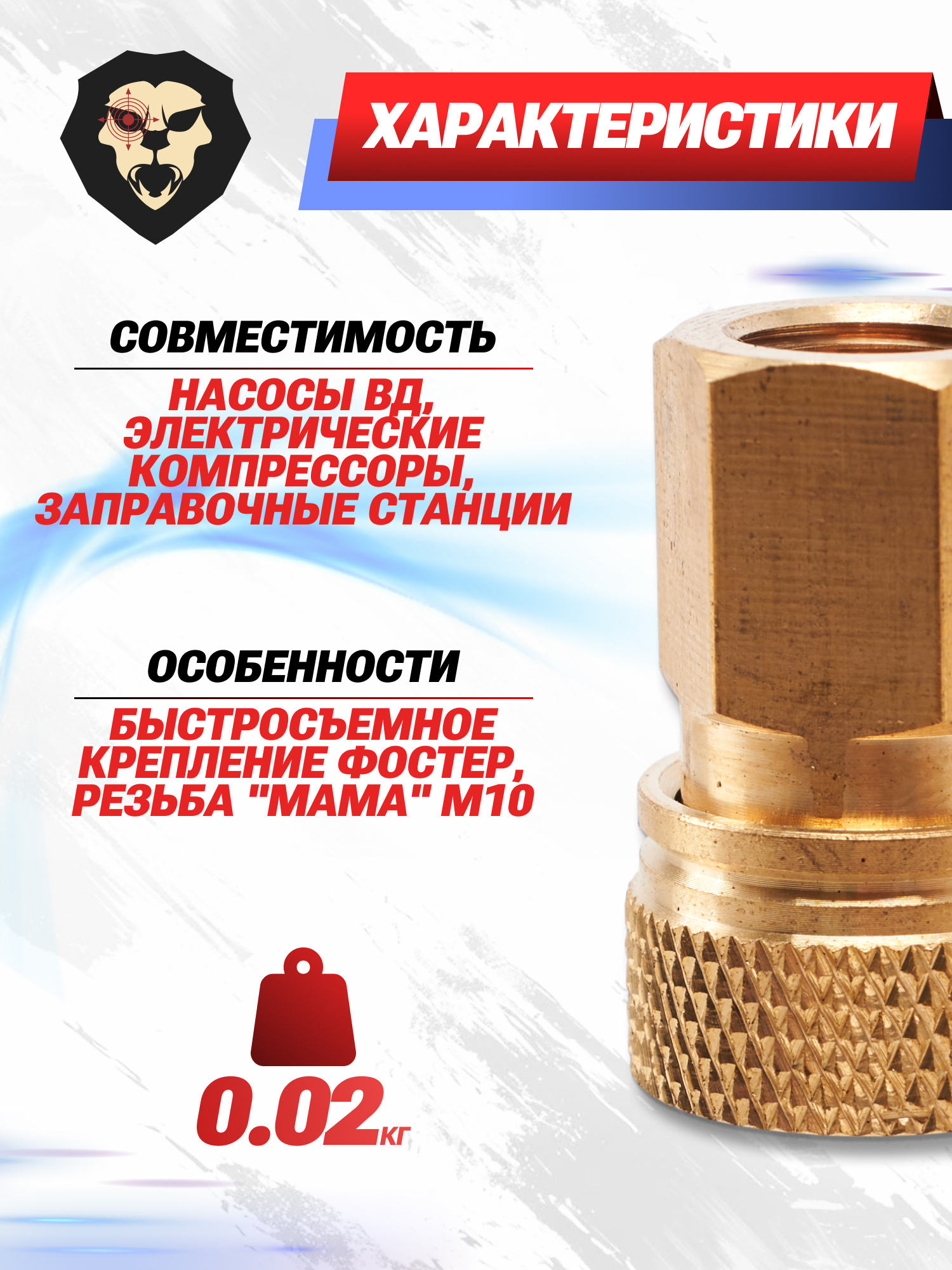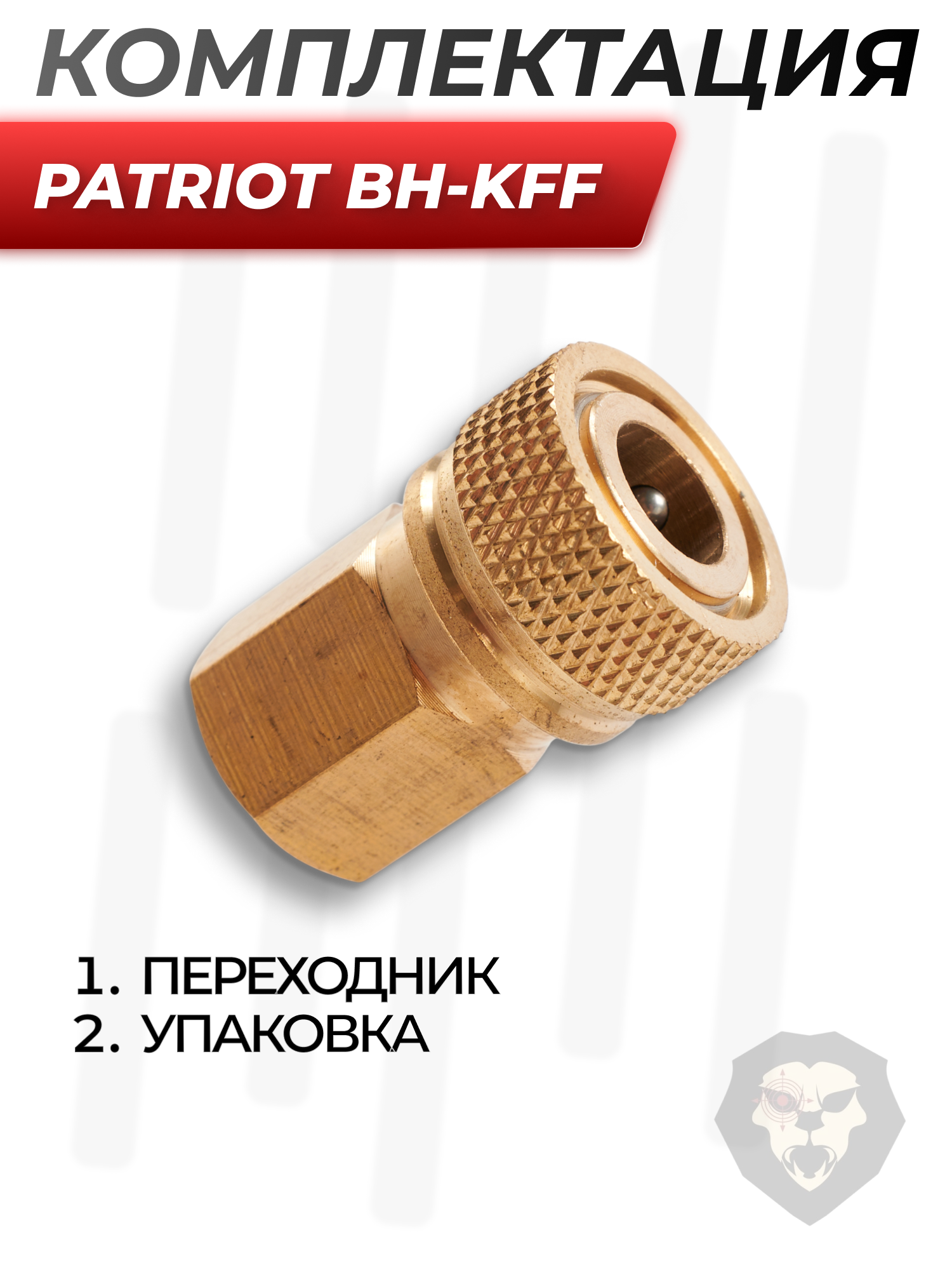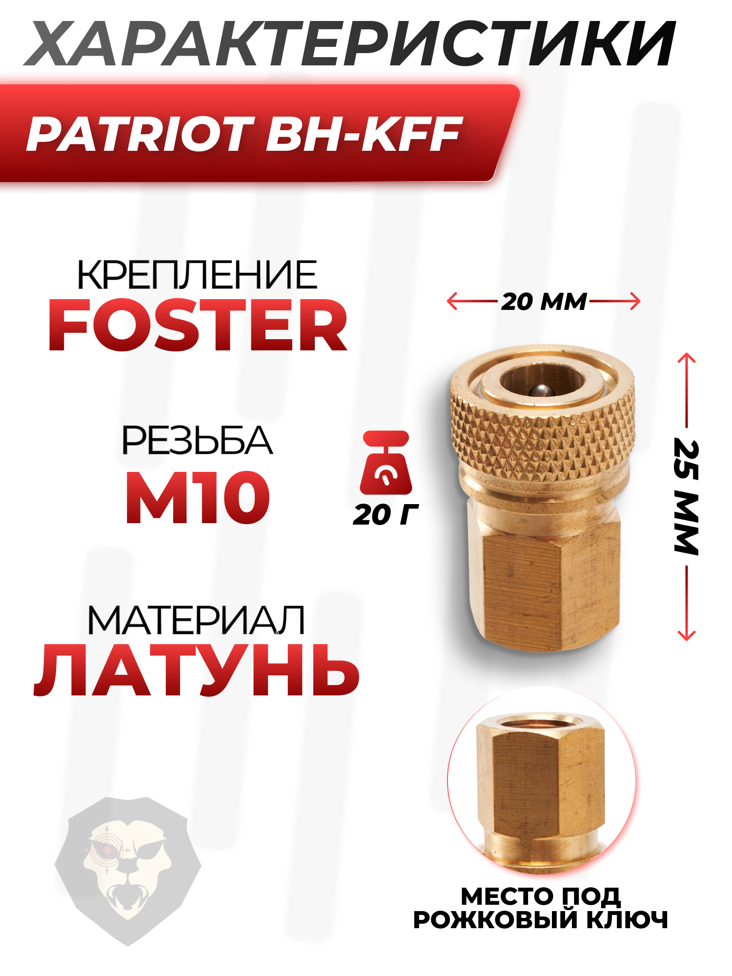 Рассматриваемый экземпляр производителя Patriot выполнен в виде быстросъемного насадки-держателя Фостер. Модель выполнена из латуни и имеет увеличенные показатели по стойкости к образованию коррозии, также на приборе нарезана резьба формата «мама» M10, которая предполагает установку путем накручивания на необходимую ответную часть. Процесс монтажа происходит при помощи рожкового или раздвижного ключа под требуемый размер фитинга.