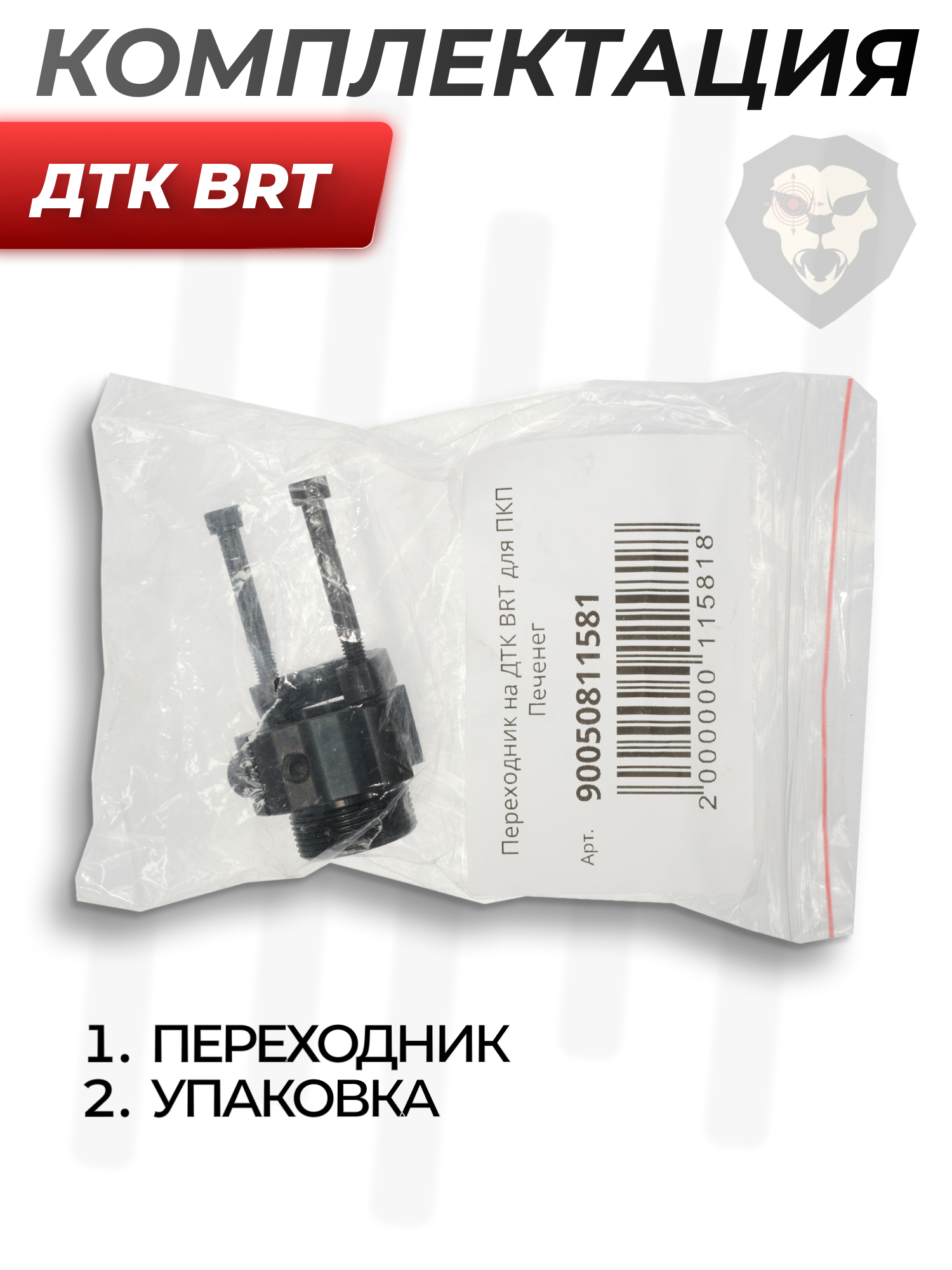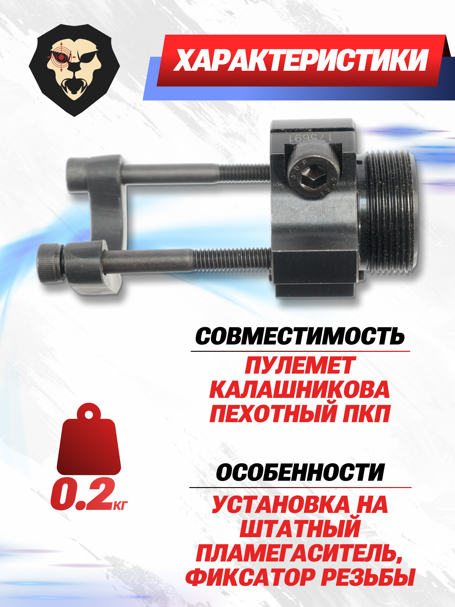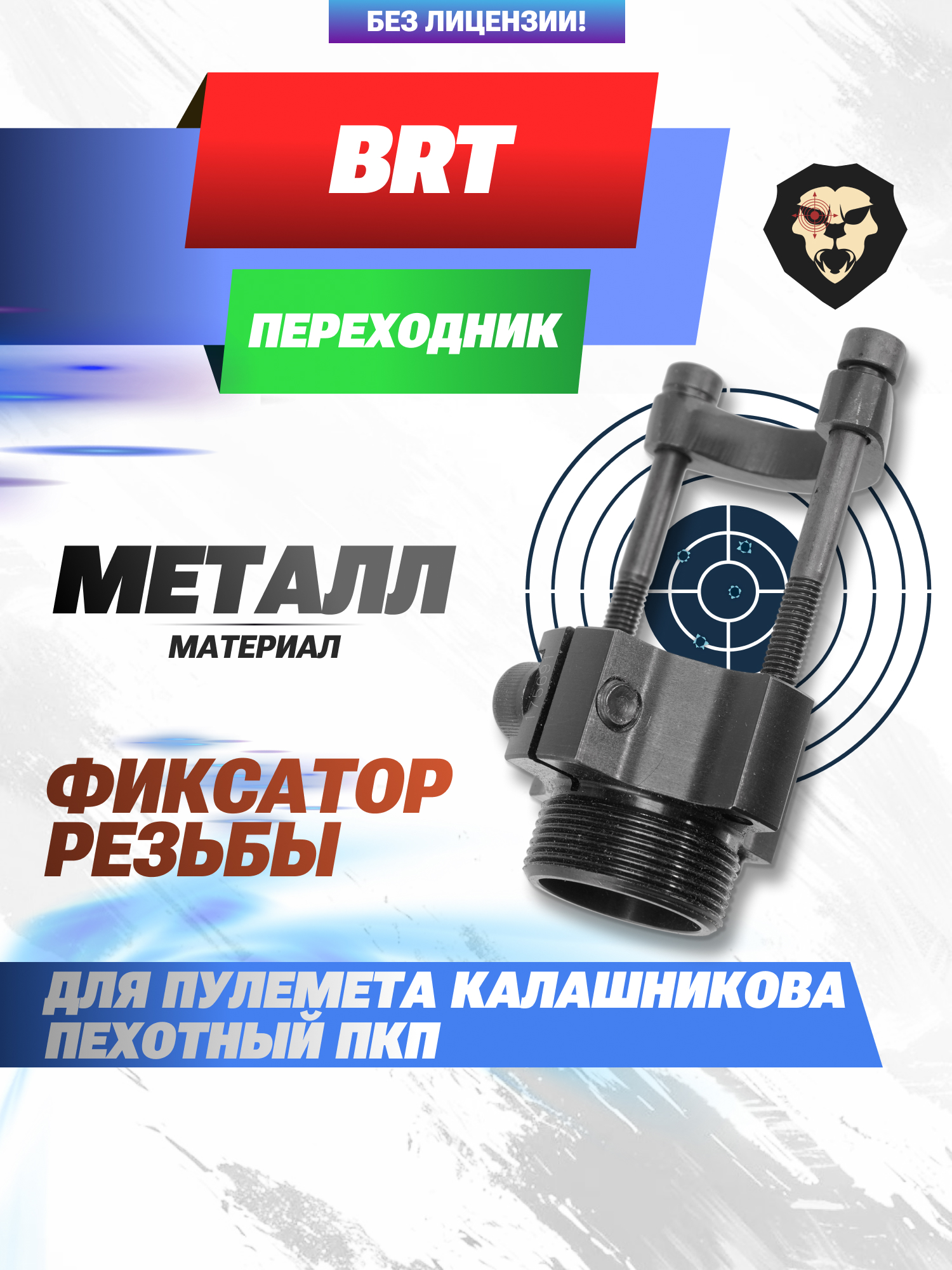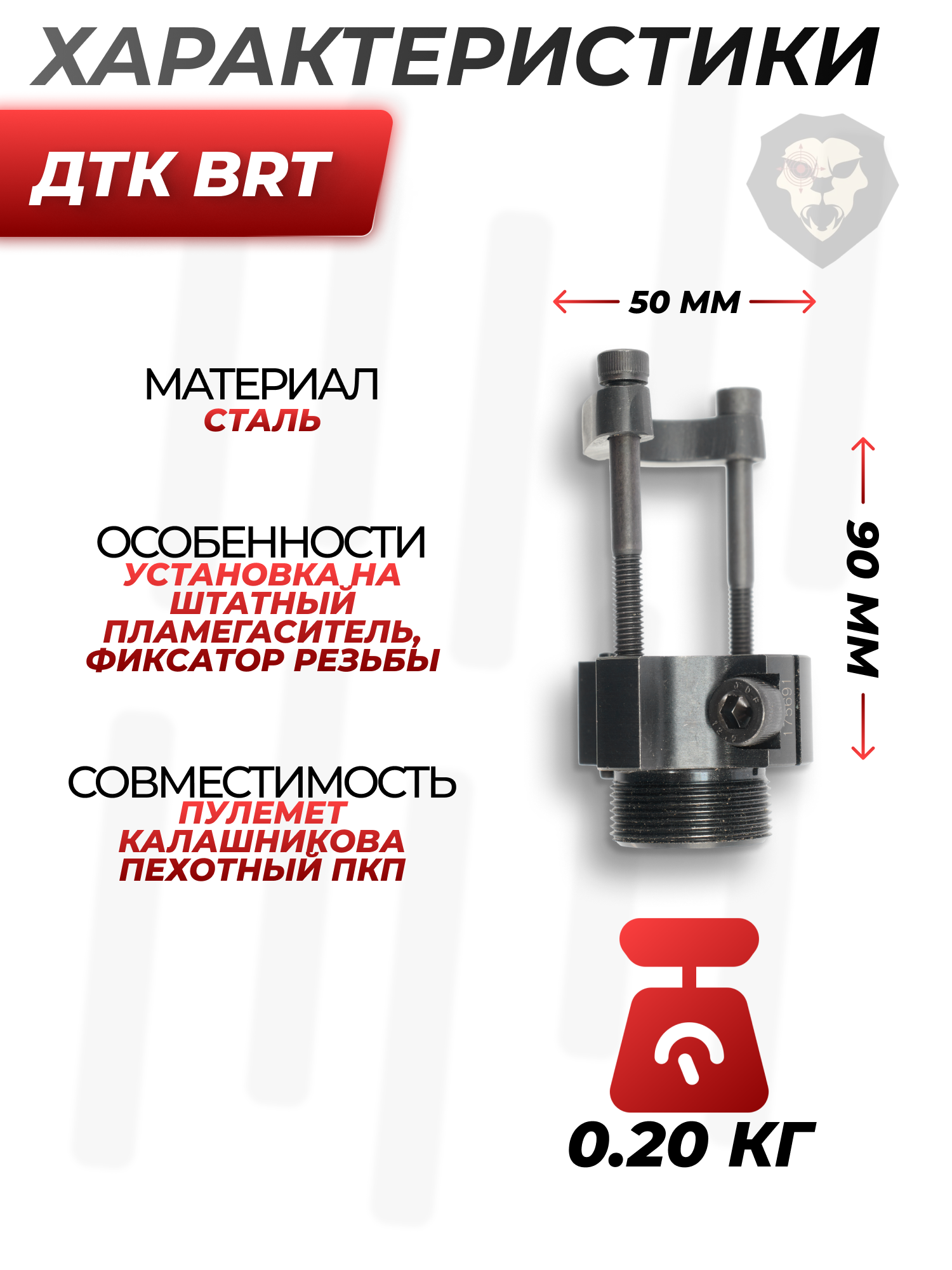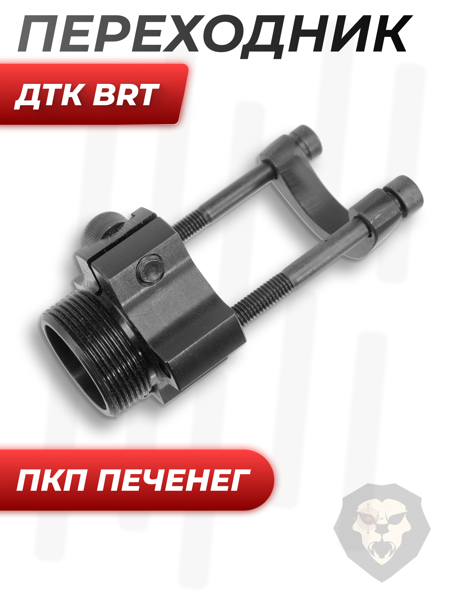Представленный адаптер служит для монтажа дульного тормоза-компенсатора BRT газоразгруженного типа на общевойсковой пехотный пулемет Калашникова калибром 7.62x54 мм. Изделие представляет собой муфту увеличенного размера с нанесенной резьбой для установки ДТК. Изделие закрепляется на штатный пламегаситель ПКП - фиксация происходит на 3 винта с шестигранной головкой, два из которых поджимают дополнительную металлическую пластину.