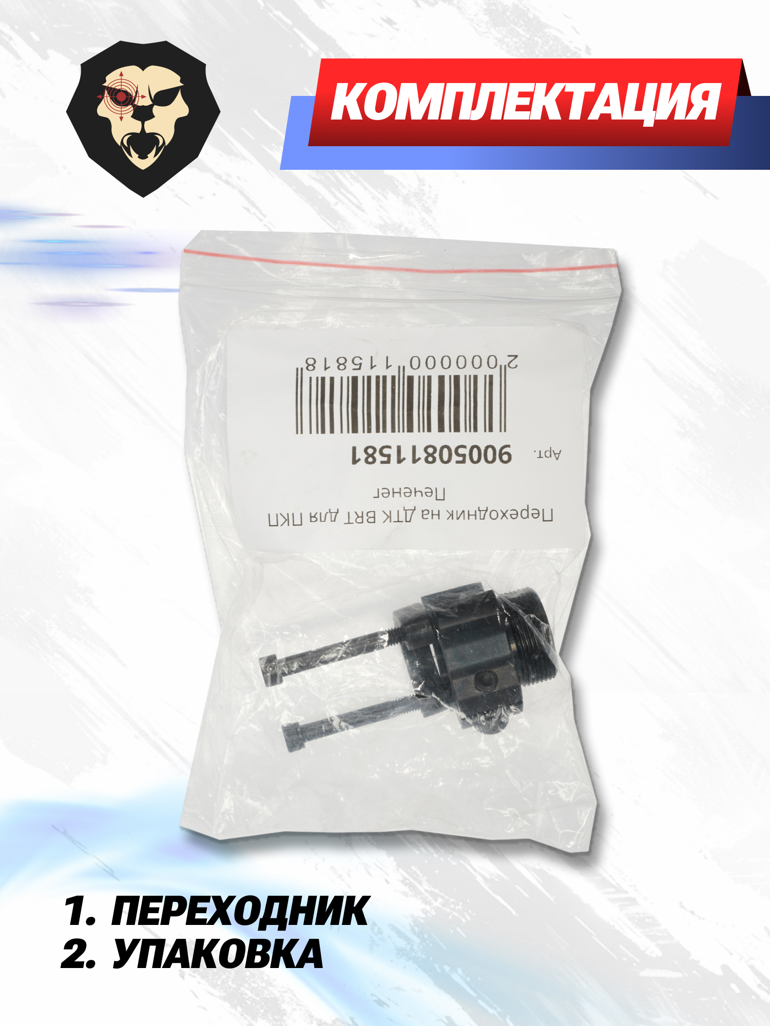 Адаптер под BRT ДТК изготавливается из легированной стали - крепеж имеет никелированное покрытие, а муфта подвергается анодированию в целях защиты от образования коррозии. После монтажа переходника стрелок способен накручивать дульный тормоз-компенсатор по мере необходимости без потребности в дополнительном инструменте. Адаптер также снабжен фиксатором резьбы в виде подпружиненного выступа, который попадает в паз и блокирует сдвиг ствольной насадки от вибраций выстрела.