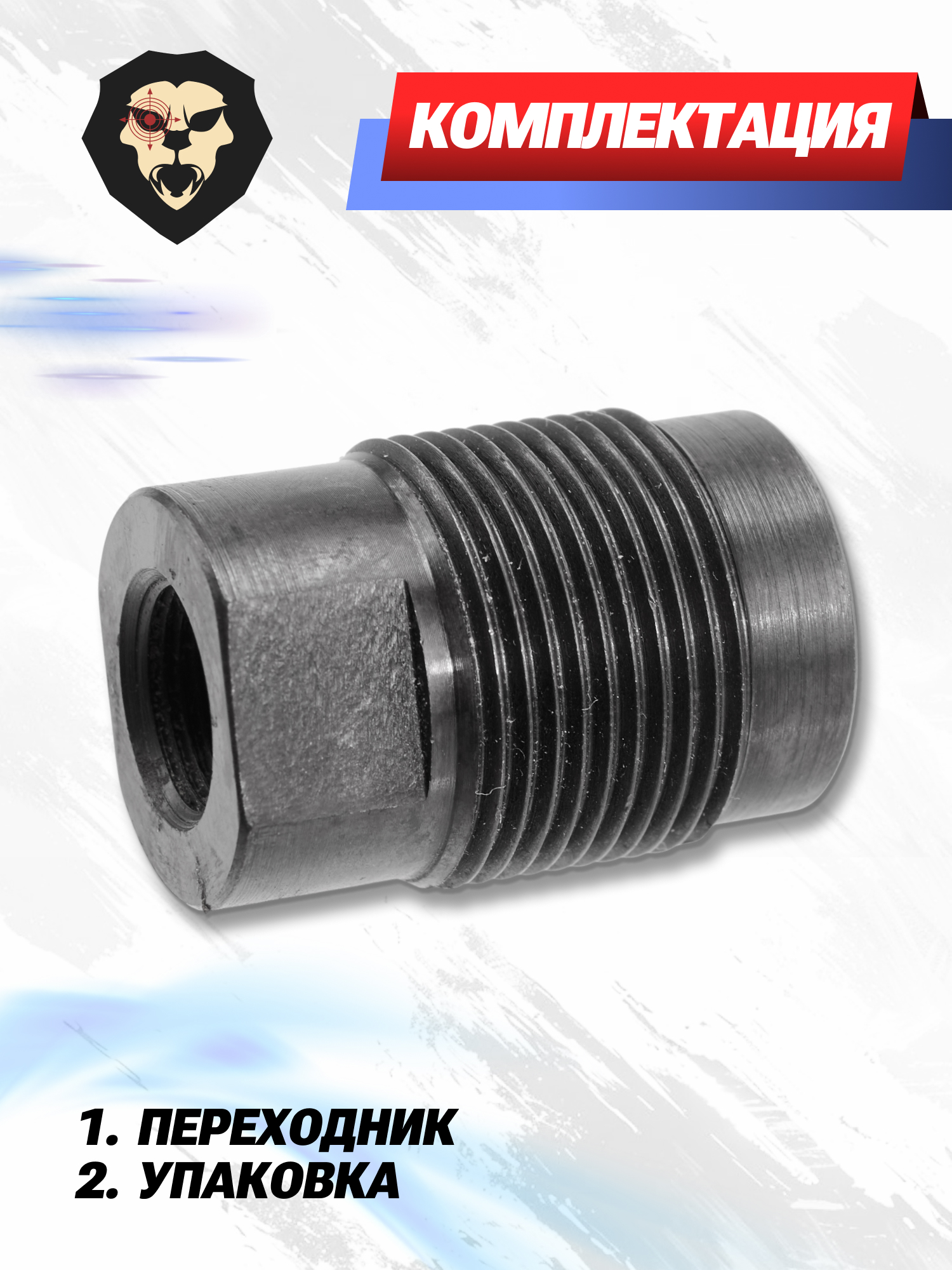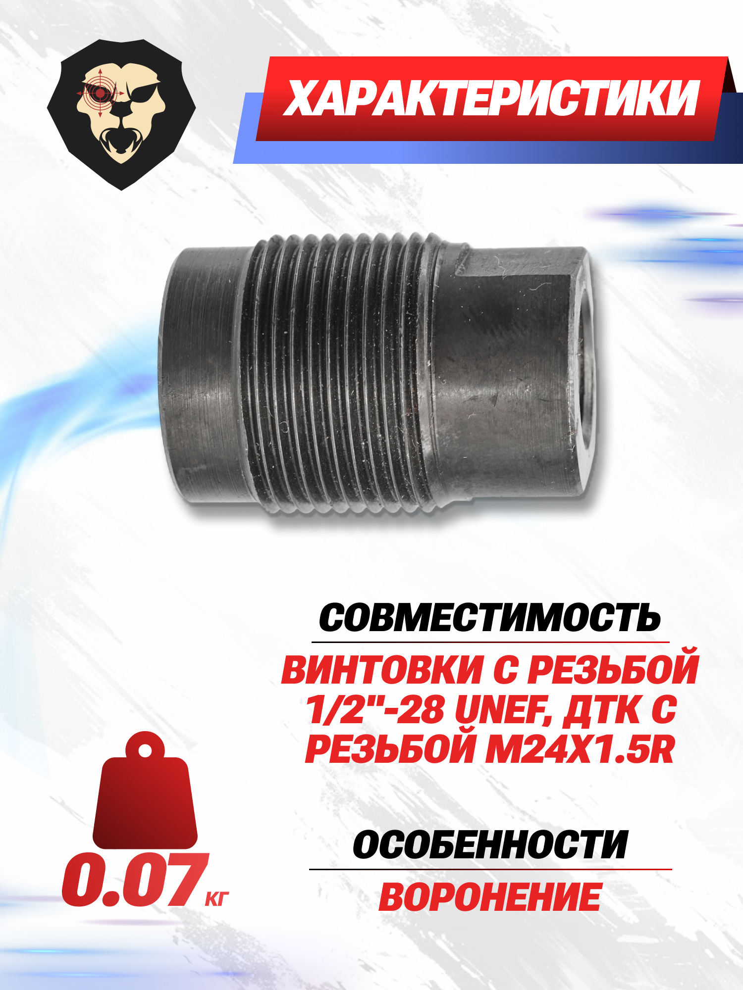Представленный переходник содержит две резьбы - 1/2 Дюйма на 28 витков, изготовленную по классификации UNEF и привычную M24x1.5 с фиксацией в правую сторону, которая нередко встречается в изделиях RDT Russia. Соответственно модель предполагает включение опции использования распространенных ДТК на оружии иностранного происхождения.