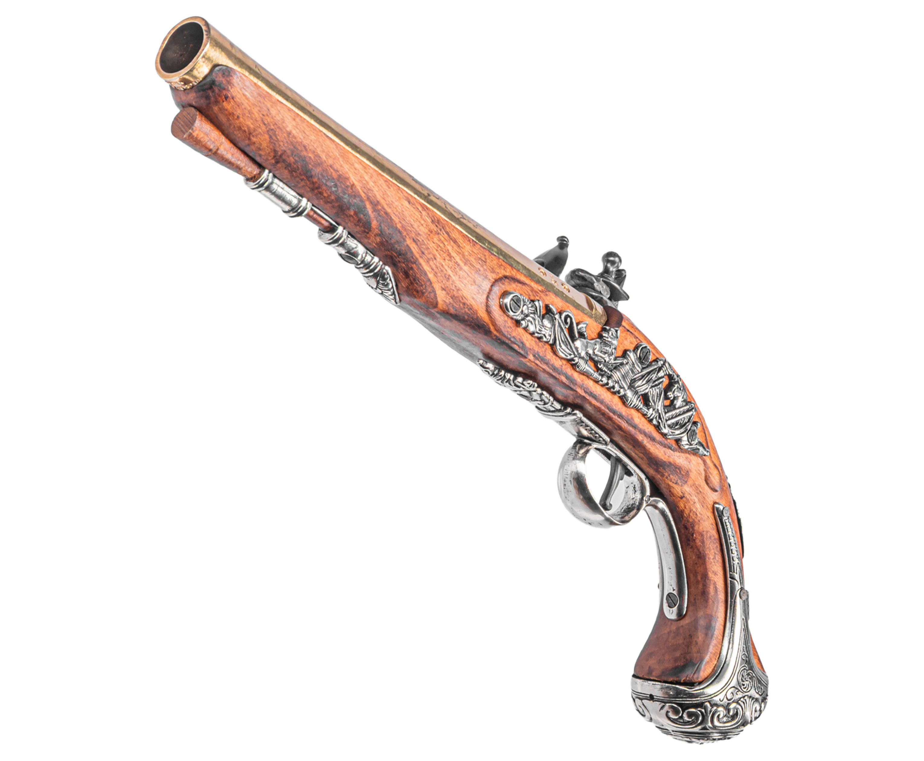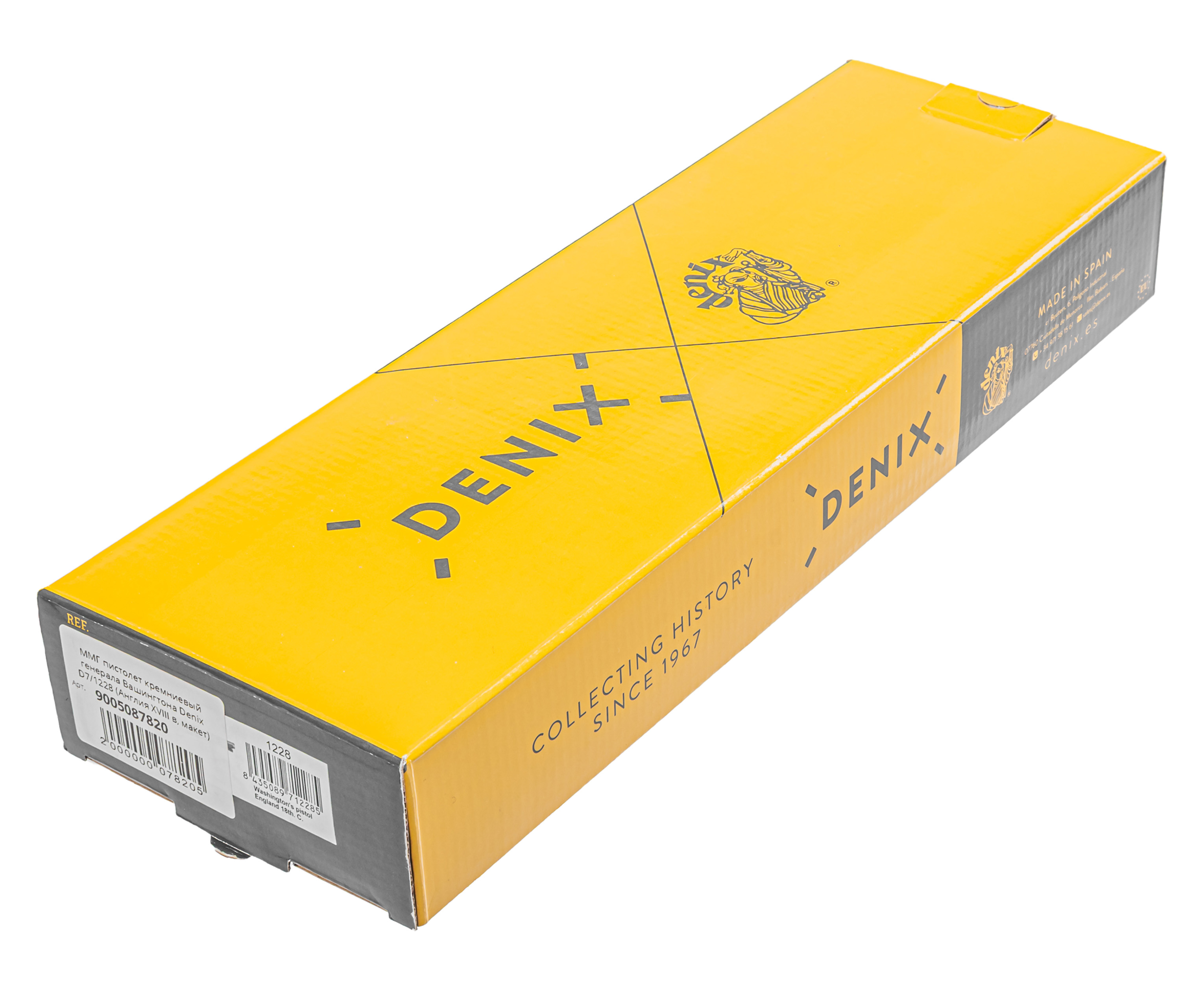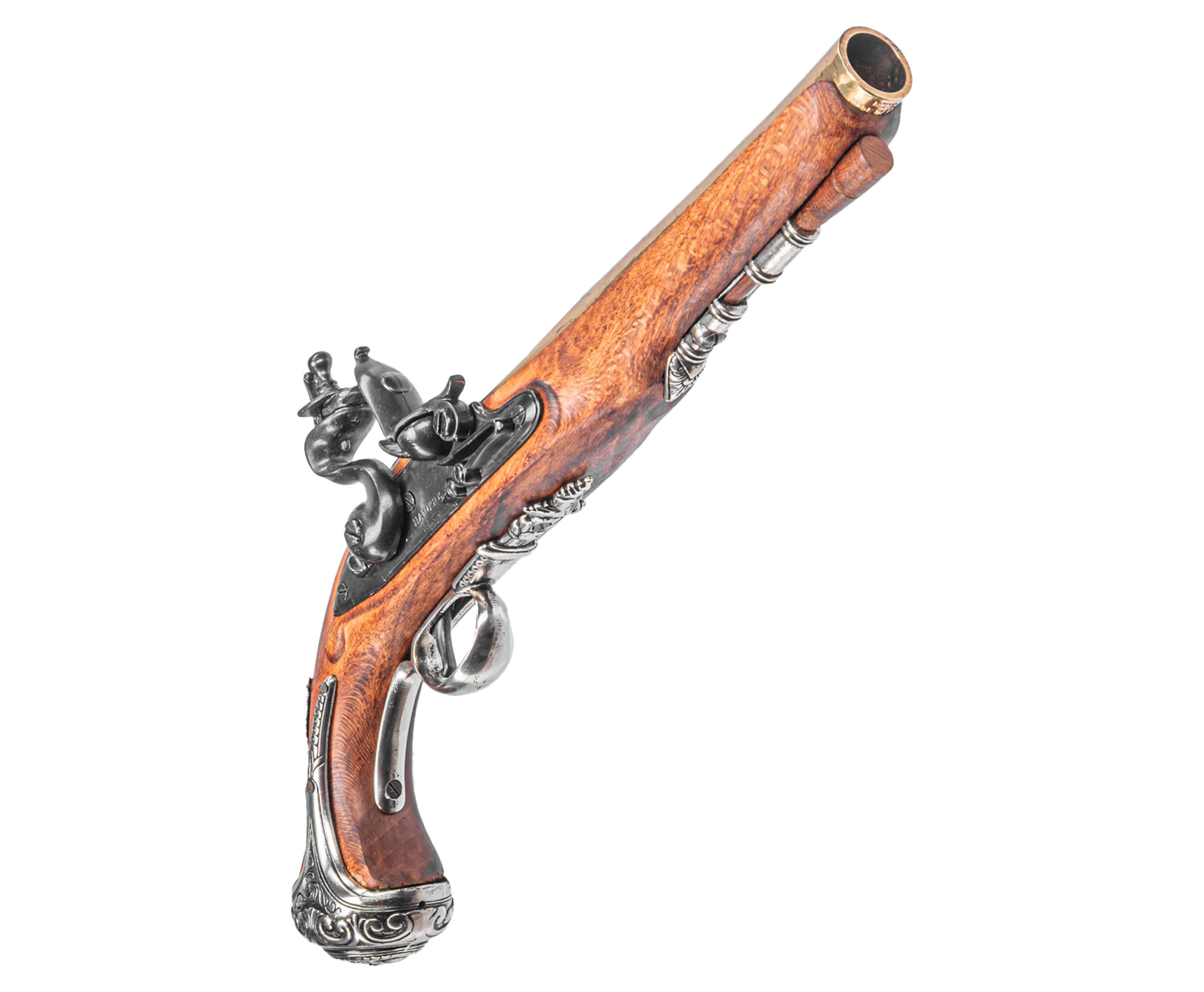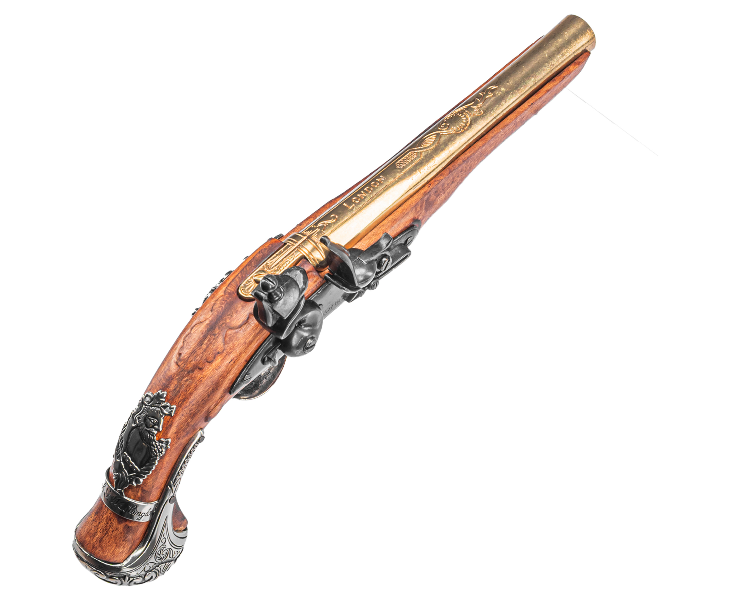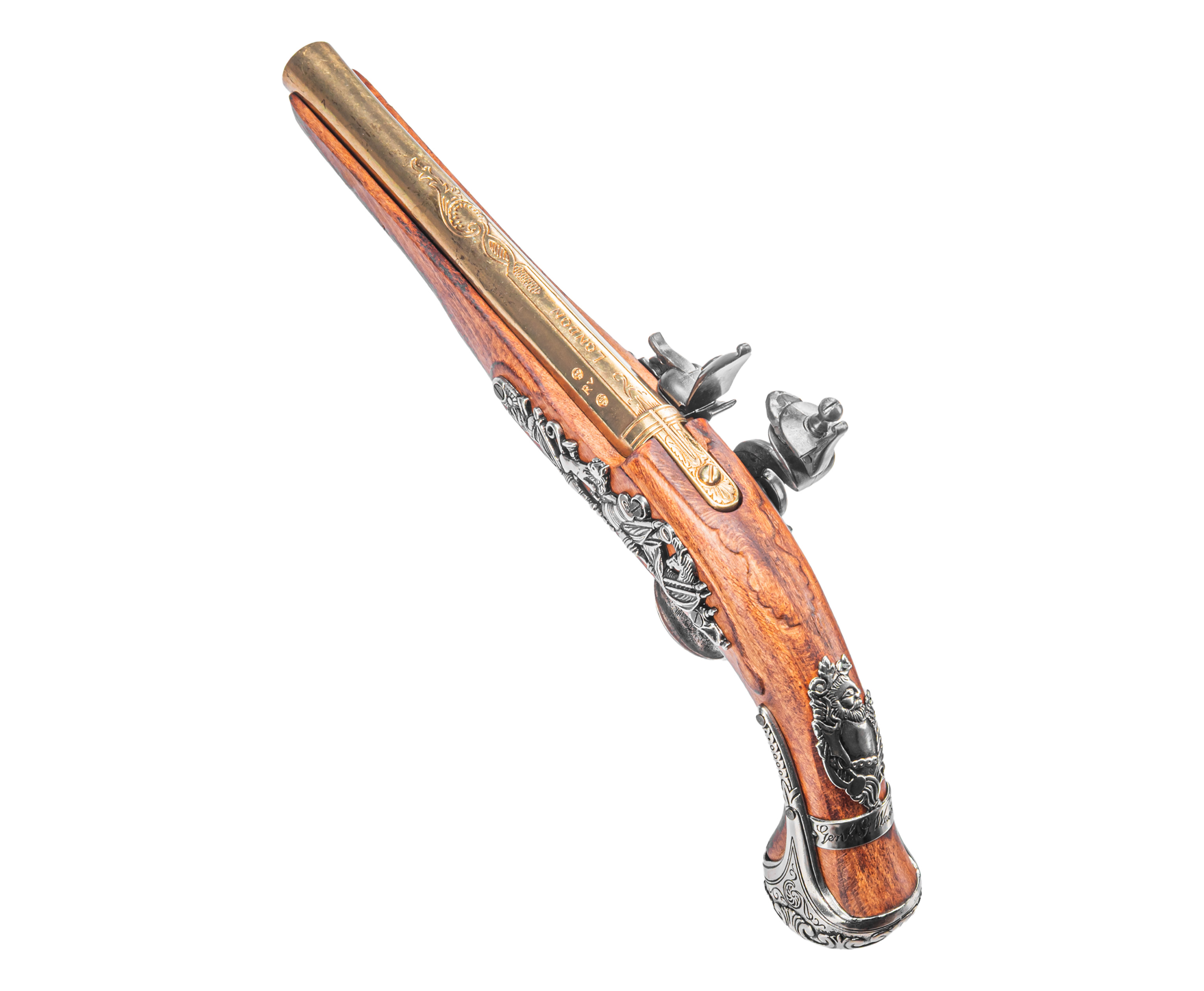 В рассматриваемом варианте исполнения кремниевый пистолет Denix D7-1228 изготовлен из комбинации металла и дерева - из последнего выполнена ложа экземпляра. Вес при использовании отмеченных материалов достиг значения в 700 грамм, при этом длина равна 35.5 сантиметра. Также из особенностей модели стоит выделить красочный узорный рисунок на навершии рукояти и вставку на боковой части корпуса, что привносит стиль и элегантность изделию.