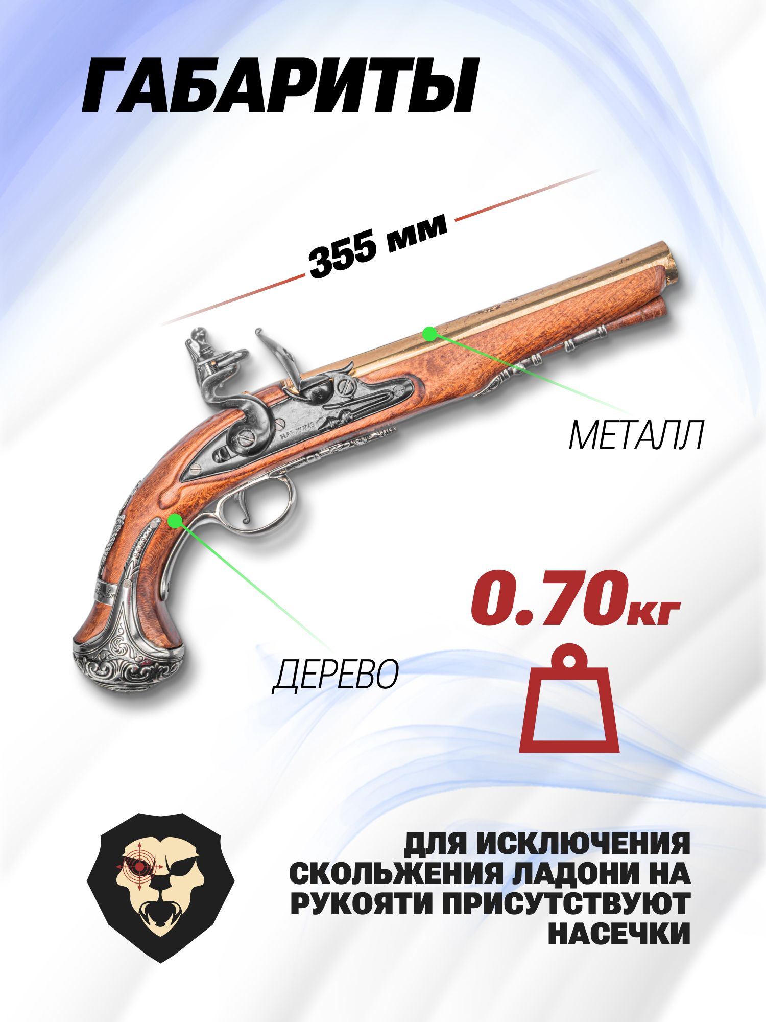 В рассматриваемом варианте исполнения кремниевый пистолет Denix D7-1228 изготовлен из комбинации металла и дерева - из последнего выполнена ложа экземпляра. Вес при использовании отмеченных материалов достиг значения в 700 грамм, при этом длина равна 35.5 сантиметра. Также из особенностей модели стоит выделить красочный узорный рисунок на навершии рукояти и вставку на боковой части корпуса, что привносит стиль и элегантность изделию.