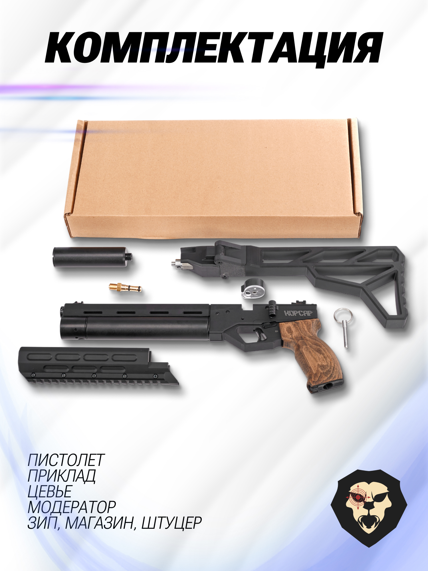 | Комплектация | Пистолет, магазин, приклад, цевье, модератор, заправочный штуцер, набор РТИ, упаковка, краткая документация, копия сертификата (по запросу покупателя) |