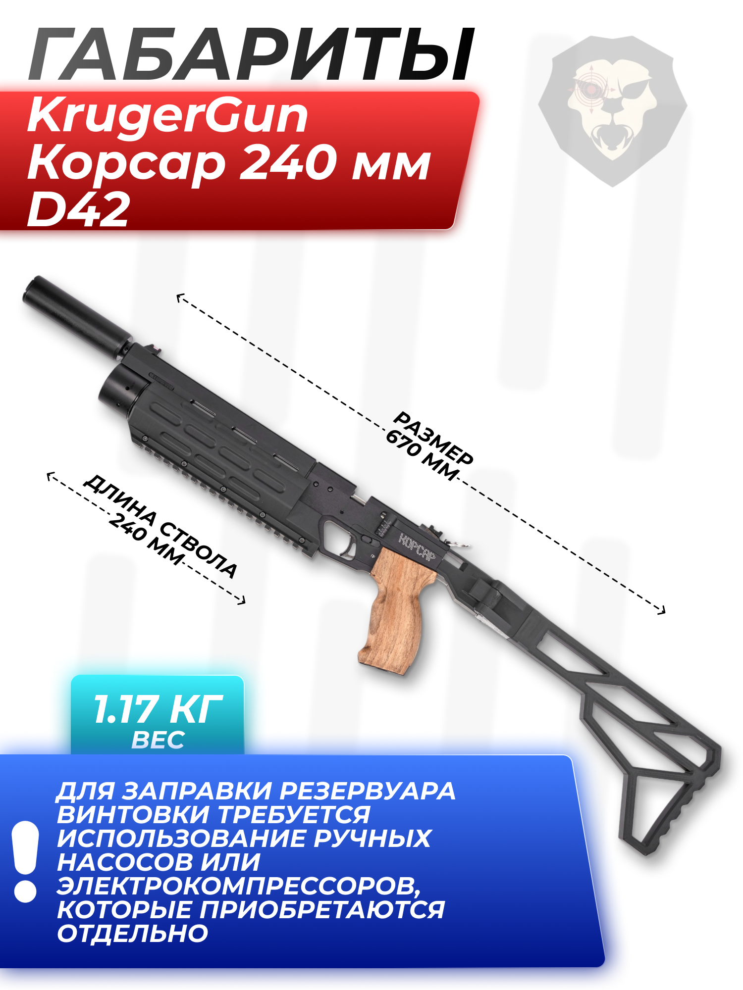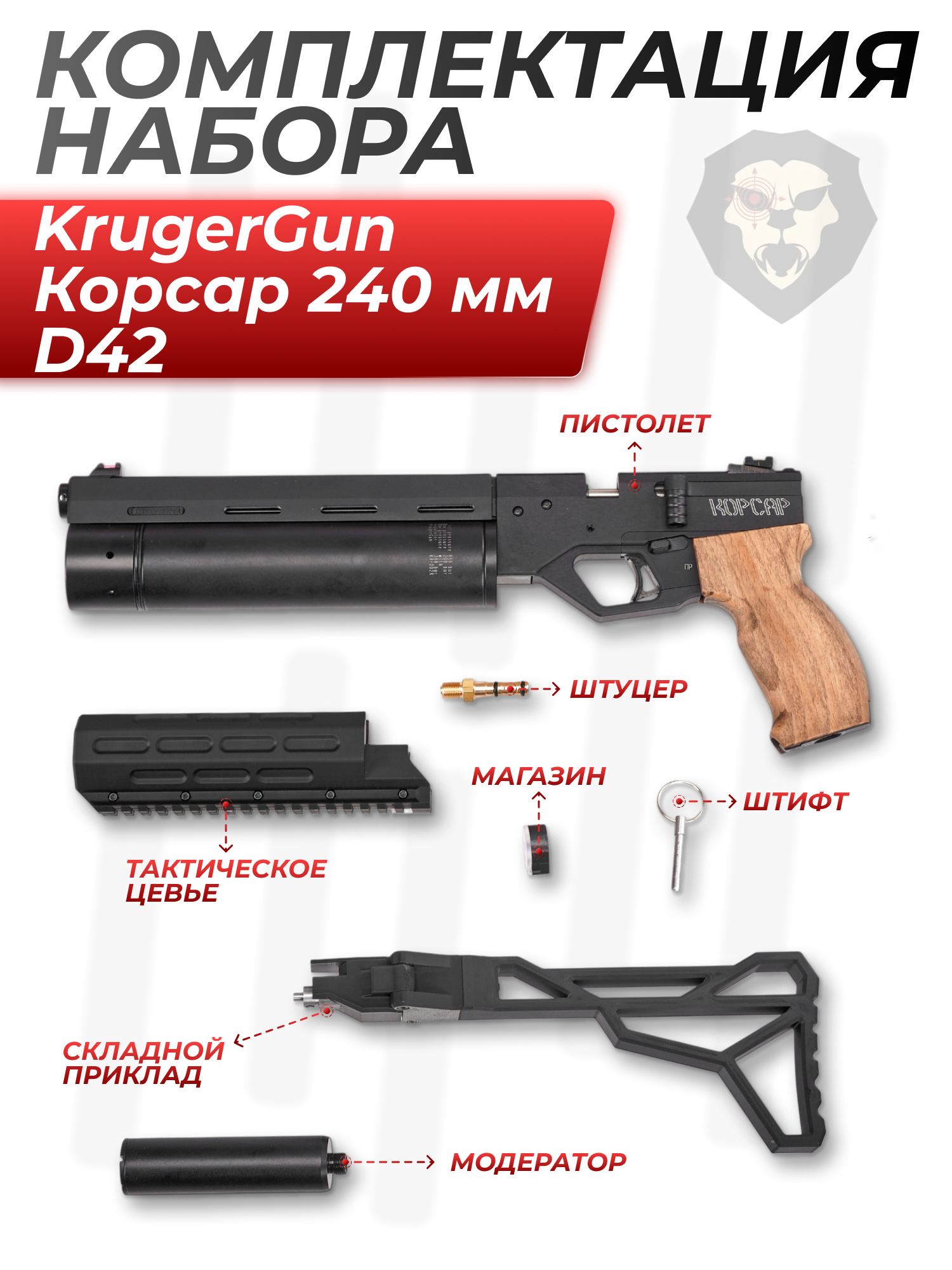 Пневматический пистолет KrugerGun Корсар 6.35 мм в прямоточном исполнении с деревянной рукоятью и стволом 24 см поставляется совместно с цевьем, которое крепится винтами в обхват ресивера D42, а также прикладом. Последний идет со всем необходимым для установки - альтернативной пробкой прижима пружины ударника и «солдатиком», обеспечивающим фиксацию конструкции.