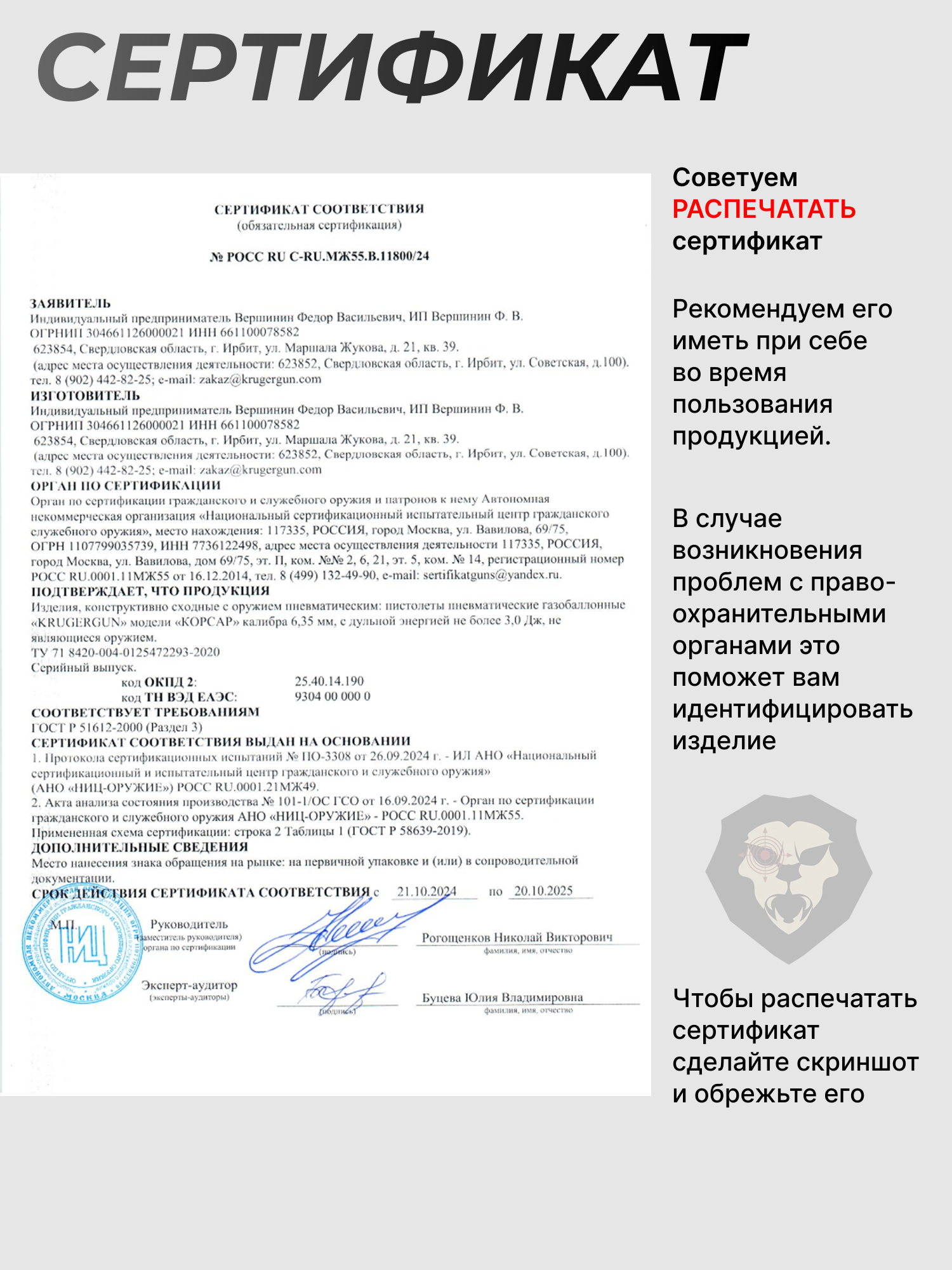 Комплектация | Пистолет, магазин, приклад, цевье, модератор, заправочный штуцер, набор РТИ, упаковка, краткая документация, копия сертификата (по запросу покупателя) |