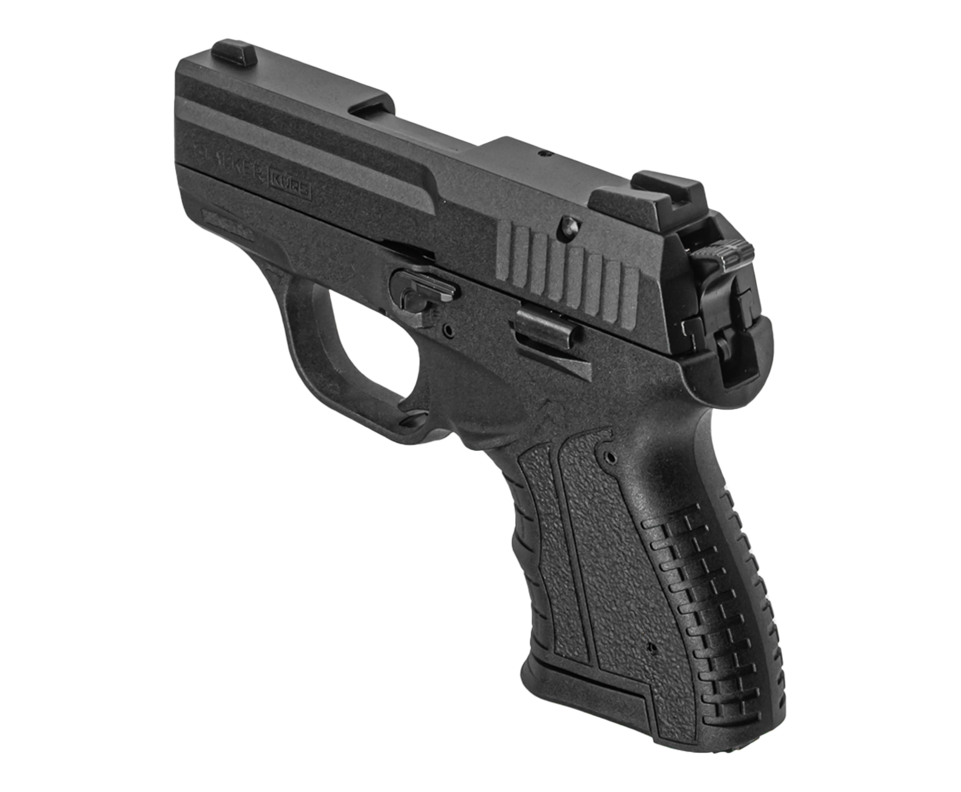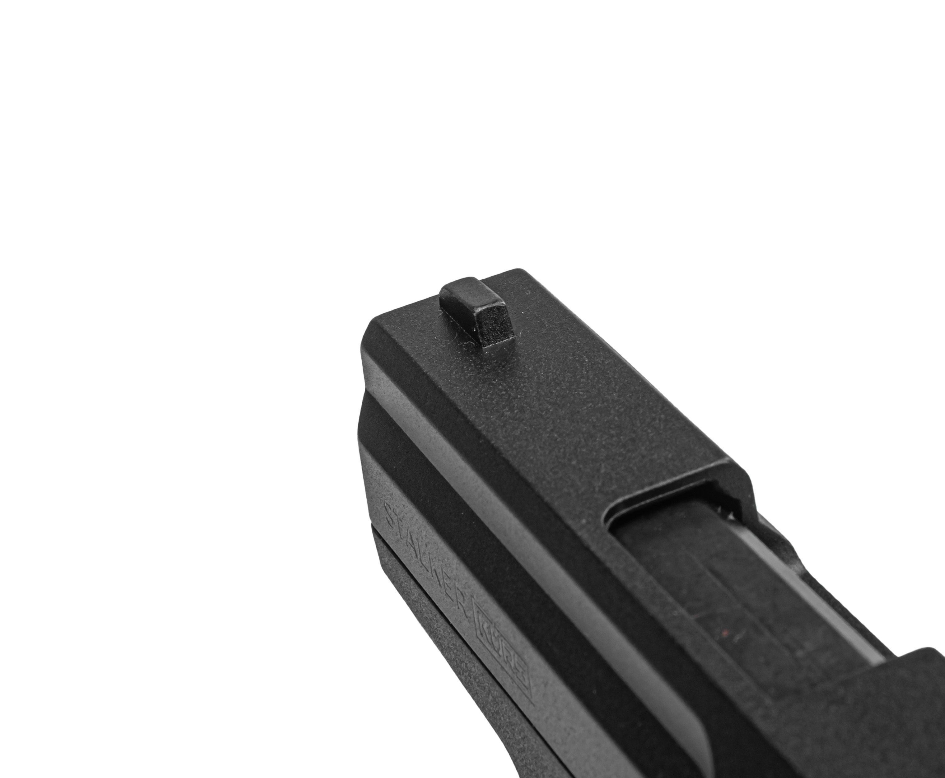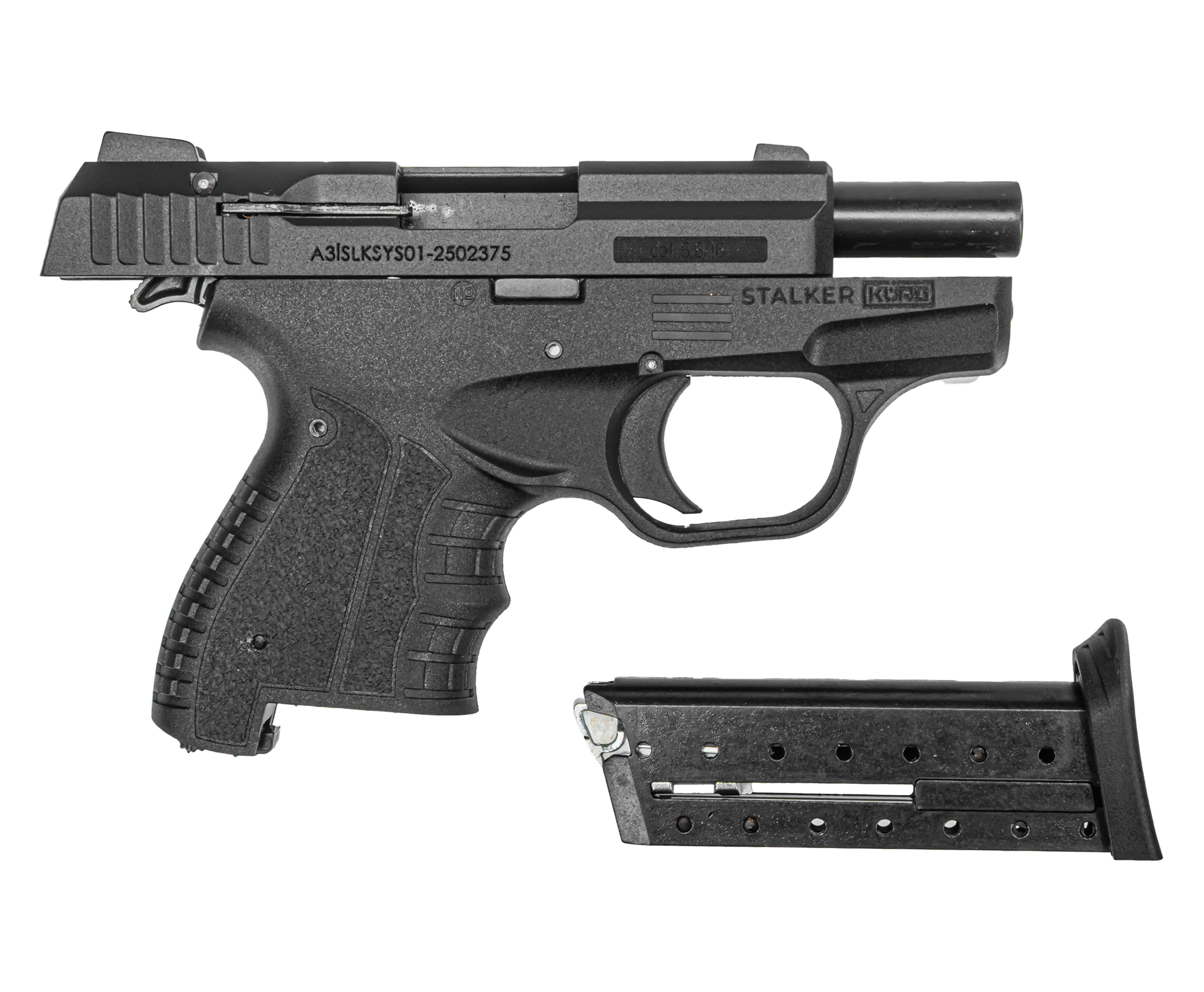 Пистолет Stalker Kurs M906 полуавтоматический, т.е. не требующий взведения при выстреле - это происходит во время откатывания кожуха затвора под действием давления, создаваемого патроном. Также в указанном процессе происходит подача заряда из магазина на 8 мест - последний предполагает отъемную конструкцию, ввиду чего доступно проведение оперативной перезарядки при наличии запасного.