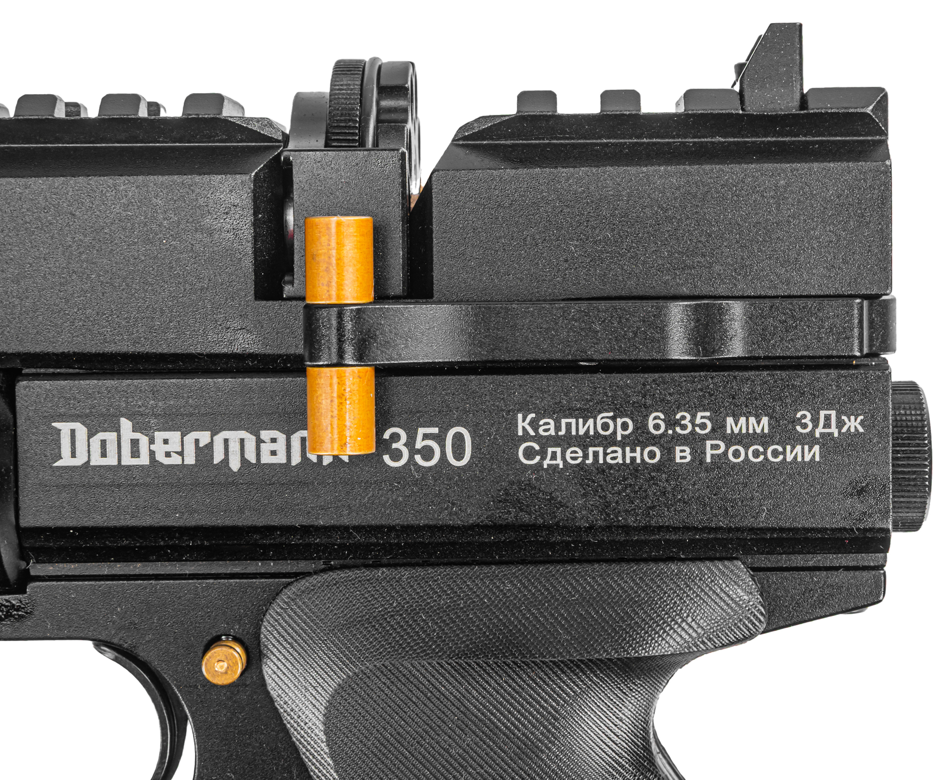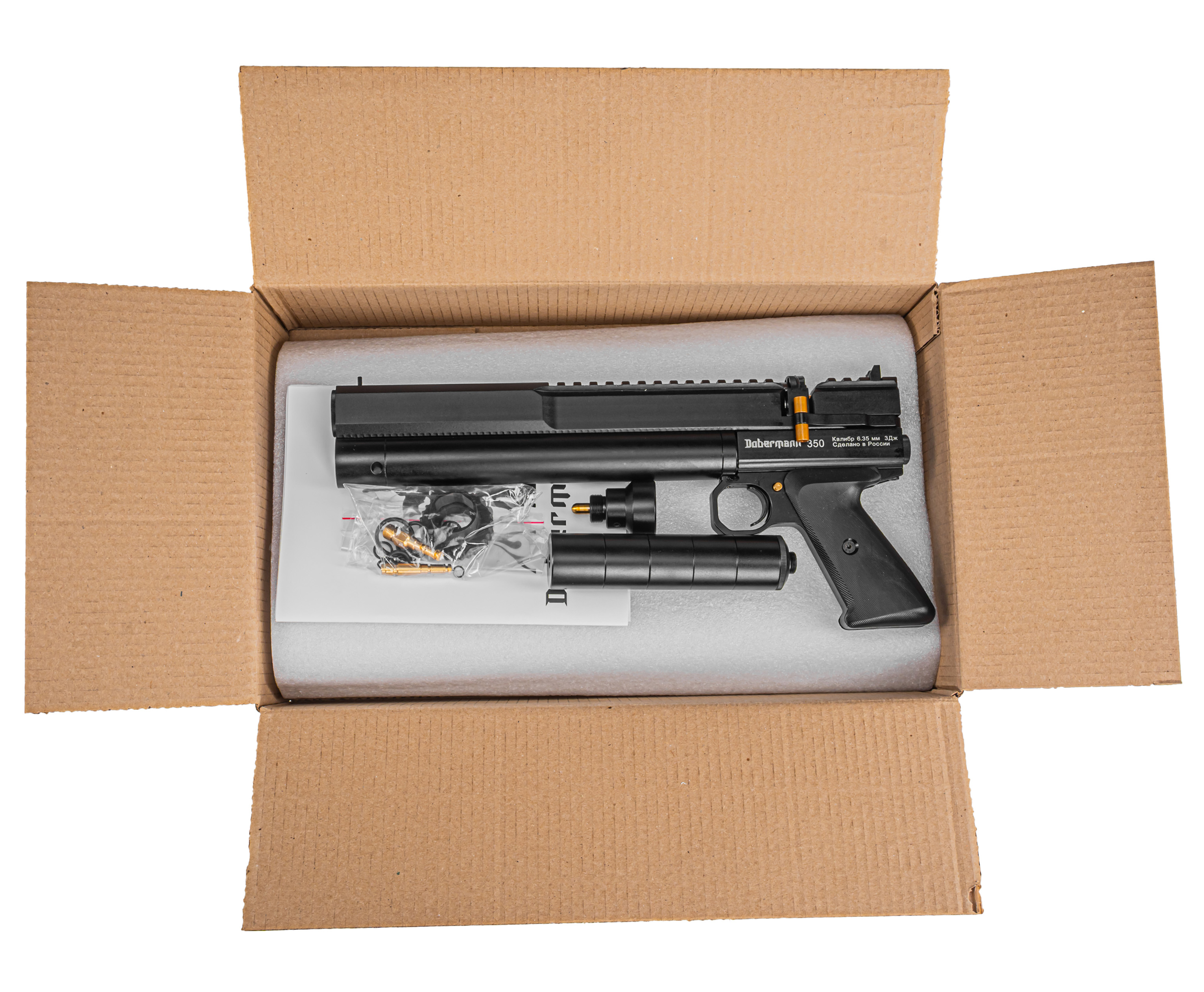 Представляющая отечественно производство компания Dobermann заслуженно завоевала популярность у потребителя. Фирма славится вниманием к деталям, а ее изделия зарекомендовали себя как надежные и простые в обращении экземпляры оружия. Пополняя линейку пневматических пистолетов Доберман 350 Эксцентрик изготовитель представил модель с увеличенным нарезным 250-и миллиметровым стволом со встроенным модератором звука, заглушающим громкость выстрела.