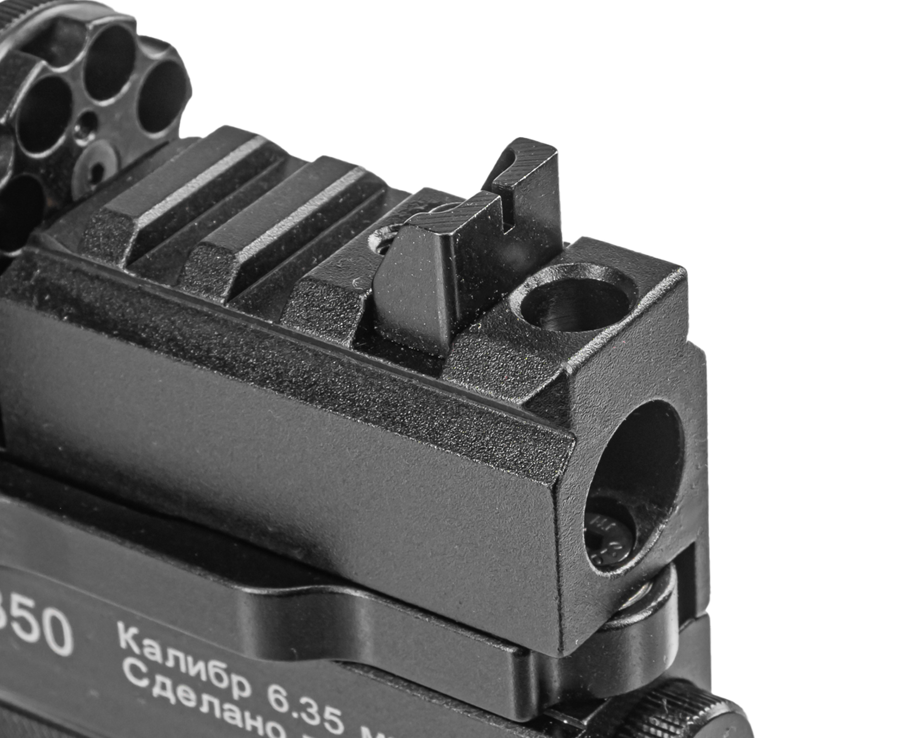 Для совершения наведения на цель Доберман ПСП 6.35 обладает открытой мушкой и целиком. Пистолет способен поражать мишени на дальнем расстоянии, ввиду чего конструкция предусматривает установку дополнительных прицельных приспособлений на планку «Ласточкин хвост». Отсутствие посторонних вибраций при выстреле и слабая отдача подразумевают монтаж высокоточных оптических приборов, расширяющих возможности пневматического пистолета.