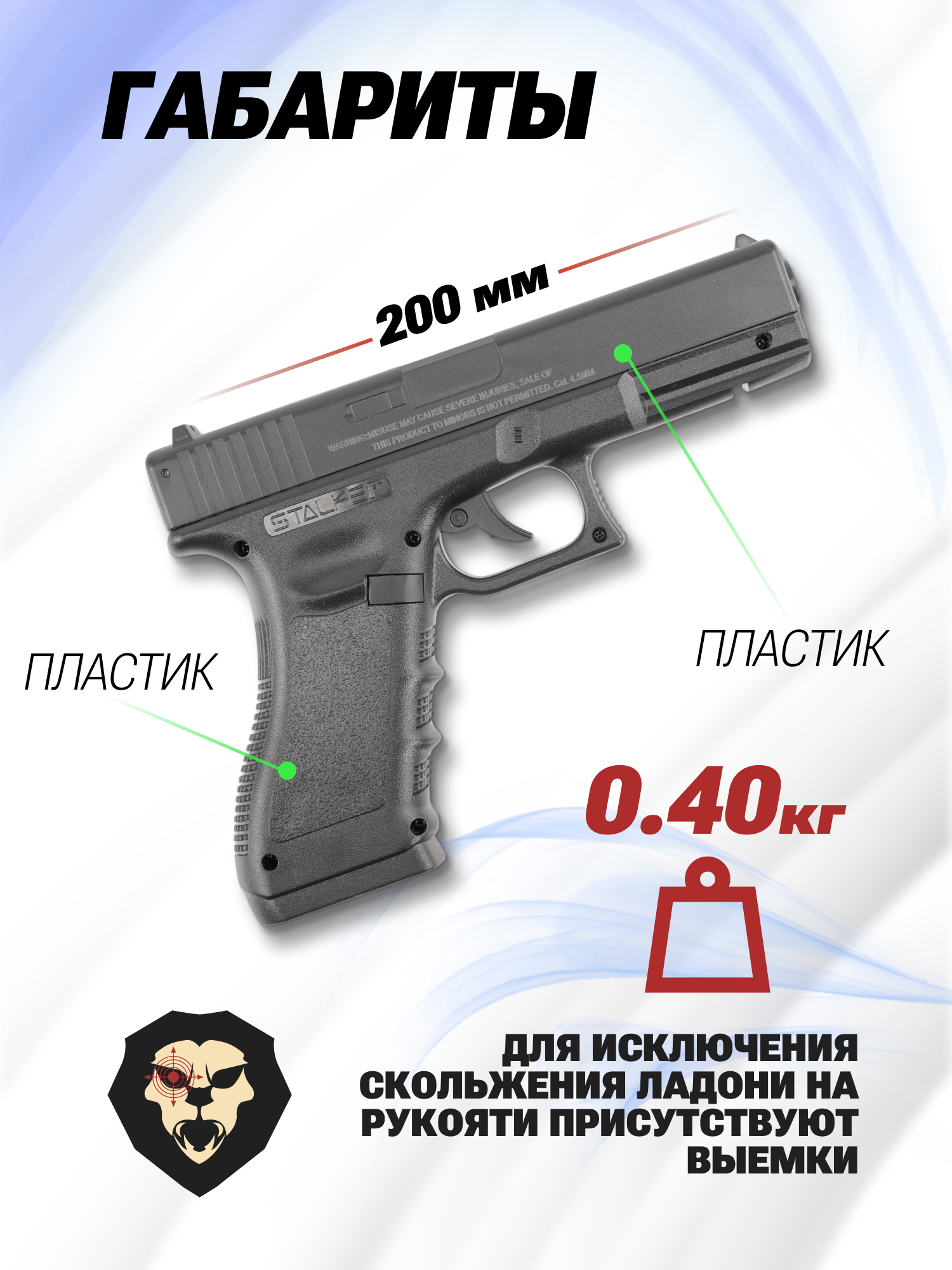 Stalker пневматический пистолет Glock 17 имеет магазинное питание, что обуславливает бесперебойную подачу шариков в ствол. Штатный накопитель отмыкается боковой клавишей возле скобы и вмещает до 20 зарядов. Досылание происходит за счет подпружиненного бегунка.