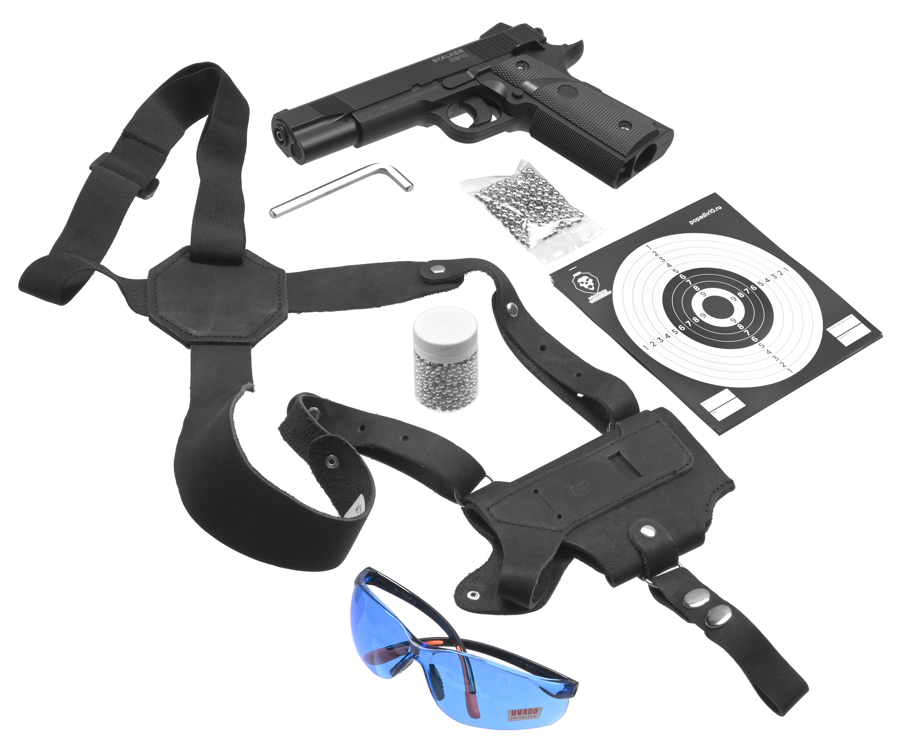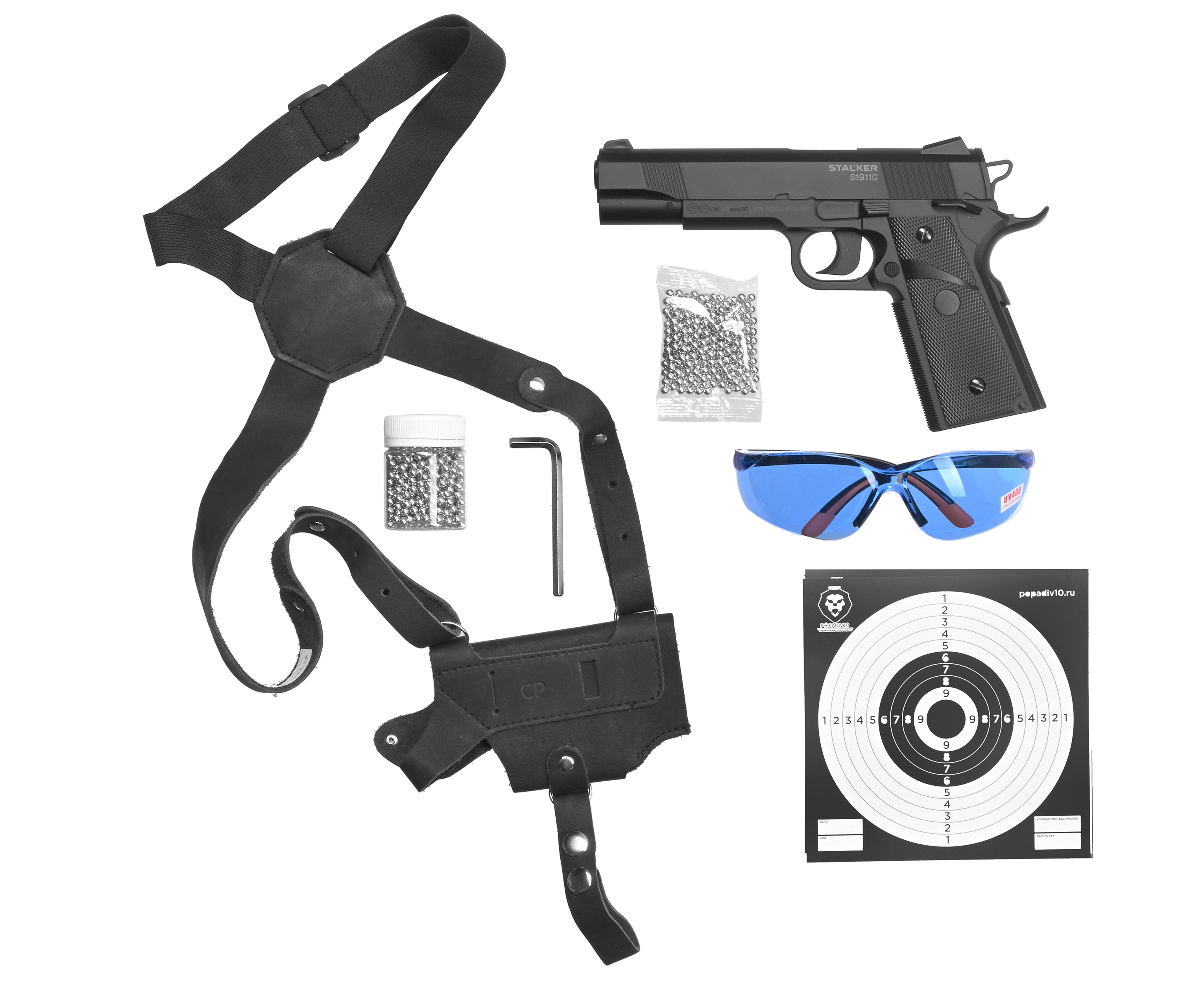 Пистолет пневматический Stalker S1911G 4.5 мм комплект Hunter подарочный №3 (Colt 1911, 10 баллонов, 500 шаров, очки, 50 мишеней, кобура) купить в интернет-магазине Popadiv10.