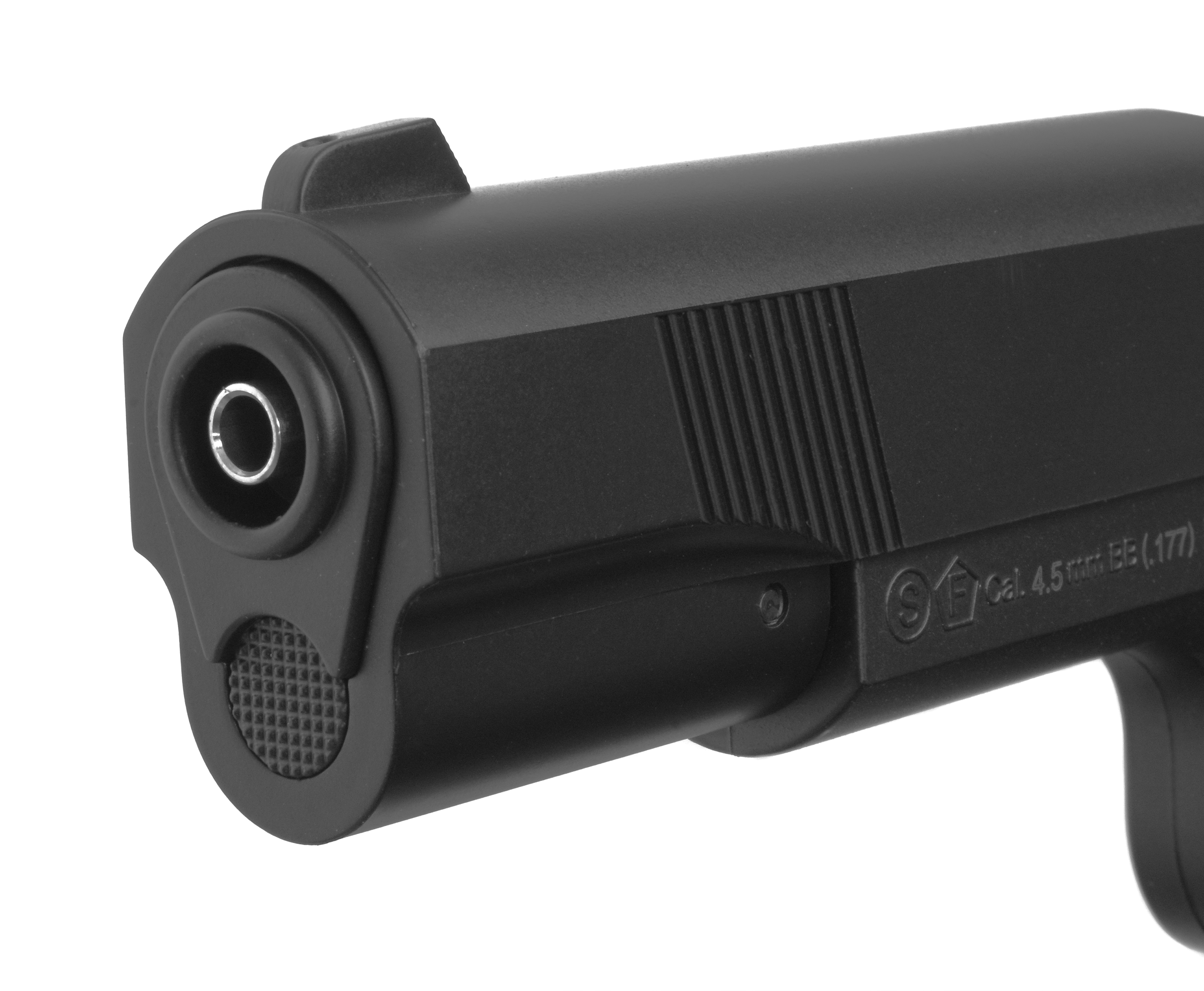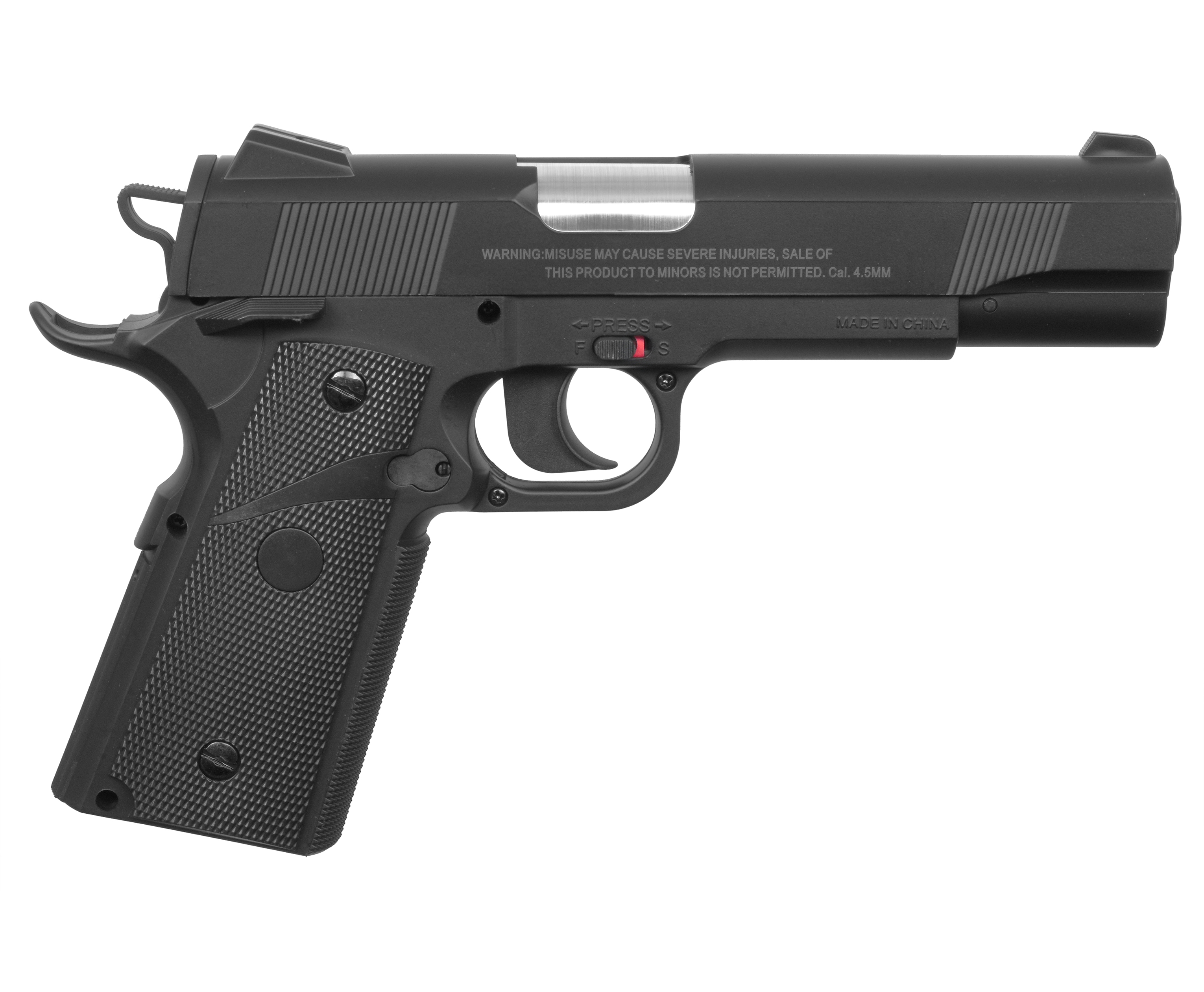 Пневматический пистолет Stalker 1911 рассчитан на стрельбу в полуавтоматическом режиме - скорость вылета шарика при этом достигает 120 метров в секунду. В то же время модель остается доступной каждому желающему - за счет заявленной мощности 3 Дж оформлять лицензию не нужно. Безопасное обращение обеспечивается предохранителем, вынесенным на правую часть рамы - переключатель дополнен цветовой индикацией для наглядного контроля текущего положения.