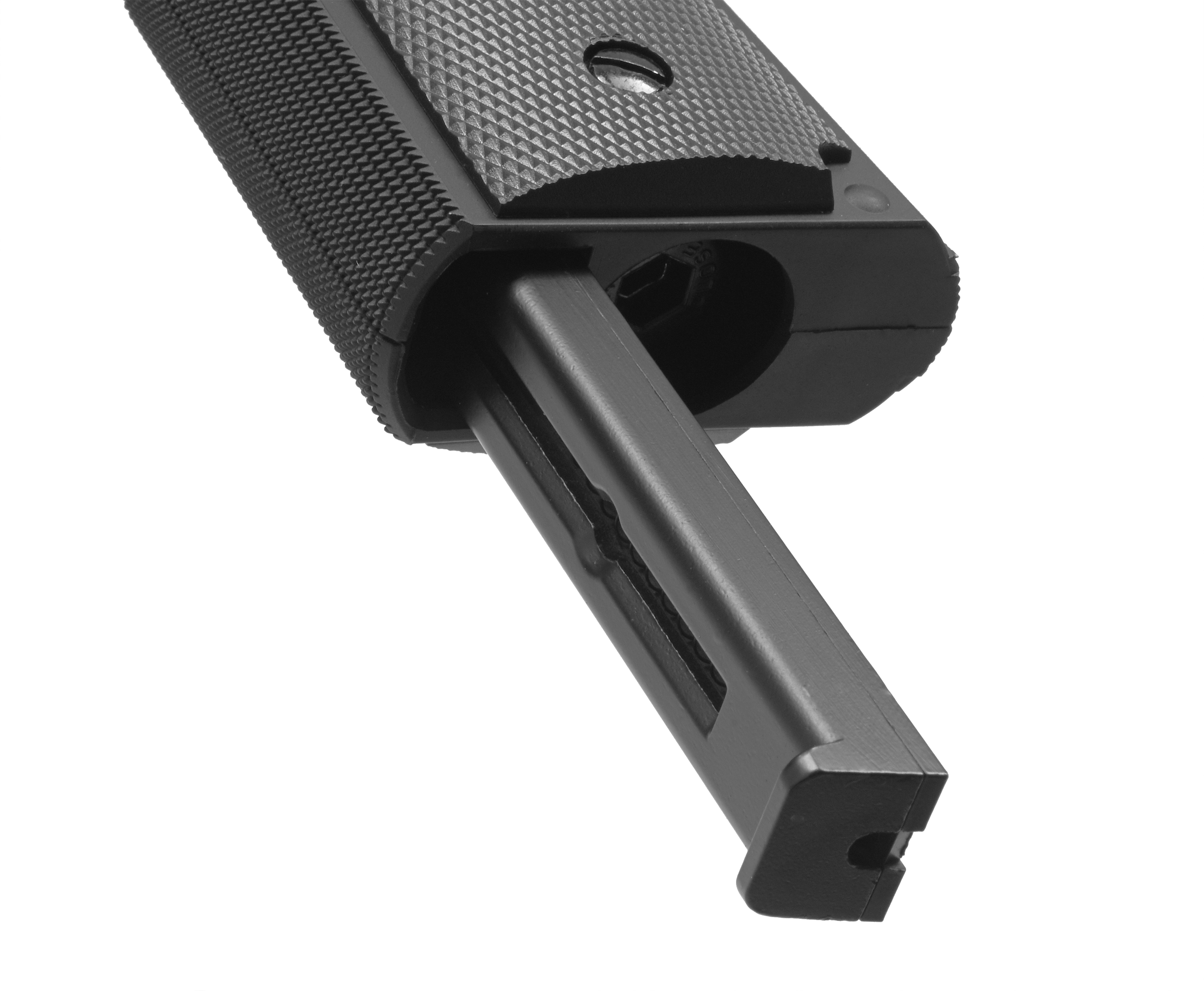 Для реализации подачи углекислого газа в систему пневматики необходимо установить баллон CO2 12 грамм внутрь рукояти. После размещения в соответствующем отсеке предварительно выкрученный поджимной винт требуется завернуть обратно. Это приводит к насаживанию носовой части резервуара на иглу клапана - закончившийся шипящий стравливающий звук является сигнализатором корректного проведения операции, после чего пистолет готов к работе.