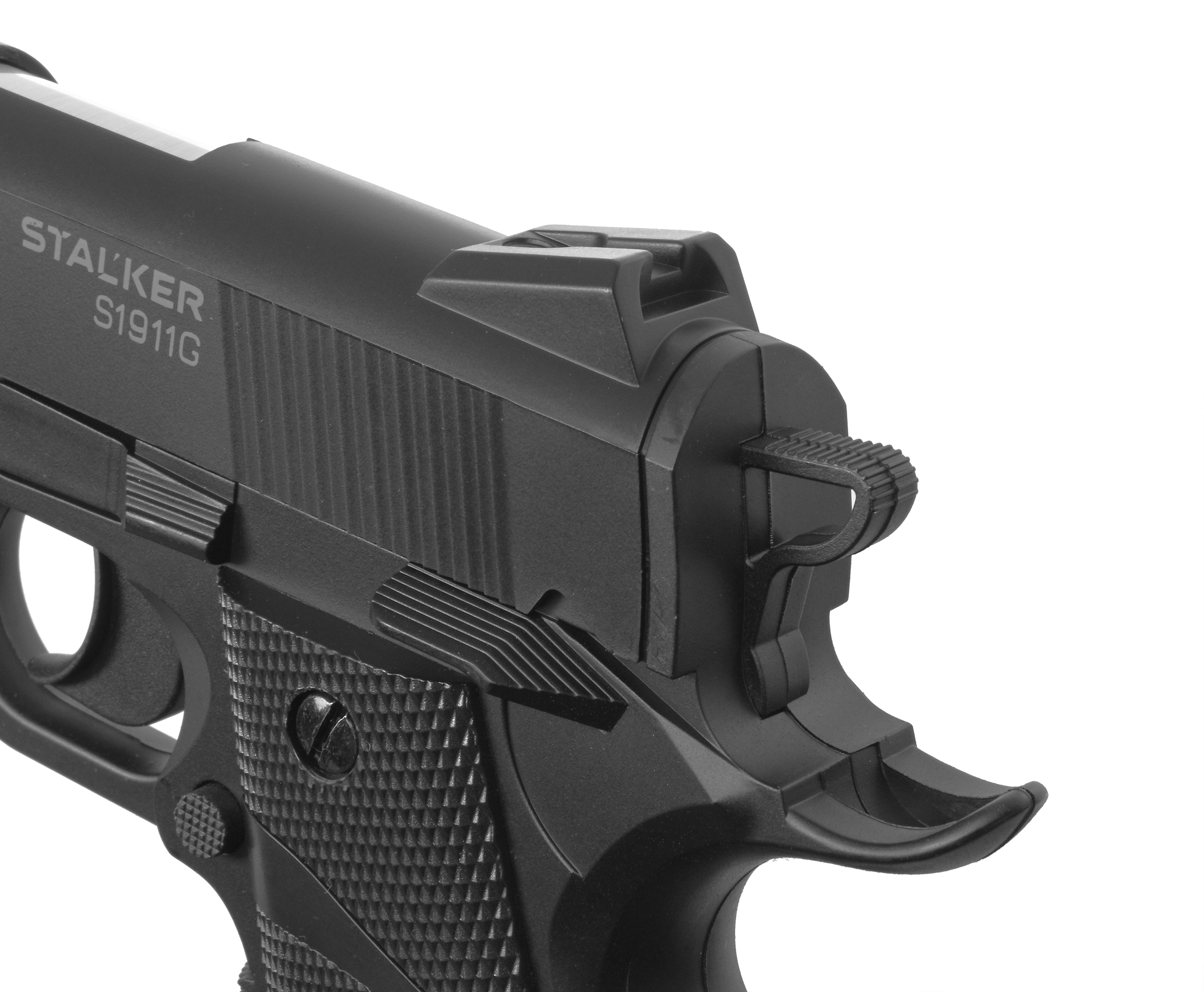 При создании пистолета источником вдохновения послужил знаменитый американский Кольт М1911. Пневматическая вариация фирмы Сталкер достоверно передает особенности боевого прототипа и при этом отличается легким весом. Масса в 400 грамм достигается благодаря использованию в качестве материала рамы и затвора современного пластика.