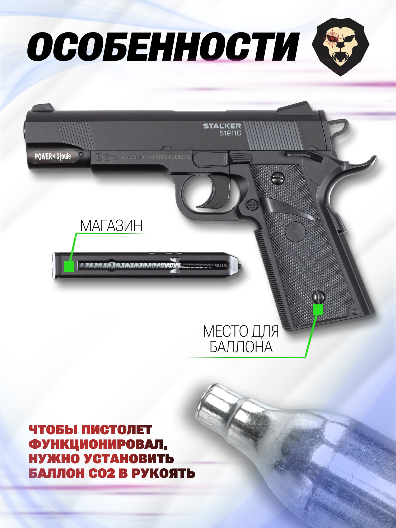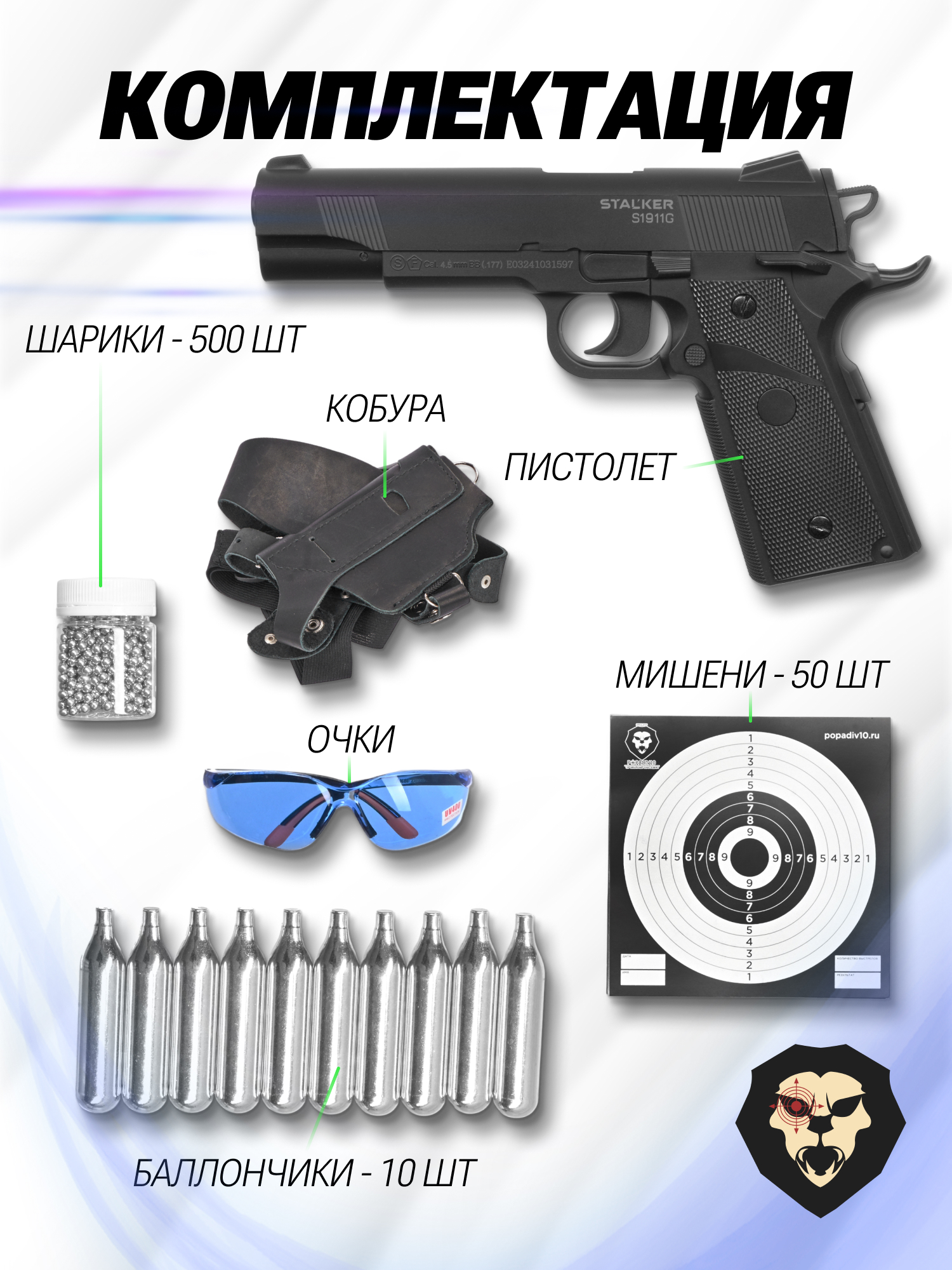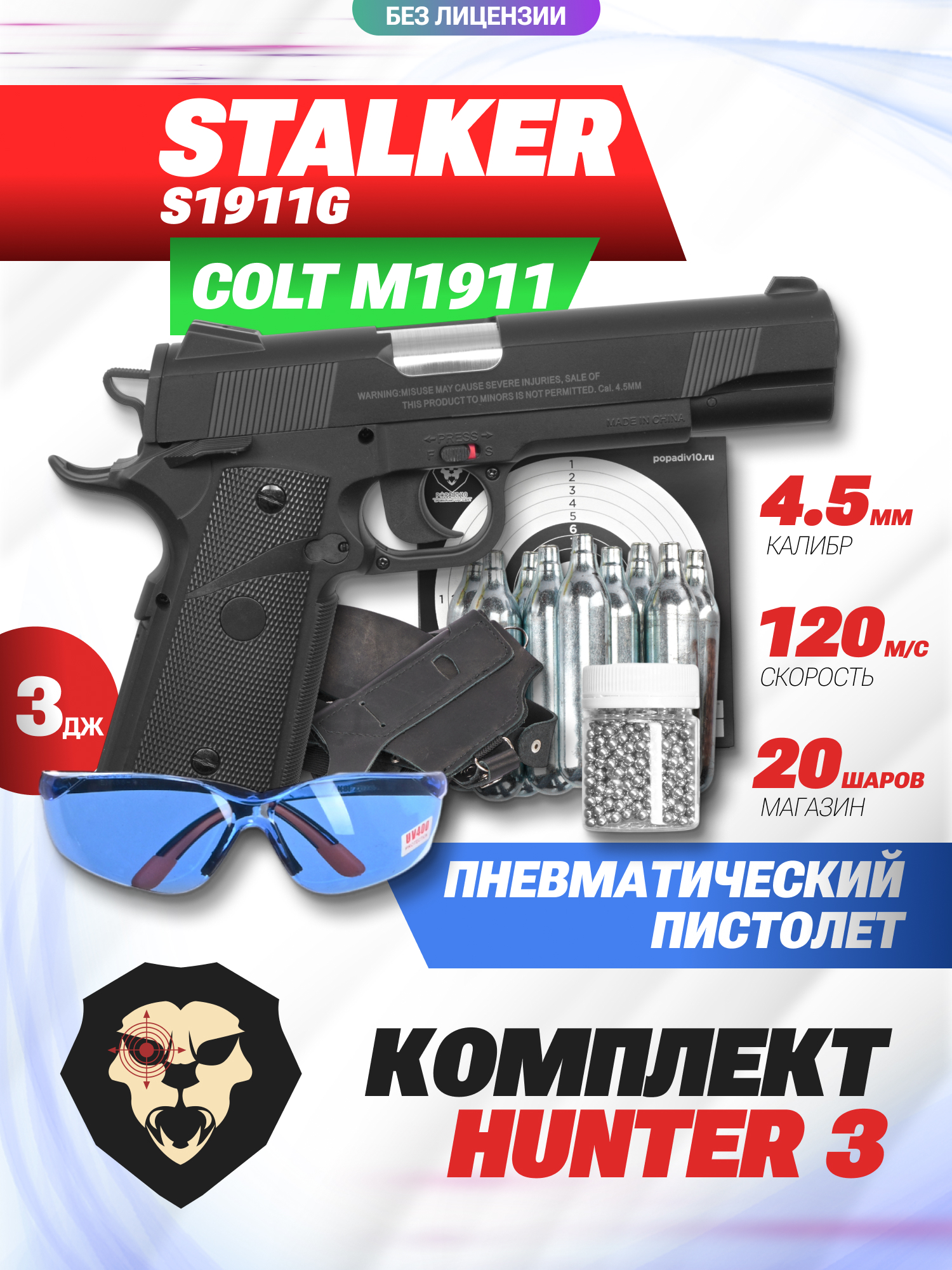 Пистолет пневматический Stalker S1911G 4.5 мм комплект Hunter подарочный №3 (Colt 1911, 10 баллонов, 500 шаров, очки, 50 мишеней, кобура) купить в интернет-магазине Popadiv10.