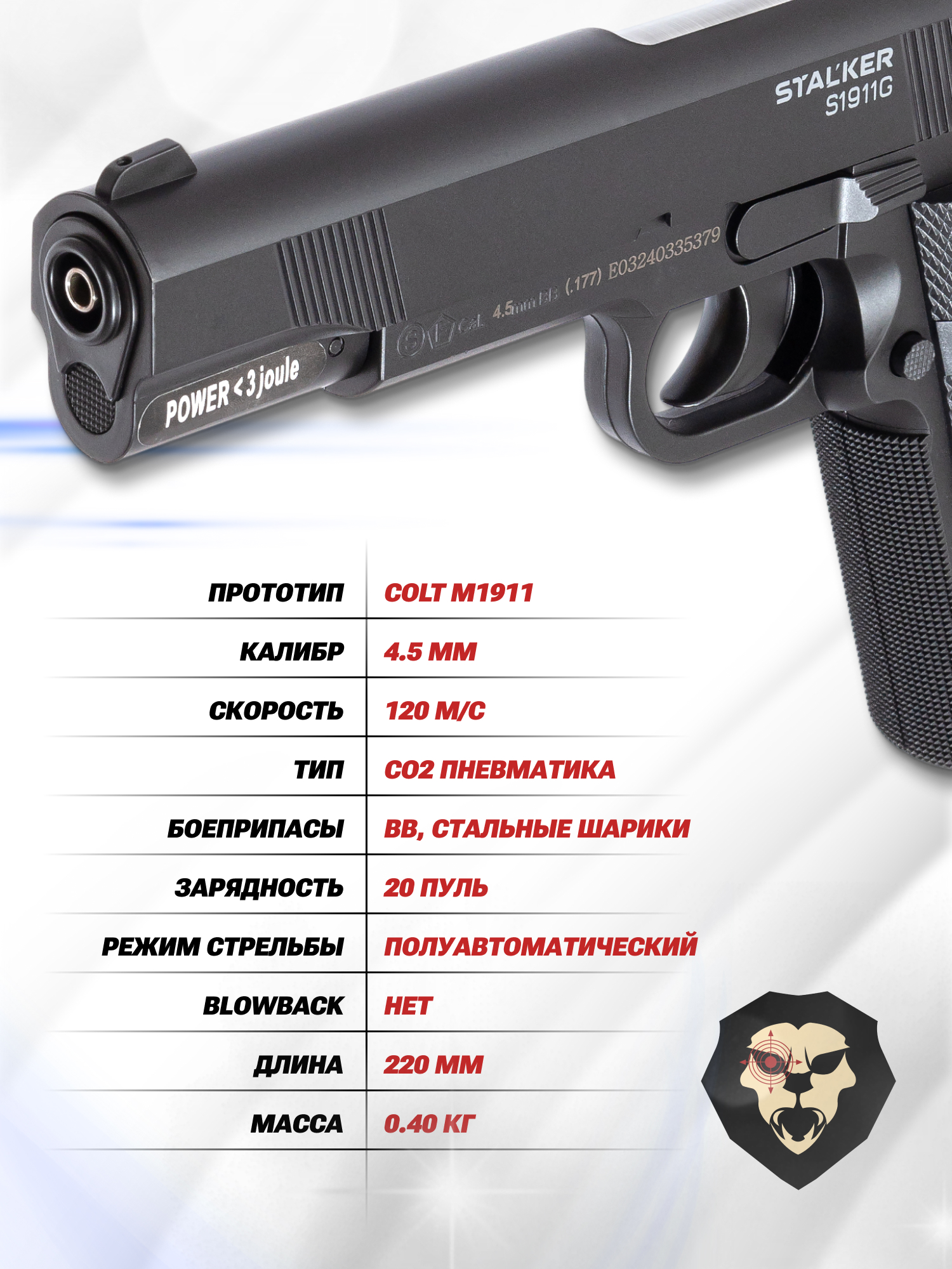 При создании пистолета источником вдохновения послужил знаменитый американский Кольт М1911. Пневматическая вариация фирмы Сталкер достоверно передает особенности боевого прототипа и при этом отличается легким весом. Масса в 400 грамм достигается благодаря использованию в качестве материала рамы и затвора современного пластика.