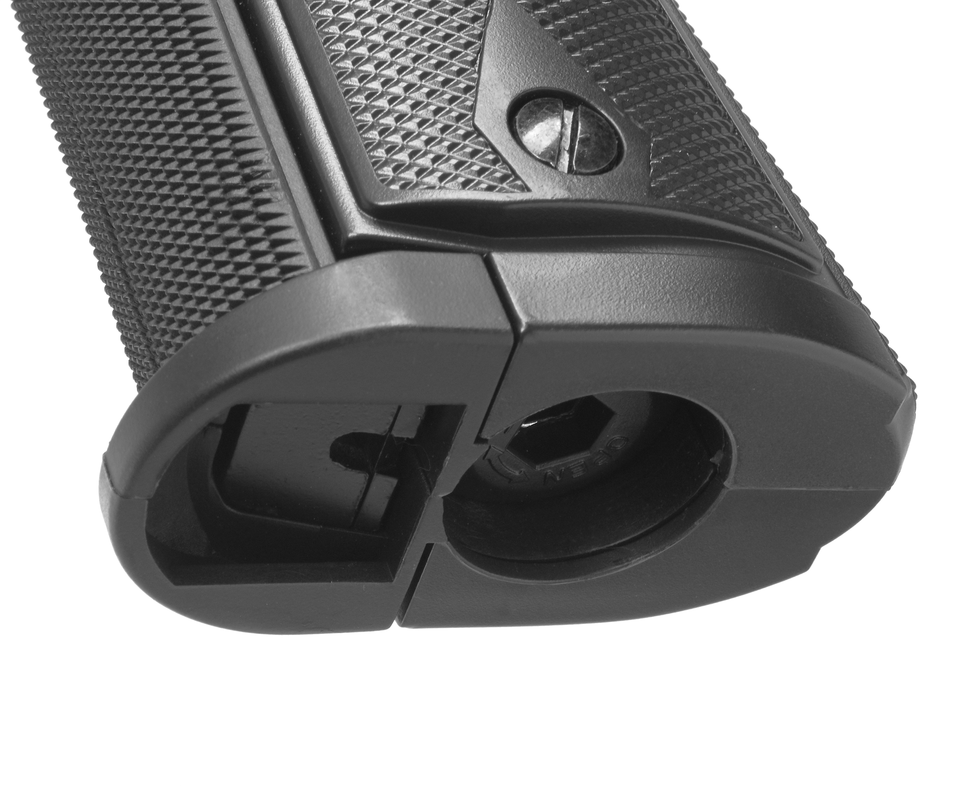 Затвор с рамкой представляют собой единую конструкцию, выполненную из полимера. Такое решение повысило прочность, и в тот же момент помогла сохранить небольшой вес - 540 грамм. Скорость полета пули в такой пневматике составляет 120 м/с, при этом лицензия не потребуется ввиду мощности до 3 Дж.