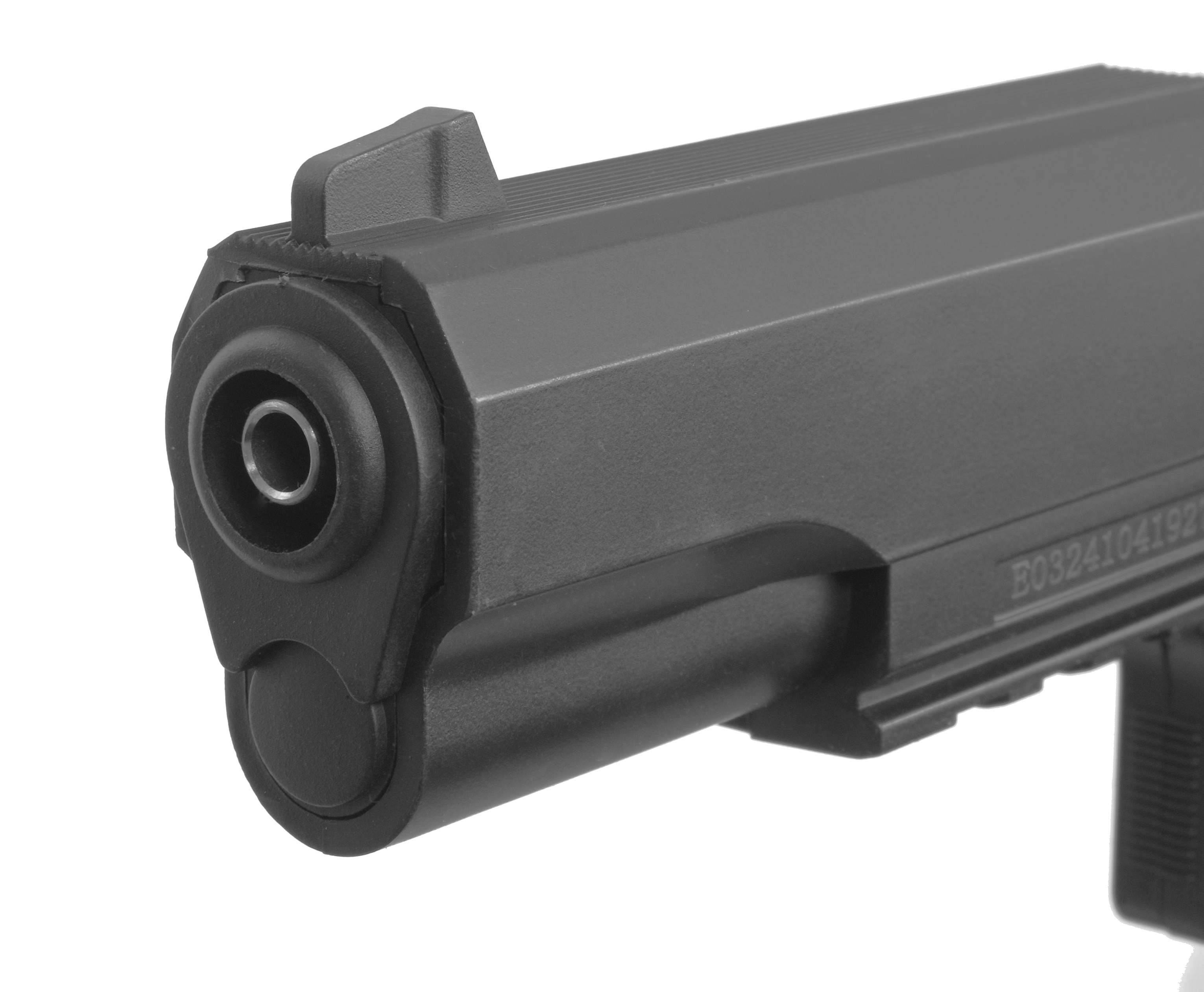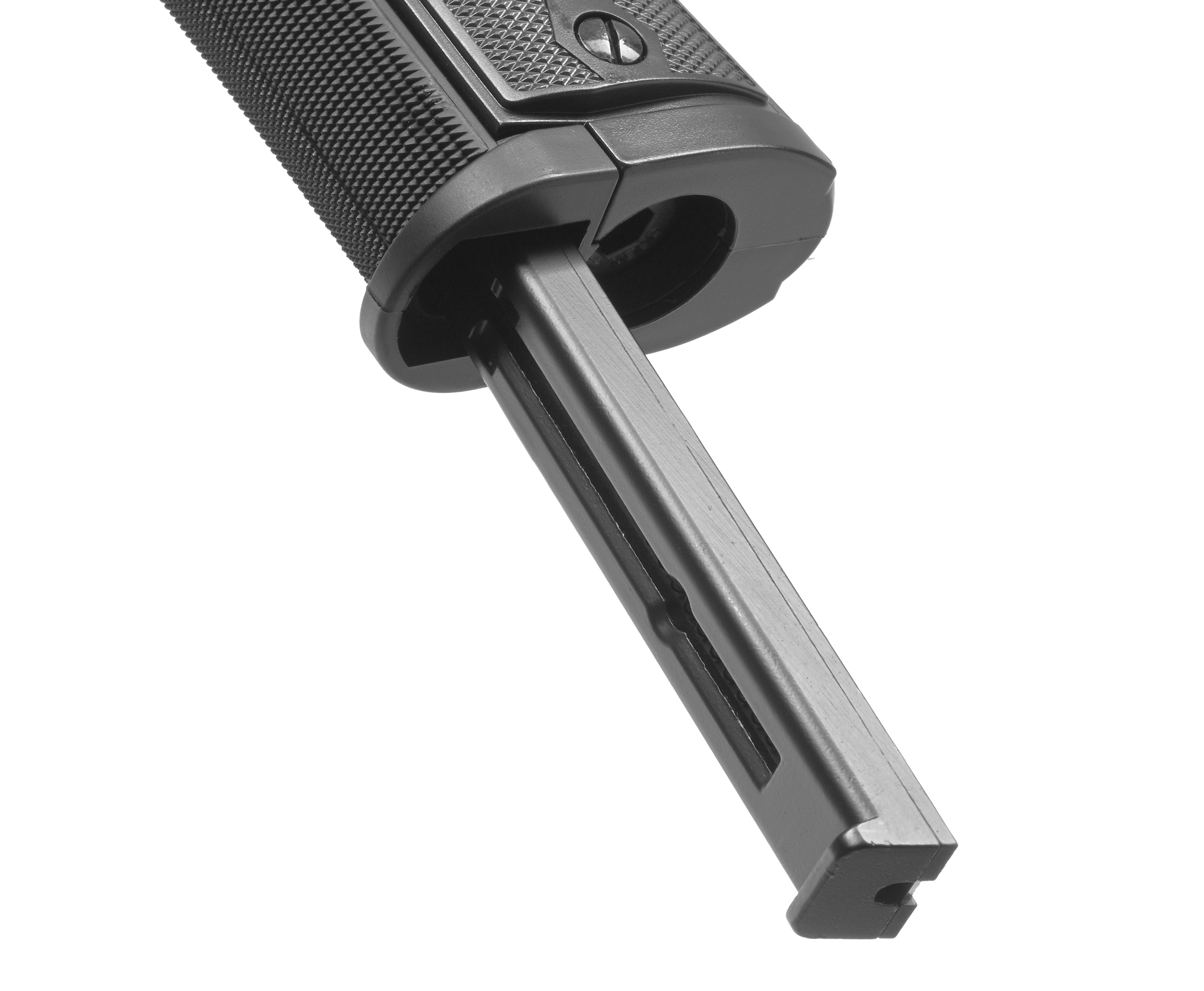 Помимо спринговой линейки компания также занимается изготовлением газобаллонных моделей, примером чего стал представленный Кольт 1911 пневматический. Образец работает за счет углекислотного баллончика - после открытия клапана ударно-спусковым механизмом газ проникает из емкости в ствол, придавая ускорение пульке. В этом случае применили классический 12 граммовый форм-фактор источника СО2 - распространенность обозреваемого стандарта ощутимо упрощает вопрос покупки расходника.