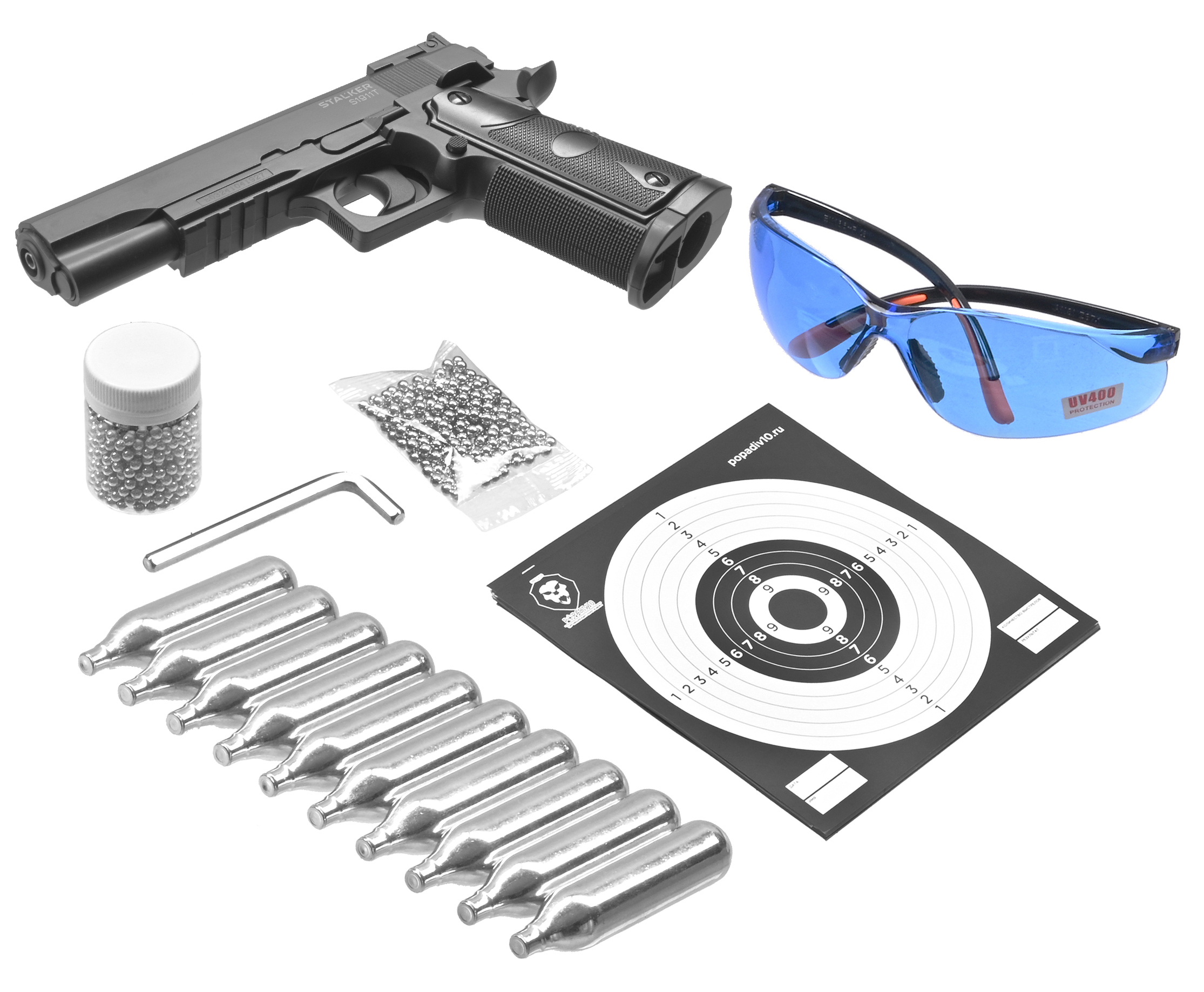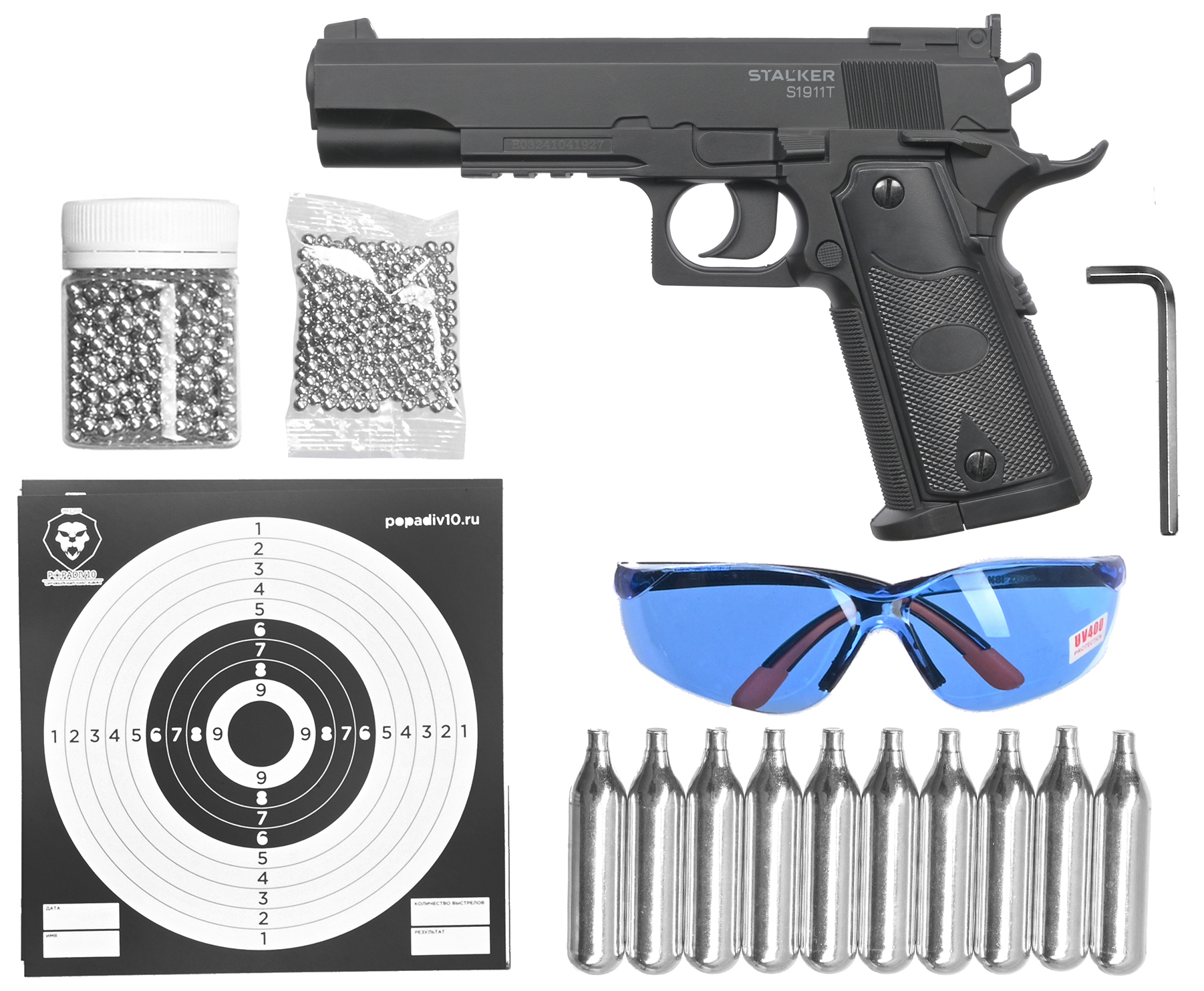 Пистолет пневматический Stalker S1911T комплект Hunter подарочный №2 (4.5 мм, Colt 1911, 10 баллонов, 500 шаров, 50 мишеней, очки) купить в интернет-магазине Popadiv10.
