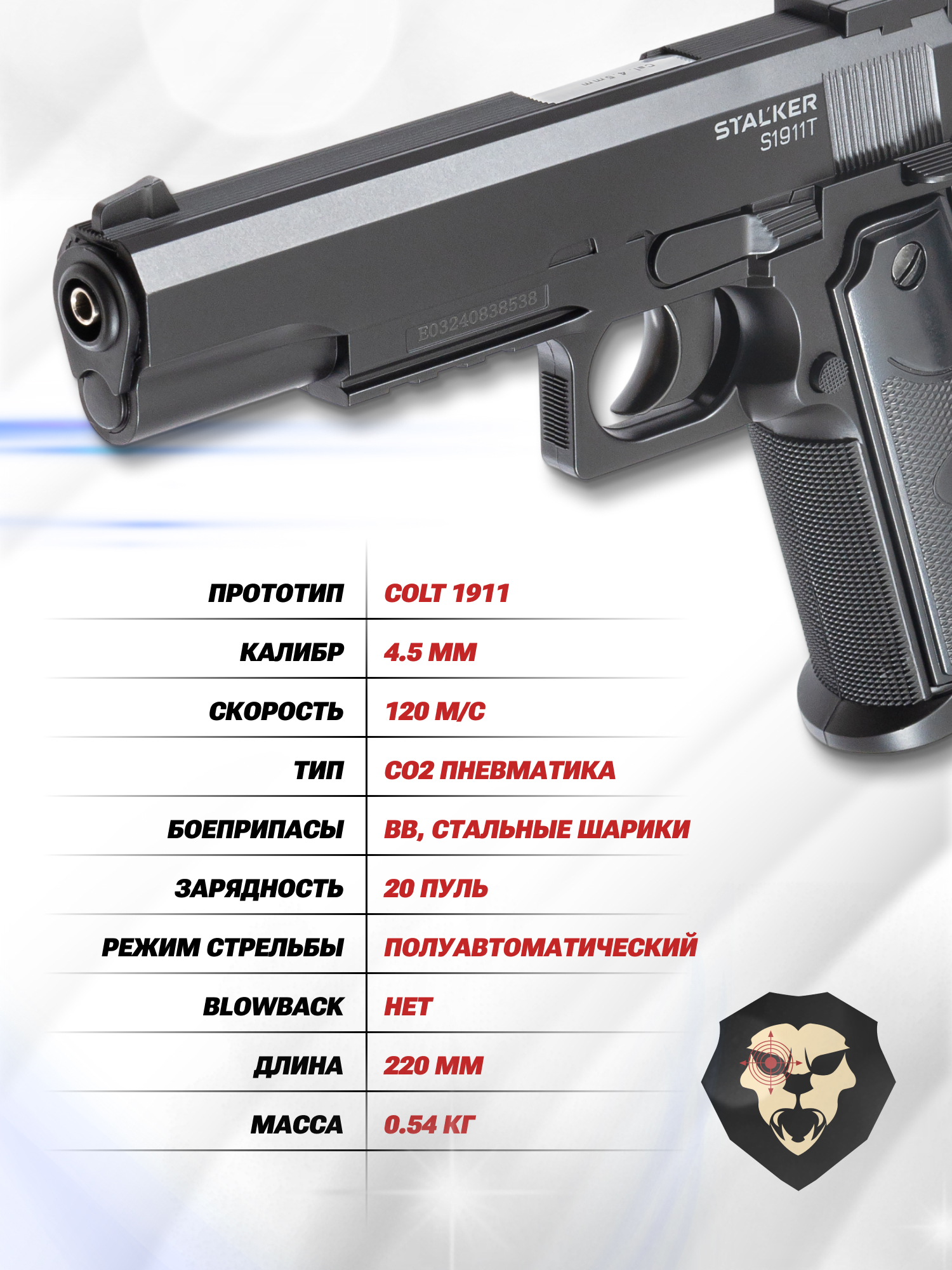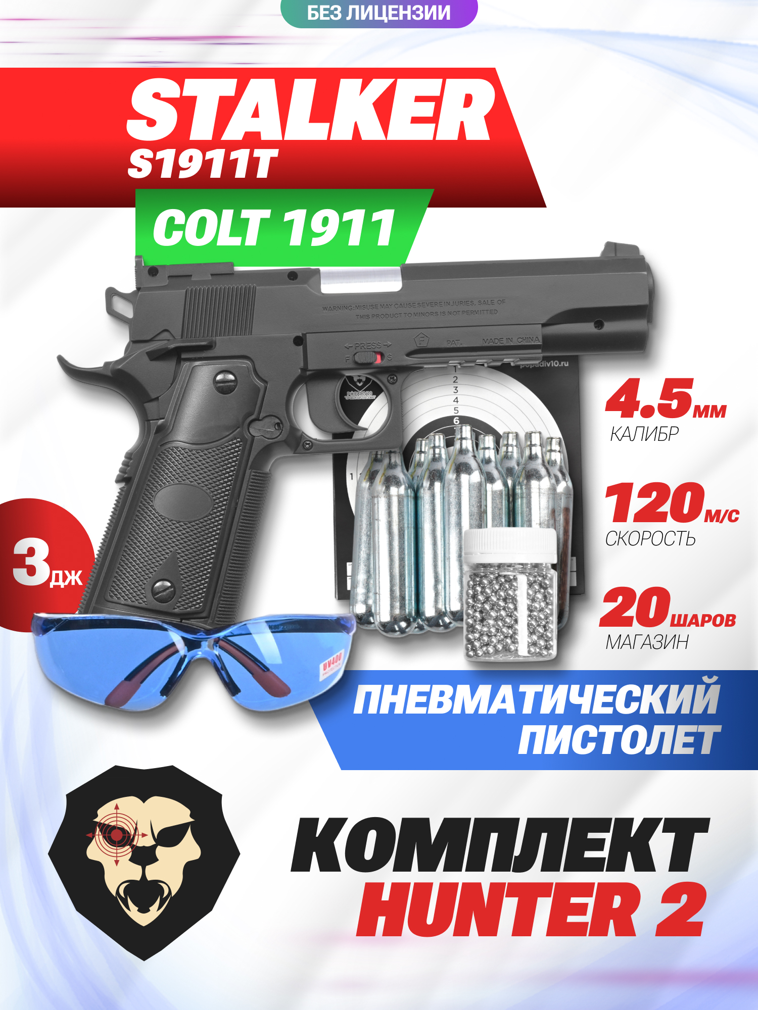 Информация о товаре "Пистолет пневматический Stalker S1911T комплект Hunter подарочный №2 (4.5 мм, Colt 1911, 10 баллонов, 500 шаров, 50 мишеней, очки)" носит ознакомительный характер, и не является публичной офертой, определяемой положениями Статьи 437 Гражданского кодекса Российской Федерации, характеристики, внешний вид, цвет и комплектация могут быть изменены производителем без уведомления.