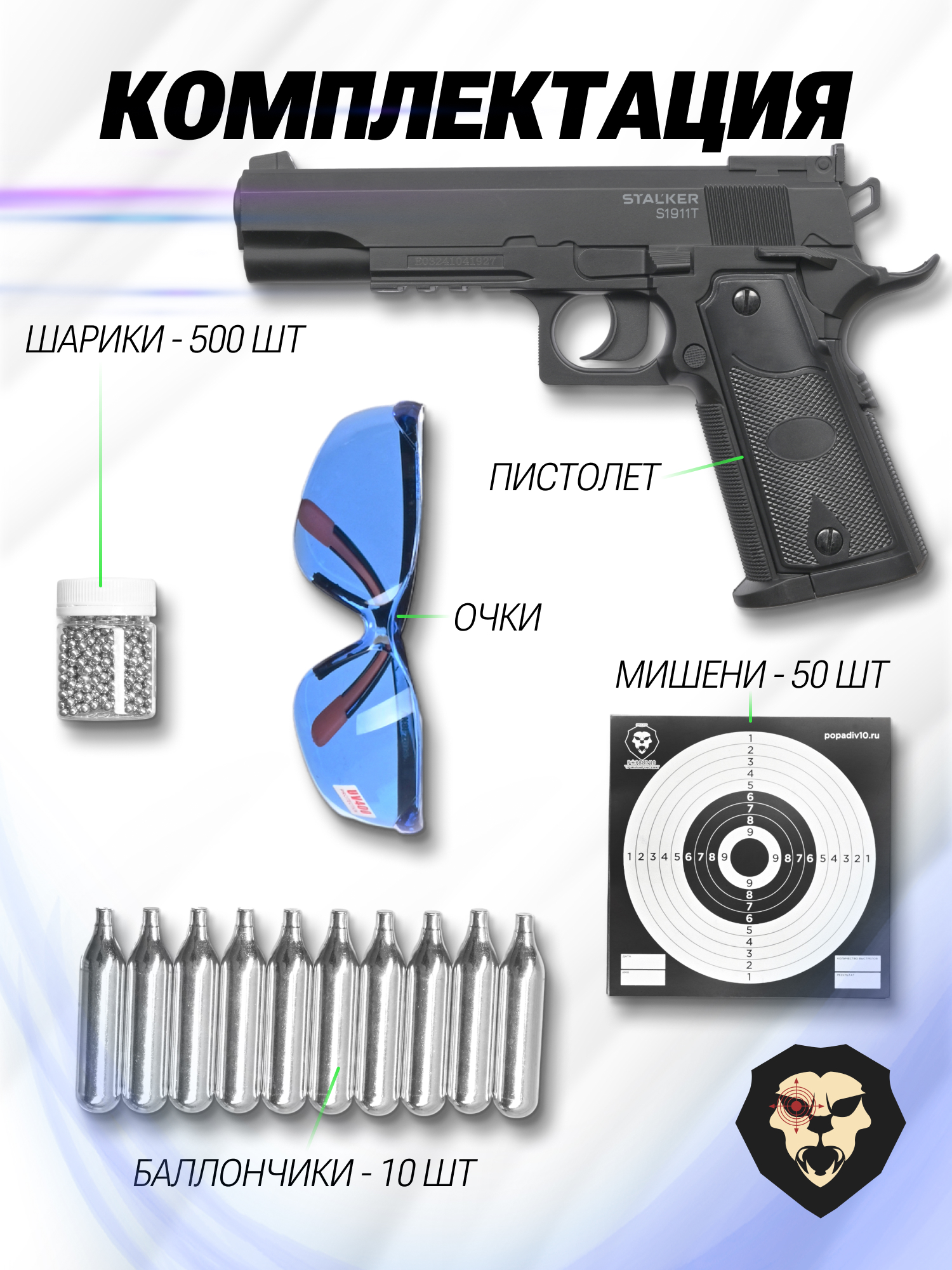 | Комплектация | Пистолет, 10 баллонов, 500 шаров, 50 мишеней, защитные очки, упаковка, ключ, шарики - 250 шт, краткая документация, копия сертификата (по запросу покупателя) |