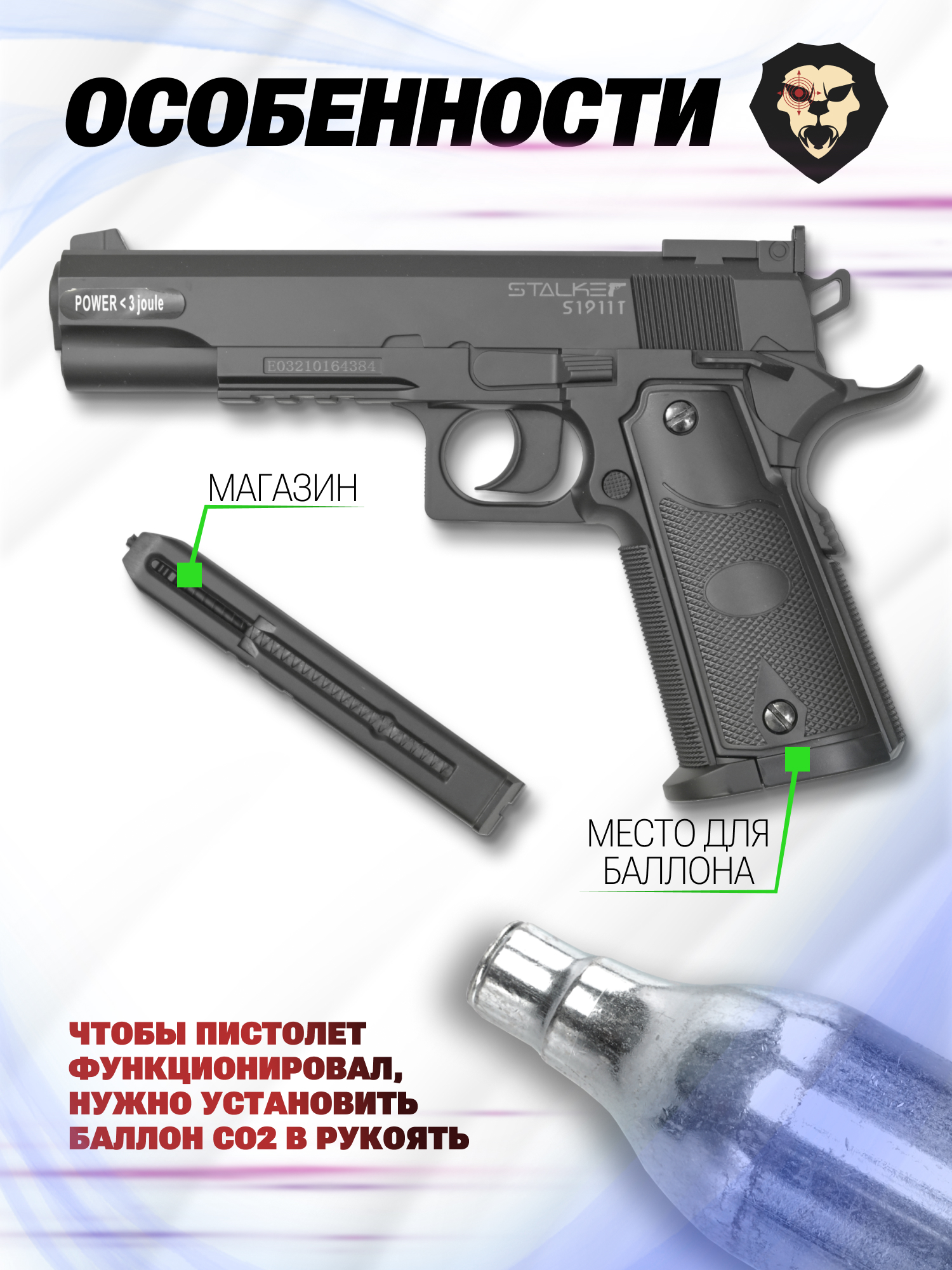 Пневматика работает от 12 граммовых баллончиков - металлических емкостей, в которые закачивают углекислоту. Размещение указанного картридж в рукоятке с последующим поджимом винтом приведет к наколу пломбы и газ попадет в расширительную камеру. После удара курка по клапану порция СО2 попадает в ствол и толкает шарик - учитывая двойное действие спускового механизма пневматический пистолет Stalker S1911T стреляет в полуавтоматическом режиме.