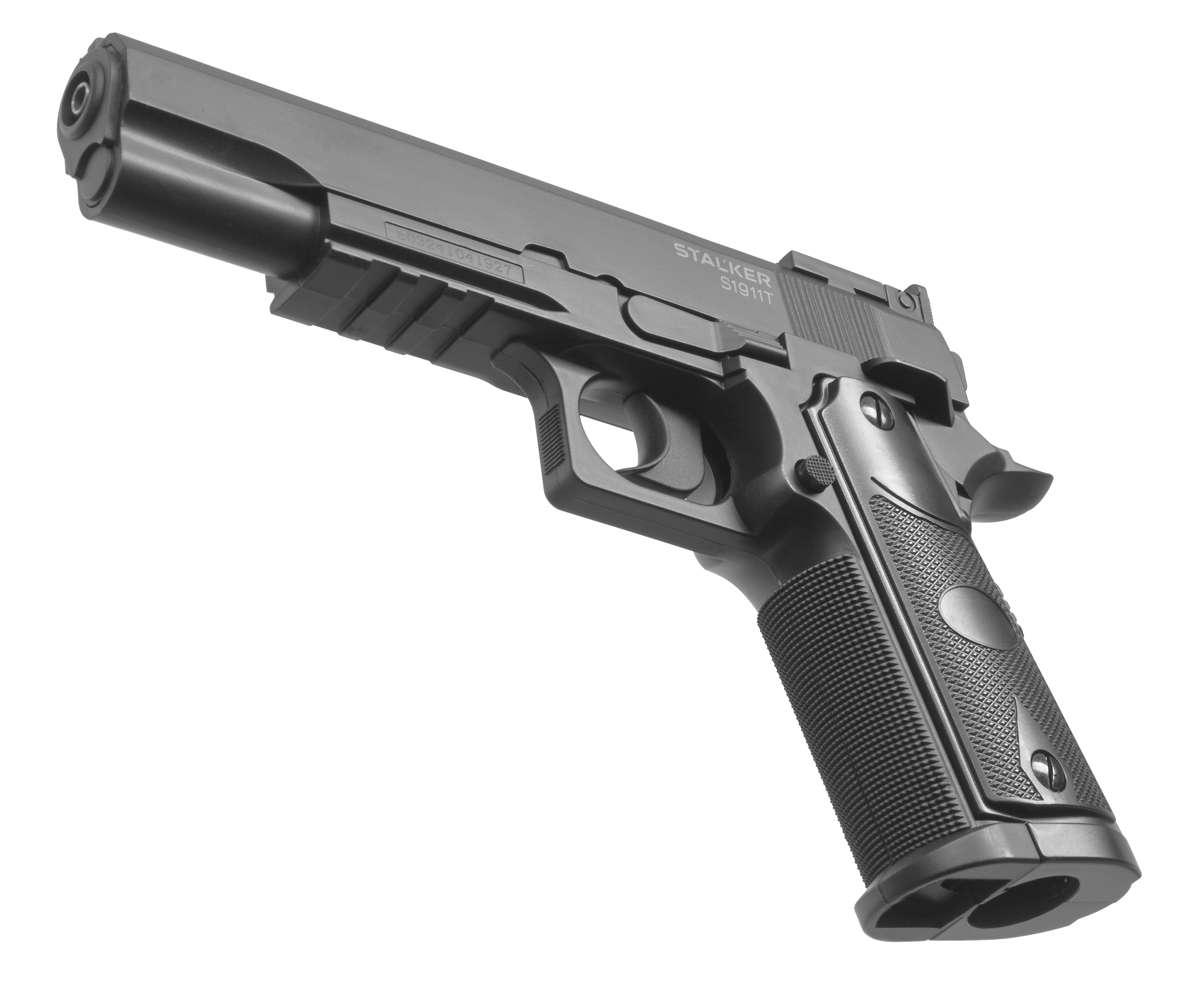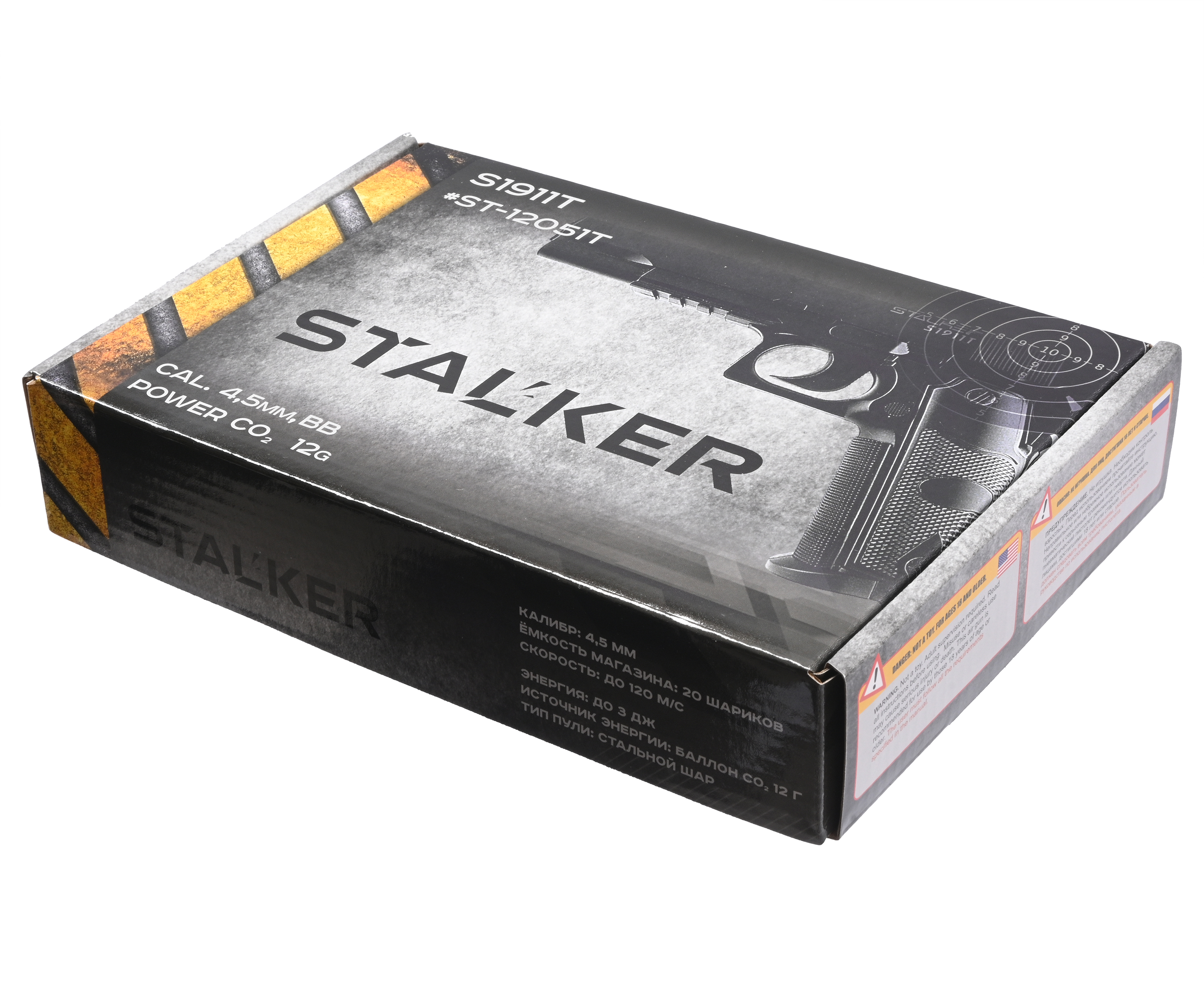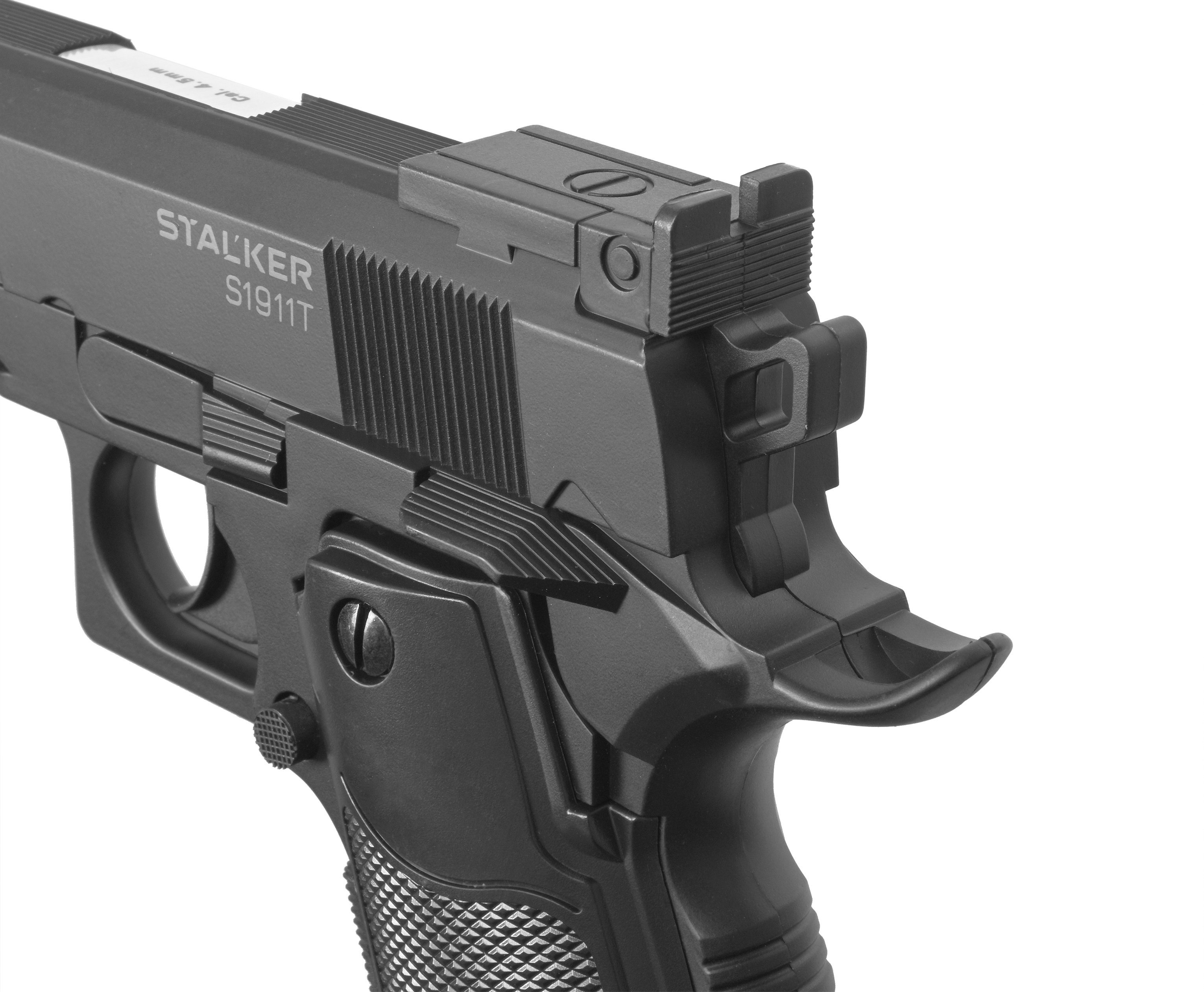 Набор подобрали под Сталкер Кольт пневматический пистолет в исполнении S1911T. Внешность пистолета повторяет таковую у модифицированных вариаций этой платформы. Форма рукояти и спусковой скобы стали выраженные, а под стволом появилась планка Вивера стандарта 22 мм - на нее можно будет смонтировать лазерный прицел или фонарь, что расширит функционал образца.