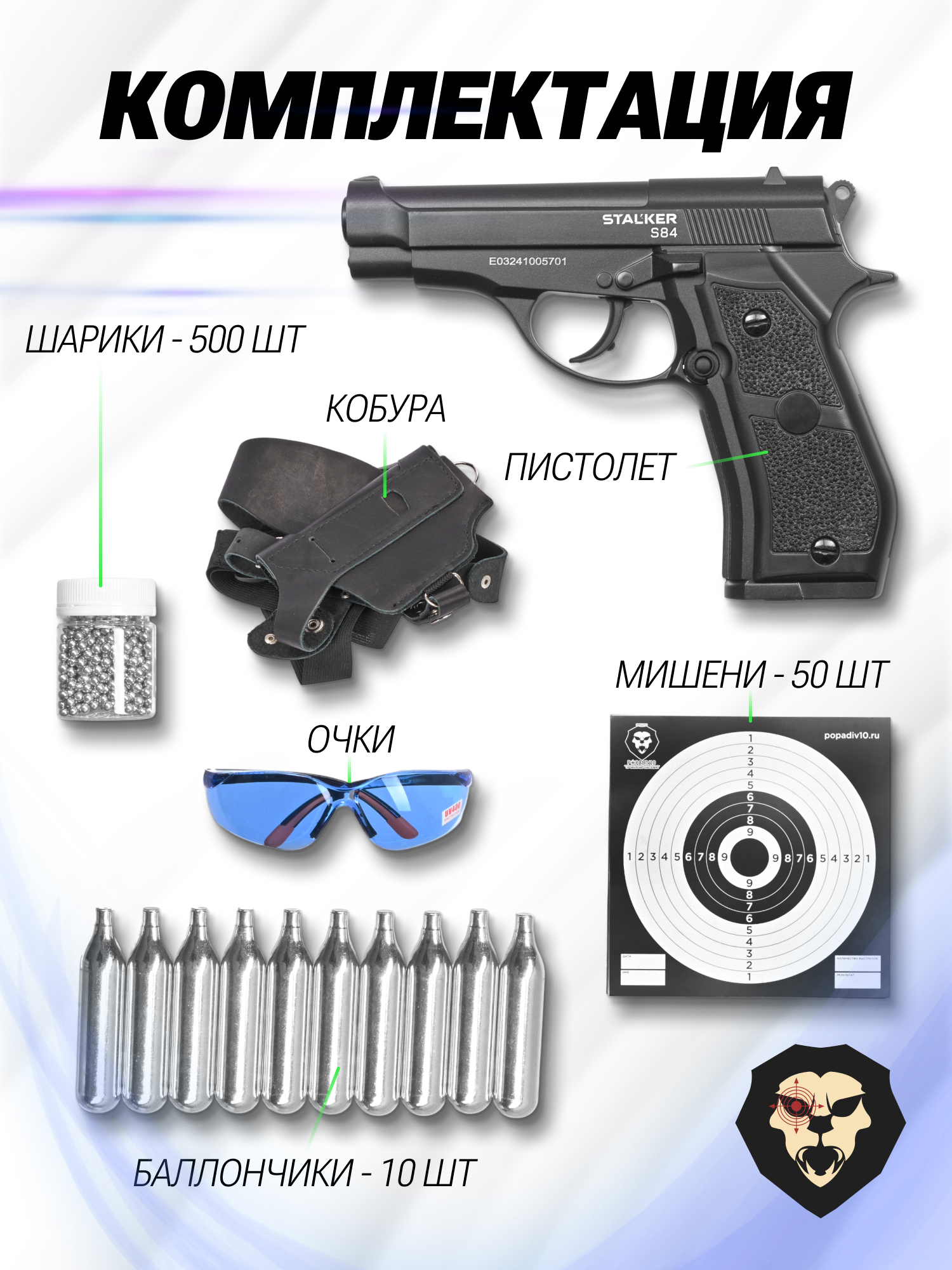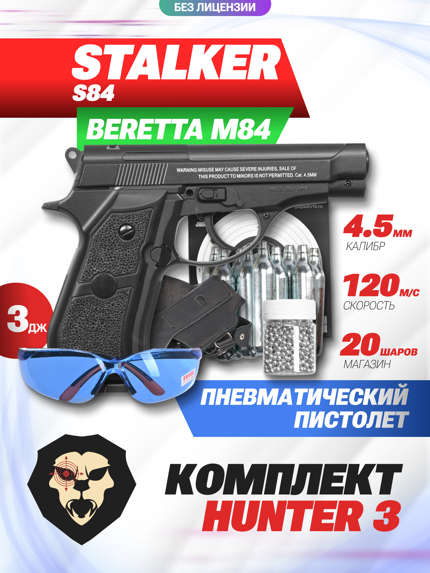 Пистолет пневматический Stalker S84 комплект Hunter подарочный №3 (4.5 мм, Beretta M84, 10 баллонов, 500 шаров, очки, 50 мишеней, кобура) купить в интернет-магазине Popadiv10.