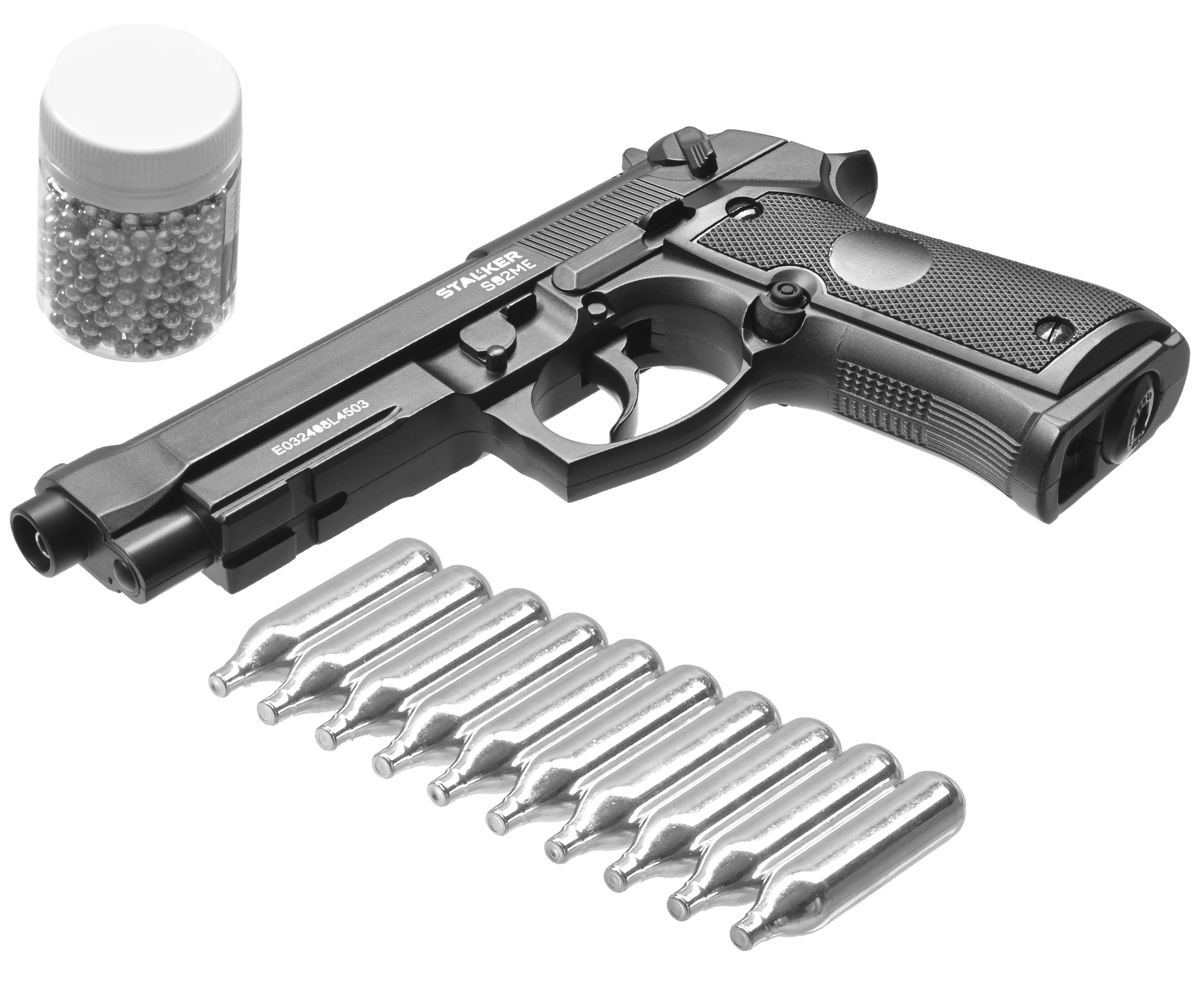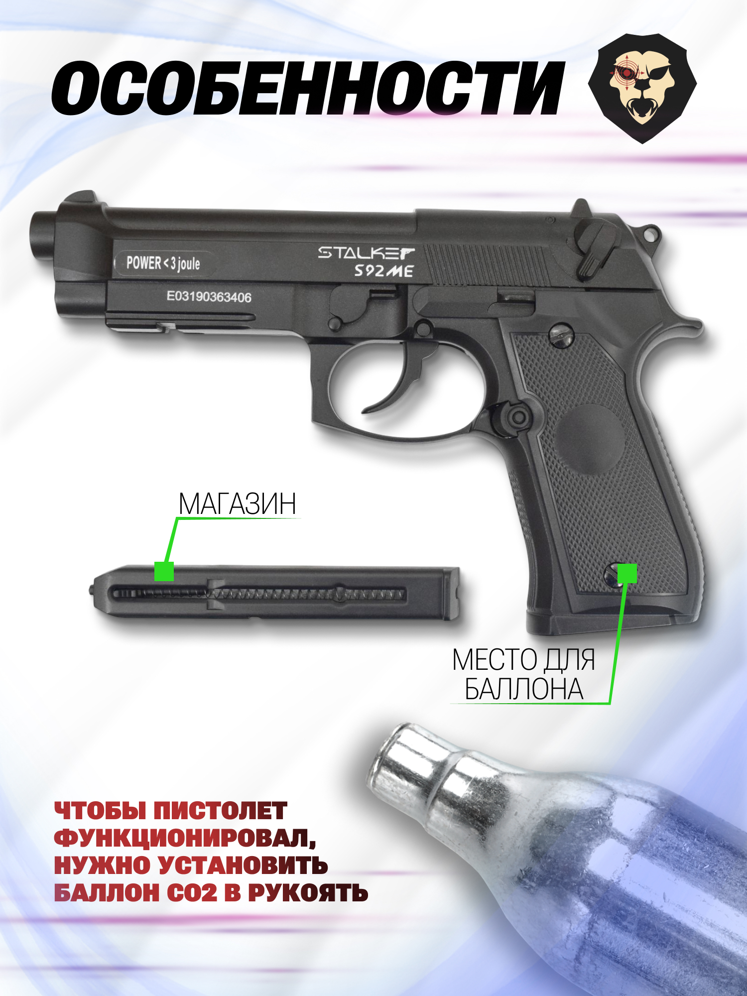 Опробовать пневматический пистолет Сталкер S92ME в действии можно сразу после покупки. Первое время не придется подбирать расходники, так как все необходимое входит в комплектацию Хантер. Так набор включает упаковку с 500 сферическими пулями, а также баллончики с газом в количестве десяти штук.