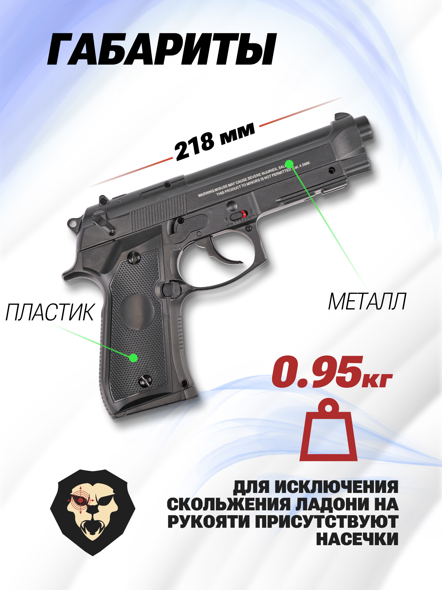 Ассортимент бренда включает экземпляры, выполненные по мотивам отечественного и западного огнестрельного оружия. Источником вдохновения для рассматриваемой модели стал пистолет Beretta итальянского производства. Пневматическая вариация выполнена в калибре 4.5 мм и рассчитана на стрельбу стальными шариками BB.