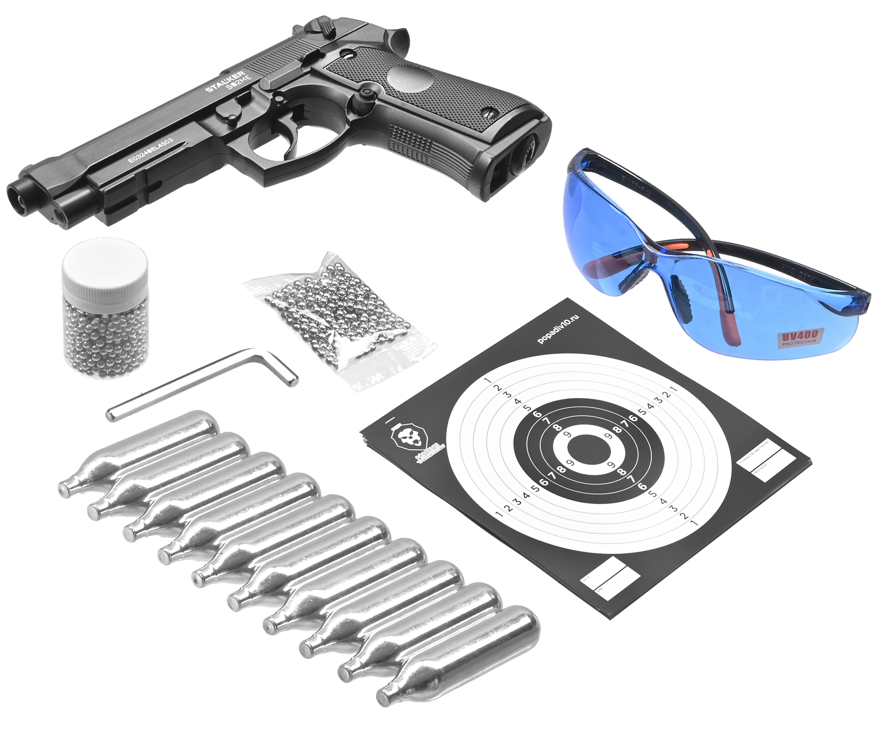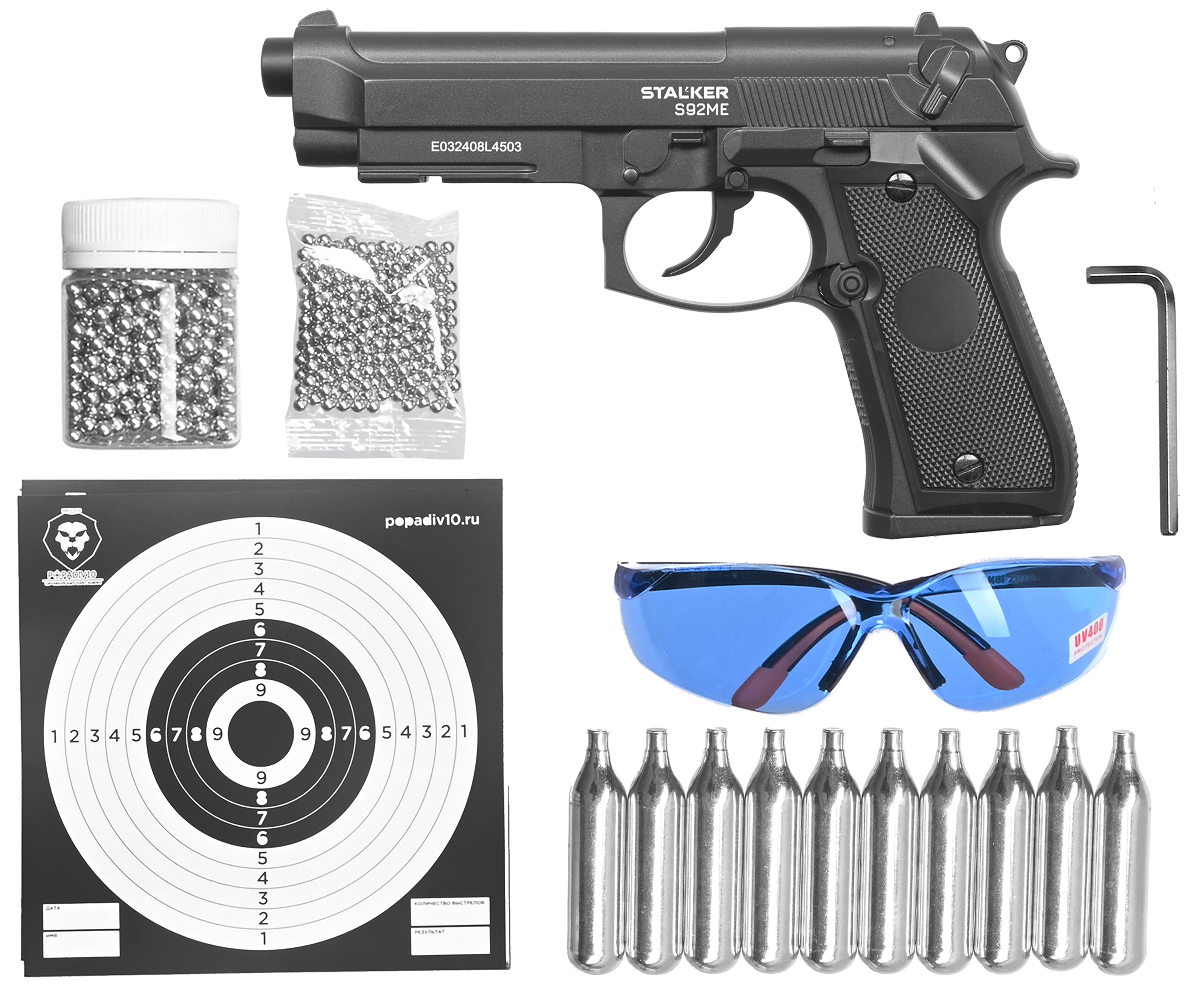 Пистолет пневматический Stalker S92ME 4.5 мм комплект Hunter подарочный №2 (Beretta 92, 10 баллонов, 500 шаров, 50 мишеней, очки) купить в интернет-магазине Popadiv10.