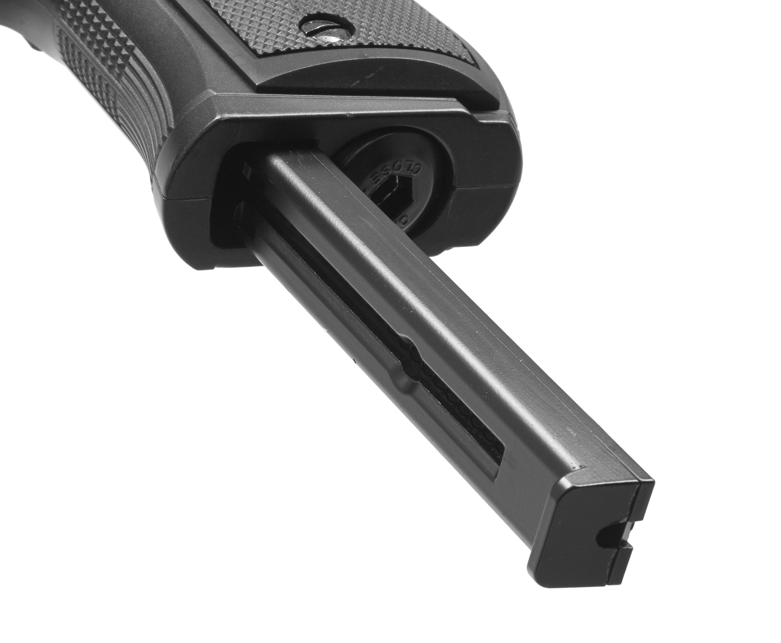 Метаемые снаряды подаются в приемник посредством отмыкаемого боковой кнопкой магазина. Штатный накопитель выделяется емкостью 20 шариков и оснащен подпружиненным бегунком-досылателем. Исходя из принципа устройства оружия, емкость с газом помещается непосредственно в рукоять - баллон 12 грамм CO2 нужно уложить в соответствующую нишу и затянуть поджимным винтом на пятке.