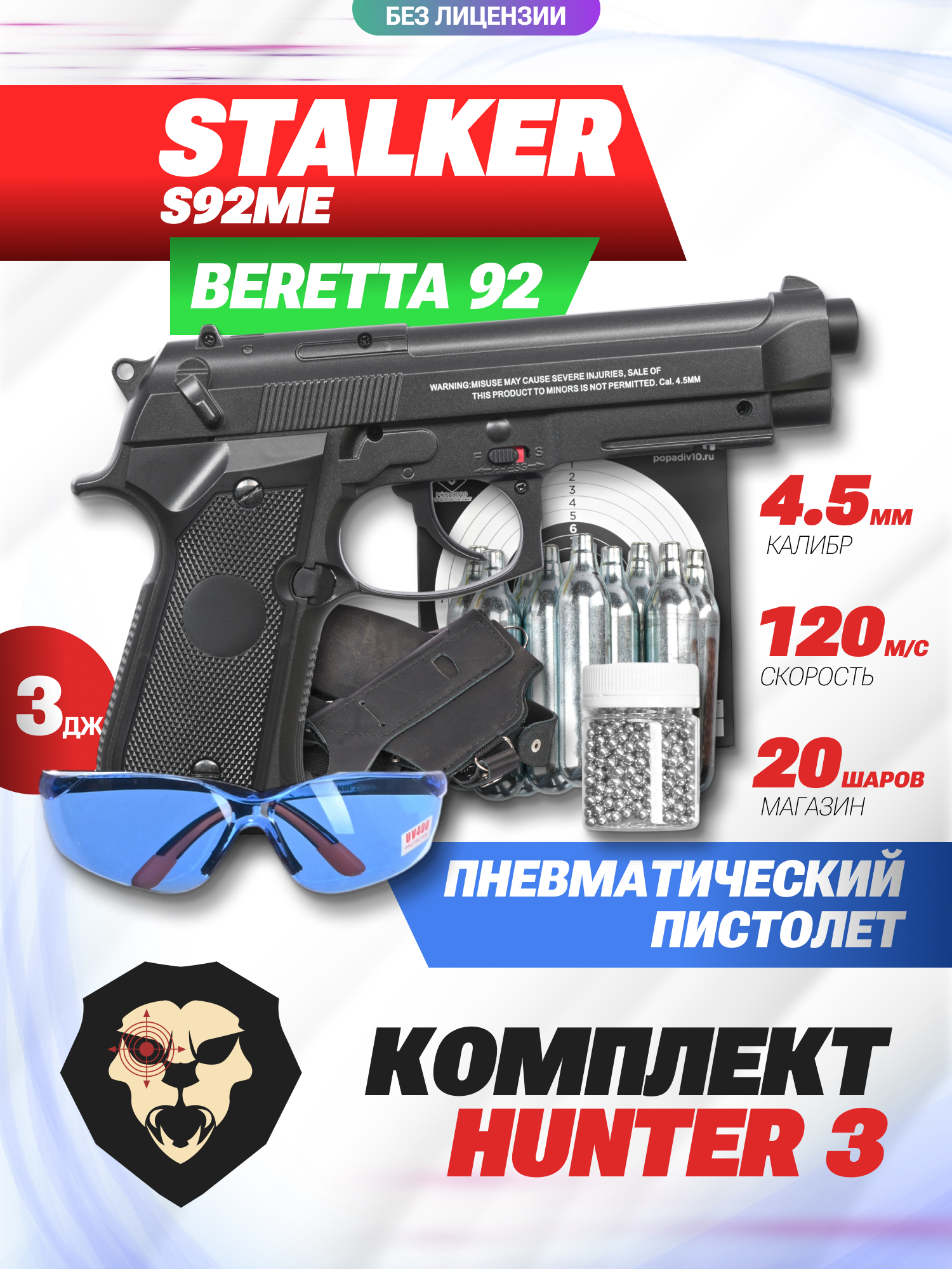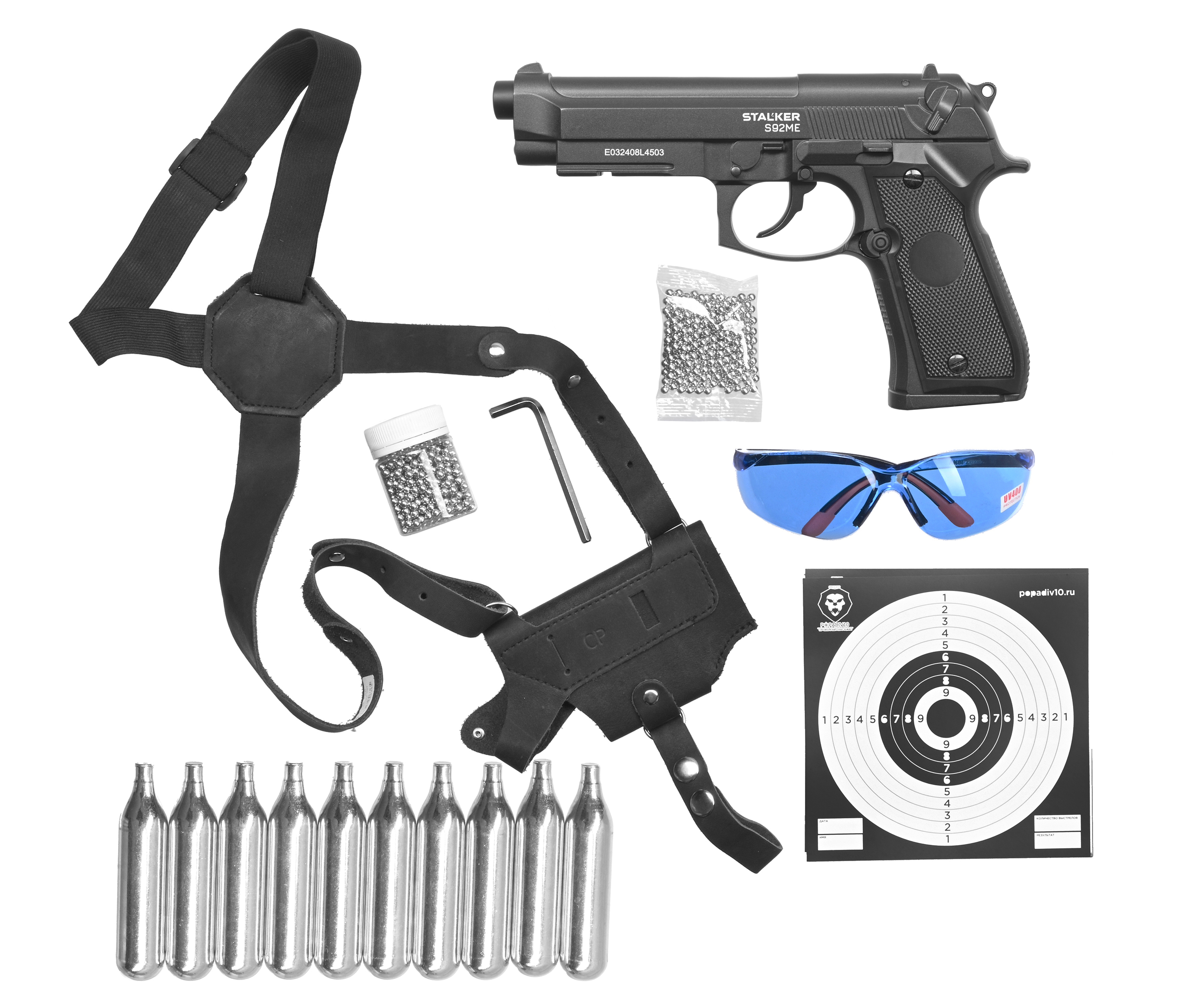 Пистолет пневматический Stalker S92ME 4.5 мм комплект Hunter подарочный №3 (Beretta 92, 10 баллонов, 500 шаров, 50 мишеней, очки, кобура) купить в интернет-магазине Popadiv10.