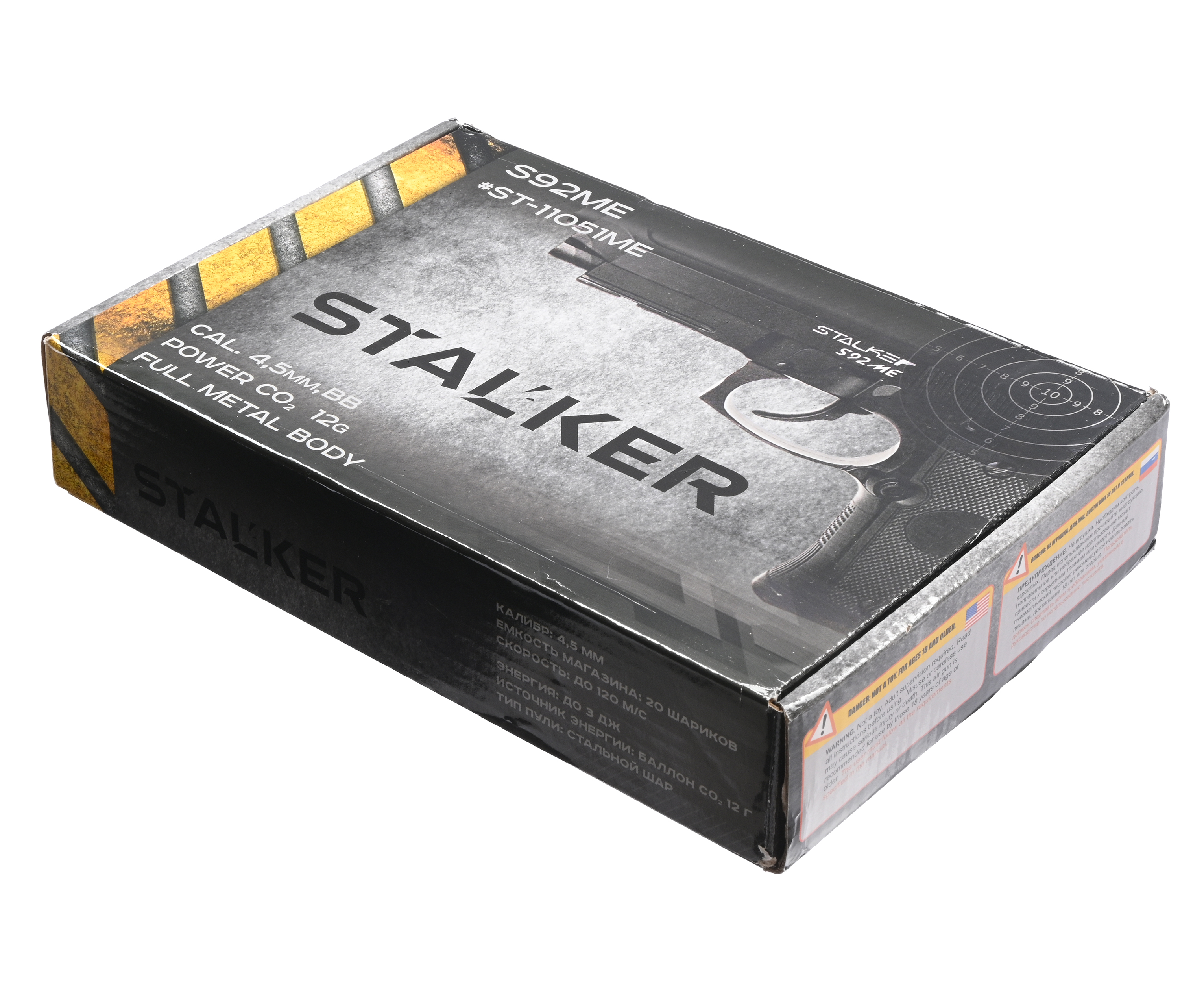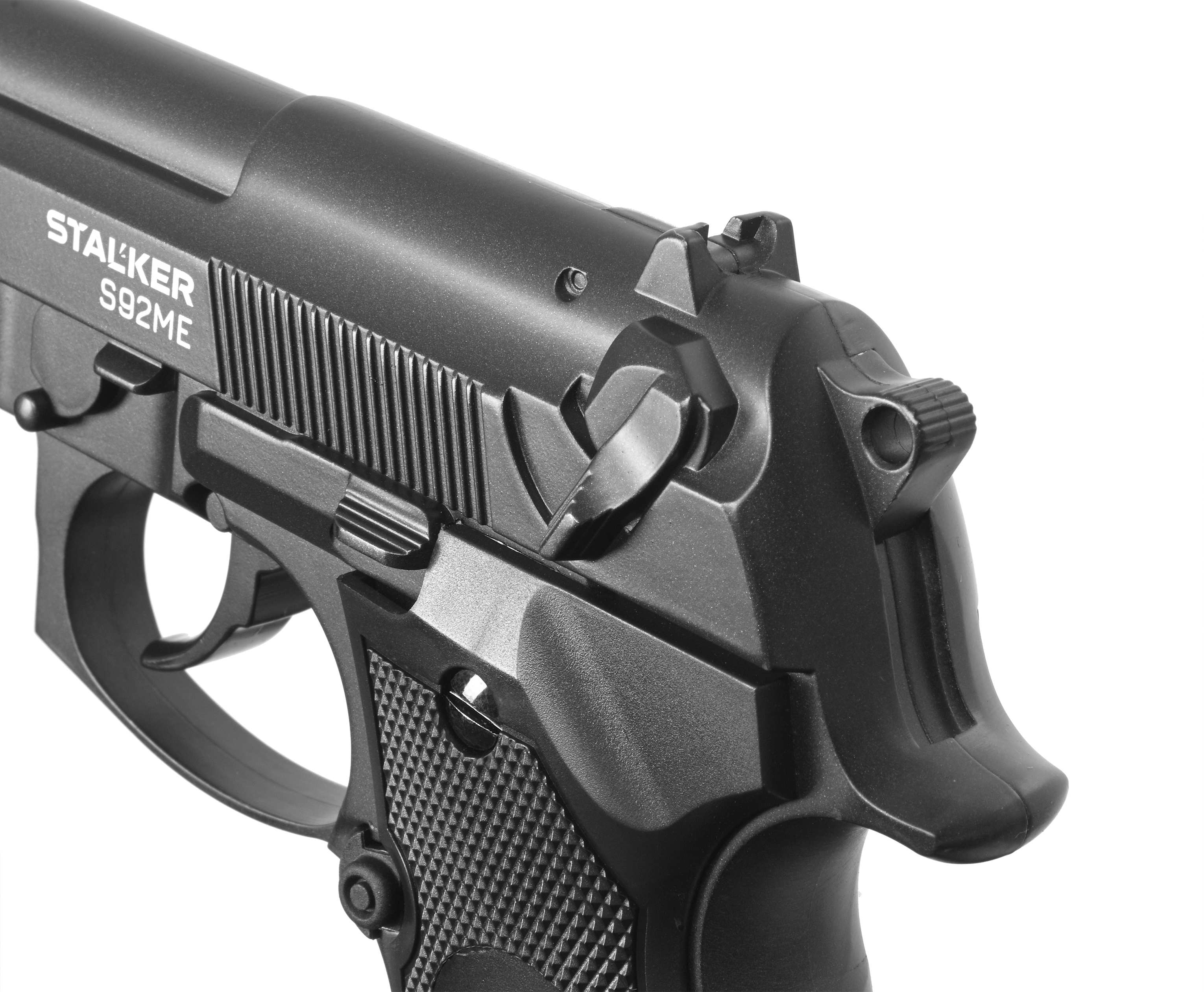 Пневматический пистолет Stalker S92ME снабдили гладким бланком. Ствол рассчитан на стрельбу сферическими пулями в калибре 4.5 мм. Боепитание организовано через 20-зарядный магазин, отмыкаемый боковой клавишей возле спусковой скобы.