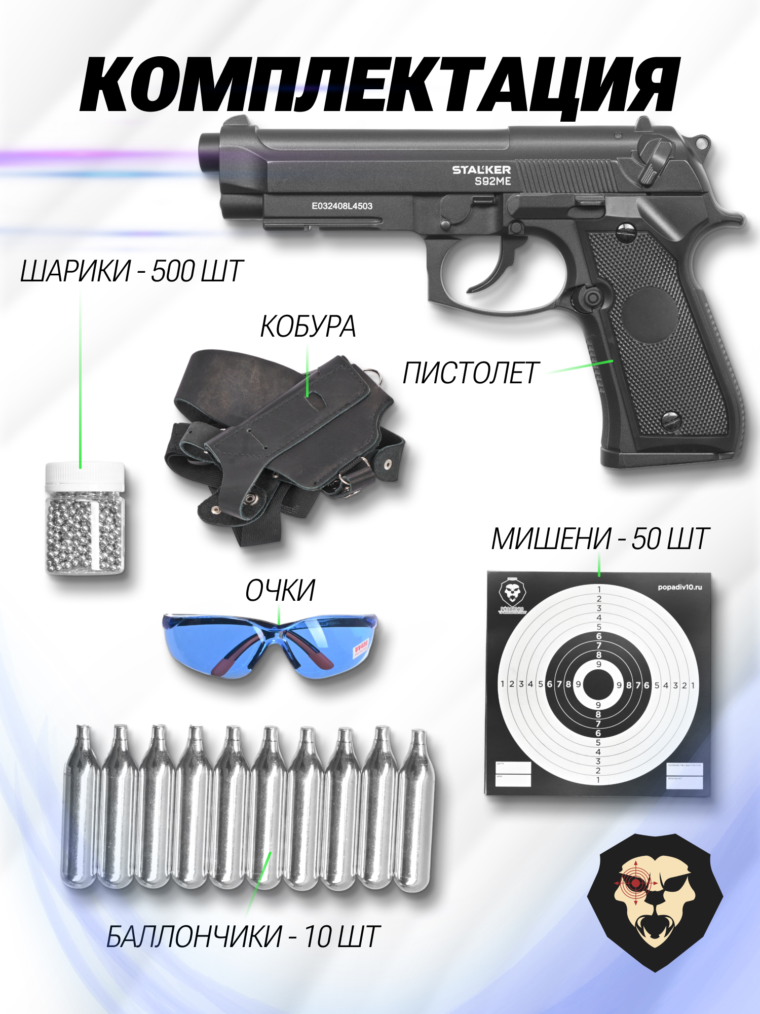 В обозреваемой конфигурации набор построен на газобаллонном пневматическом пистолете фирмы Stalker. Модель примечательна качеством исполнения и высокой надежностью, причем также порадует и детализацией. Образец выполнен по мотивам знаменитого итальянского оружия компании Beretta, пользующегося спросом по всему миру.