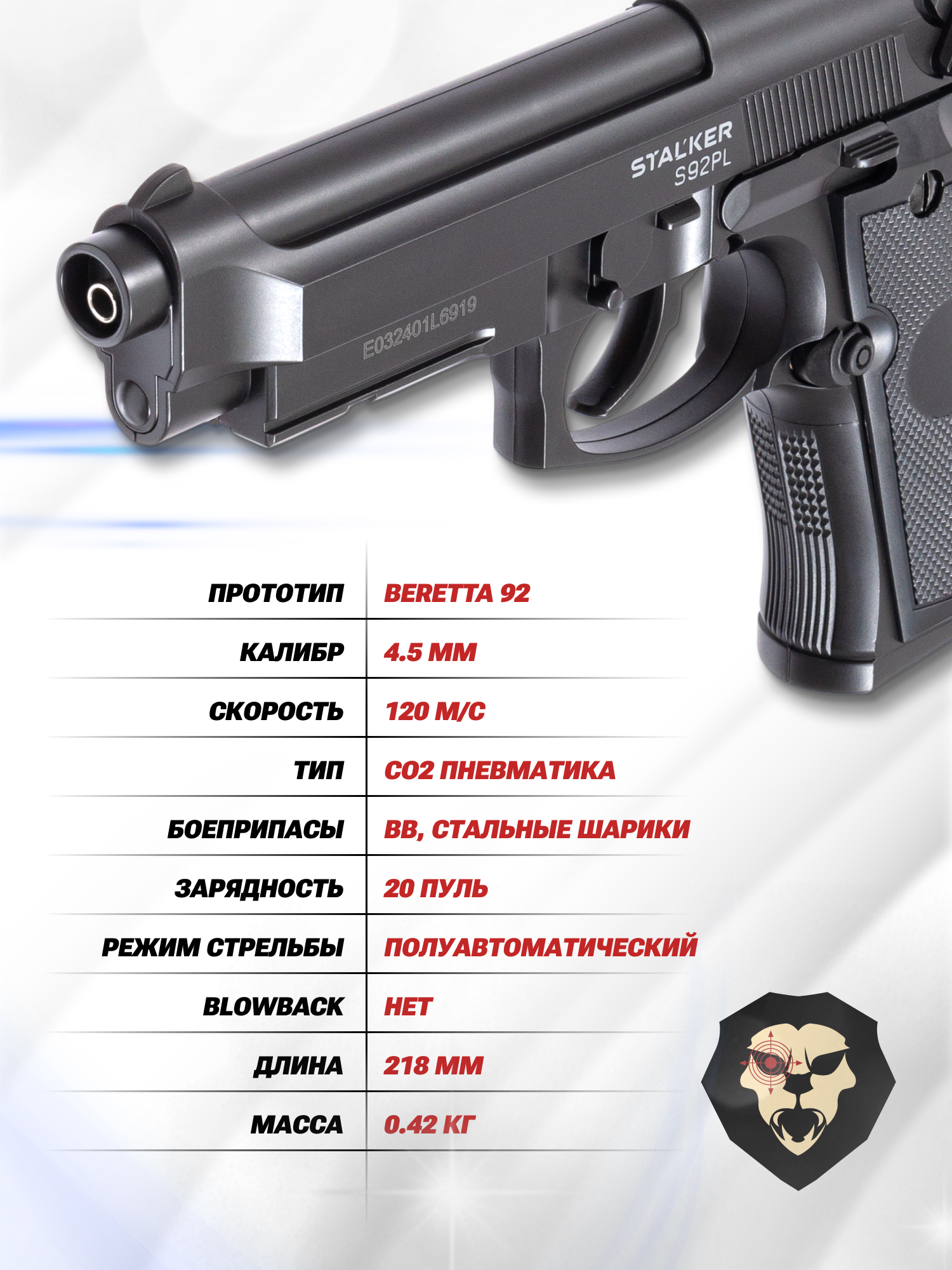 Компания Stalker специализируется на изготовлении пневматических пистолетов, главным достоинством которых является сочетание качества исполнения и стоимости. Так изделия бренда станут оптимальным выбором для новичка при ограниченном бюджете, причем ассортимент включает богатый выбор решений, созданных по мотивам популярных образцов короткоствольного оружия. Рассматриваемый экземпляр передает особенности итальянской Беретты.