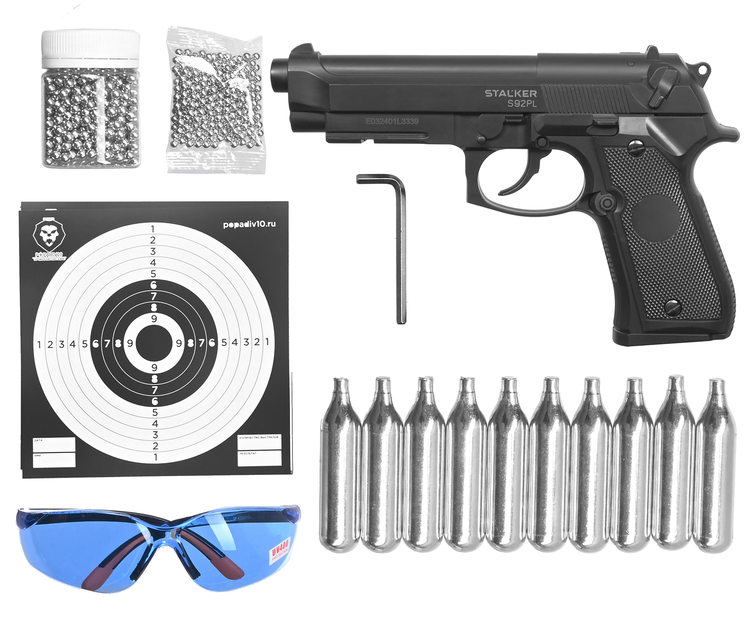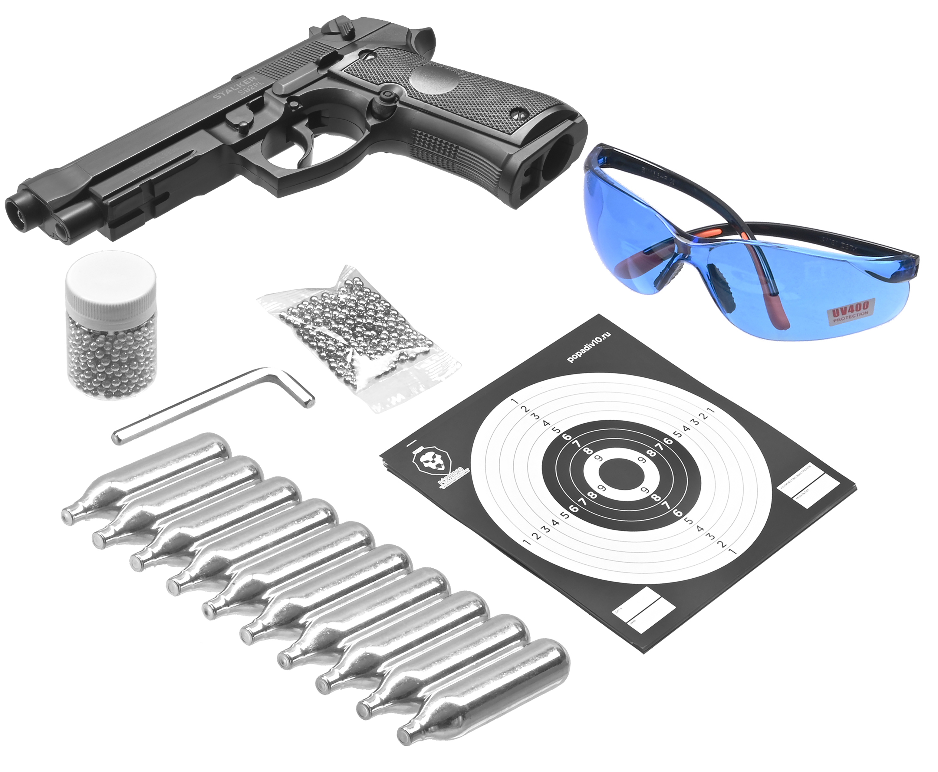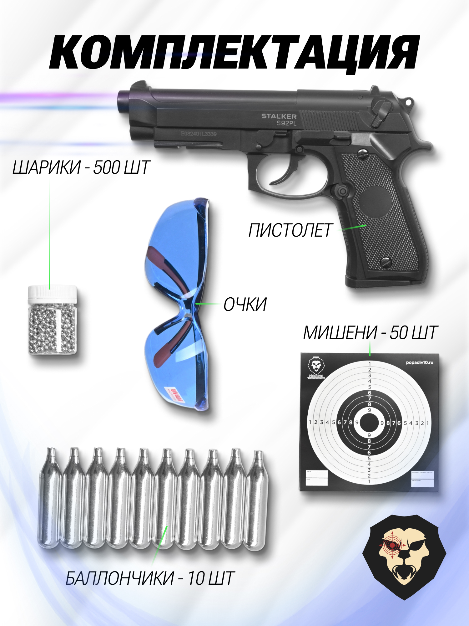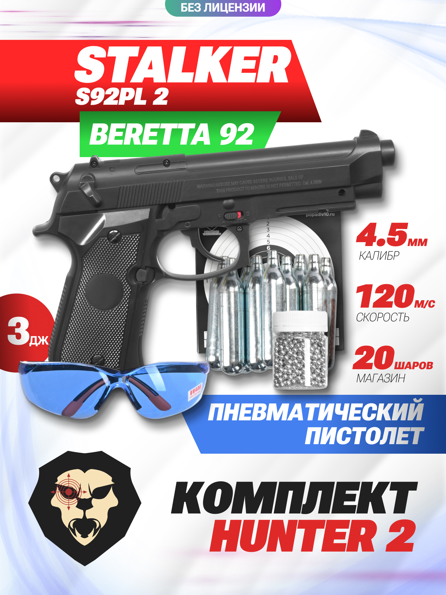 Пистолет пневматический Stalker S92PL 2 4.5 мм комплект Hunter подарочный №2 (Beretta M92, 10 баллонов, 500 шаров, 50 мишеней, очки) купить в интернет-магазине Popadiv10.